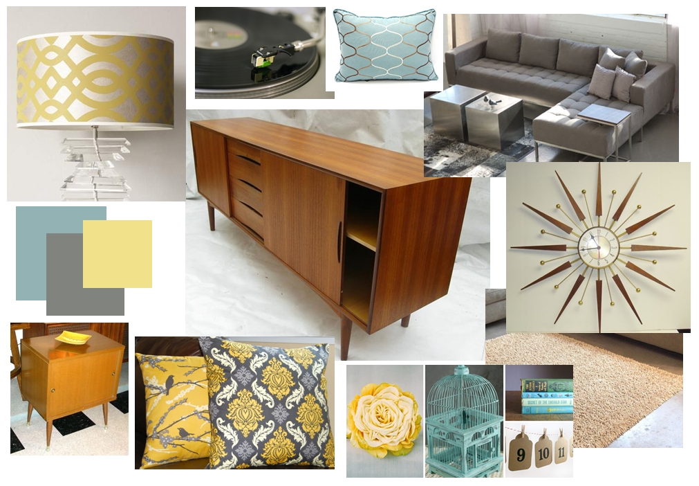 But it actually works beautifully with the yellow and slate in the pillows! If we toss in an extra throw pillow in the teal color, I think it’ll all come together. We were already planning on getting a slate-colored couch/sectional, so that will fit right in! And the other wood elements (like the record player stand, dream sideboard, coffee table and clock) will bring in the warmth factor. Loving it…
