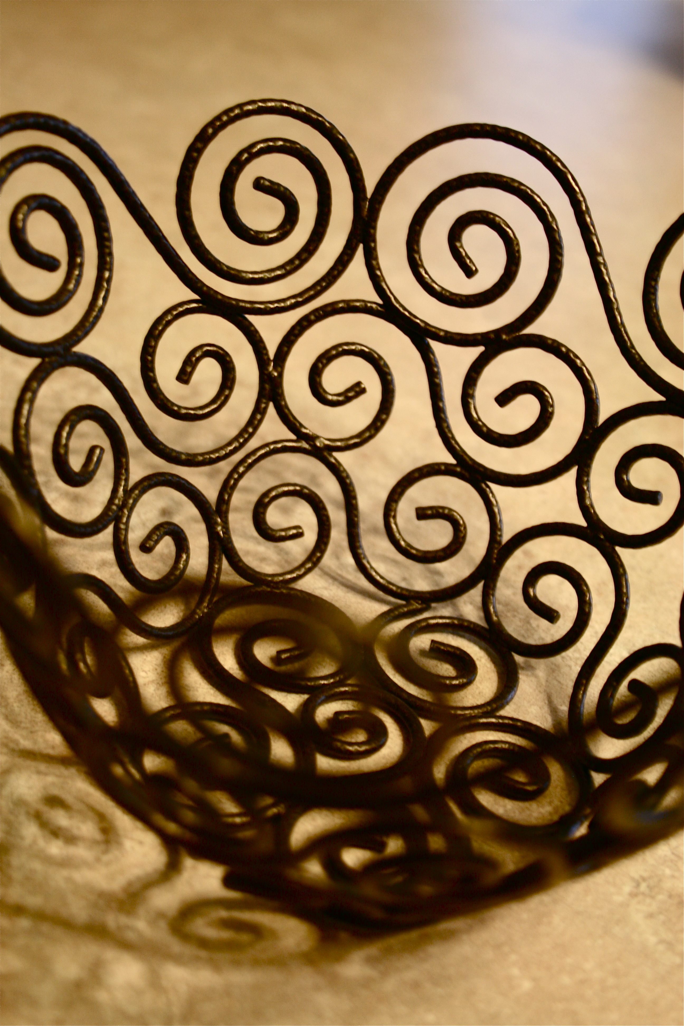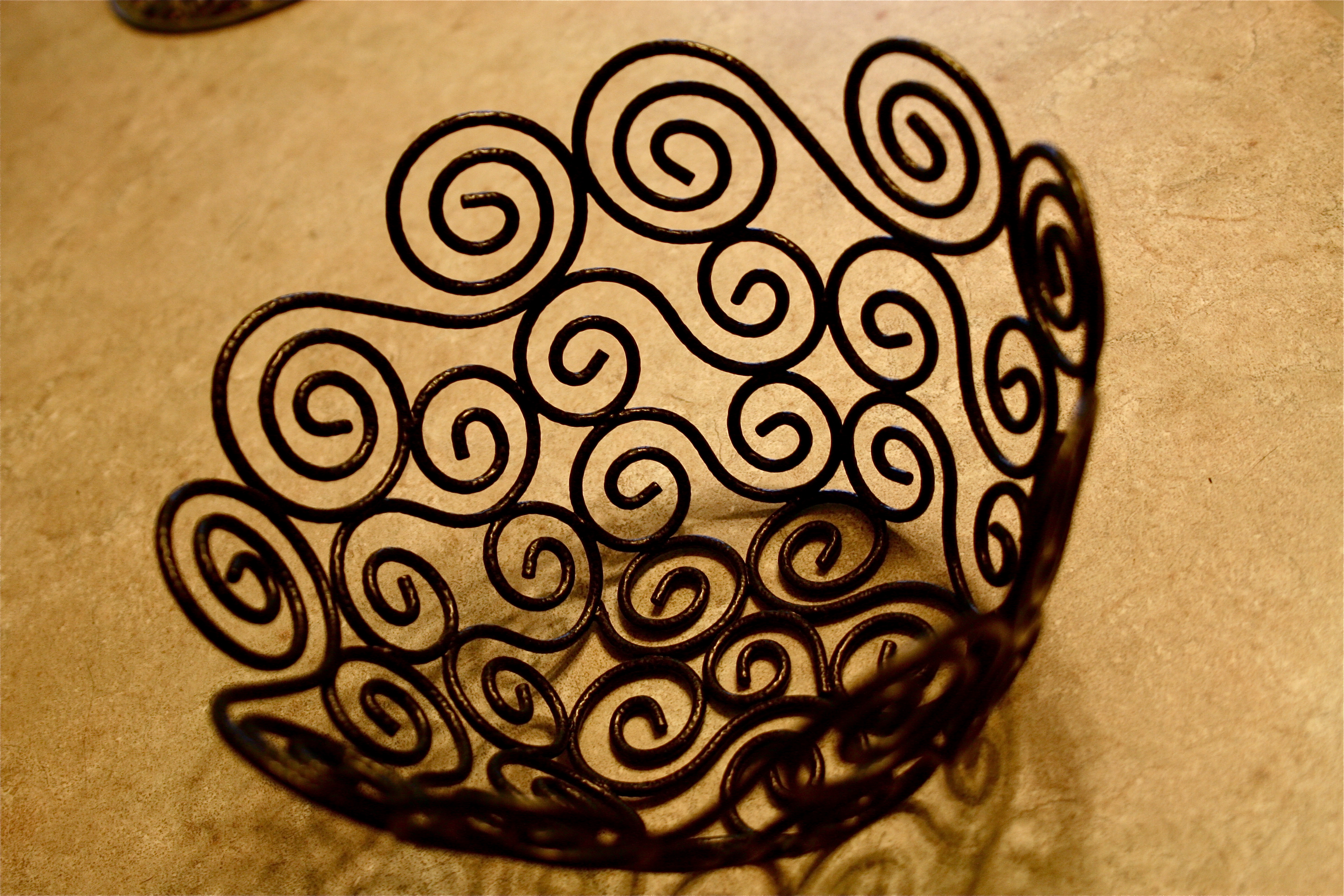 The swirly black bowl is now in the bathroom next to my sink. I think I’ll put cotton balls it – Anything I choose to put in the bowl has to be fairly large since something small would slip right through the wire “swirls”. I MAY even spray paint it too! What do you guys think?