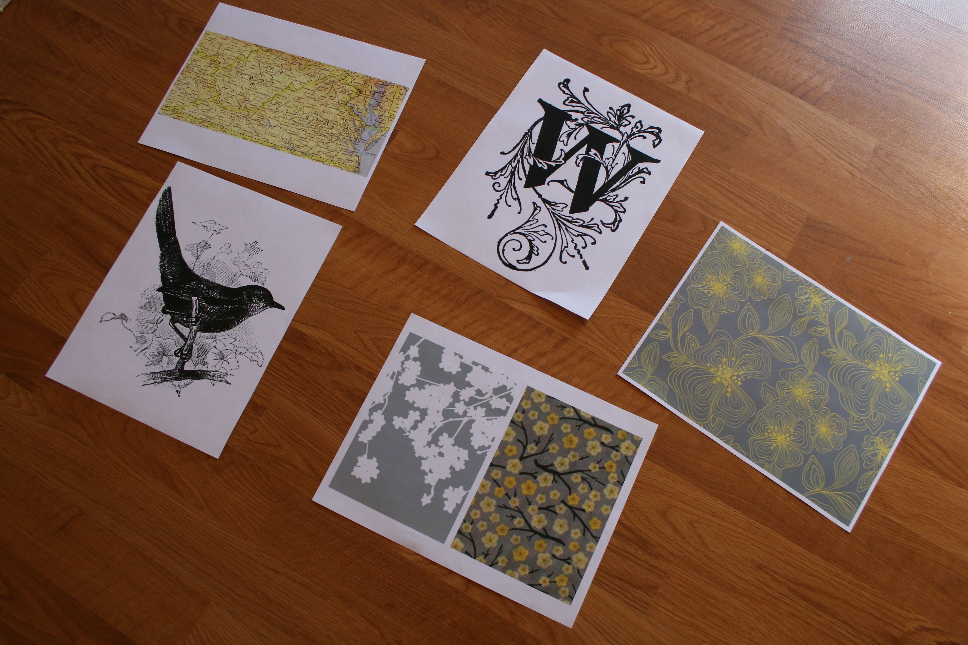 I wanted to do a pretty understated collection of prints for these frames – I didn’t want ALL of the attention on this space of the room since the rest of the living room is the main star of the first floor. So I decided to simply Google-Image some yellow and silver patterns along with a bird or two and the initial “W” (since both of our last names happen to start with the letter).
