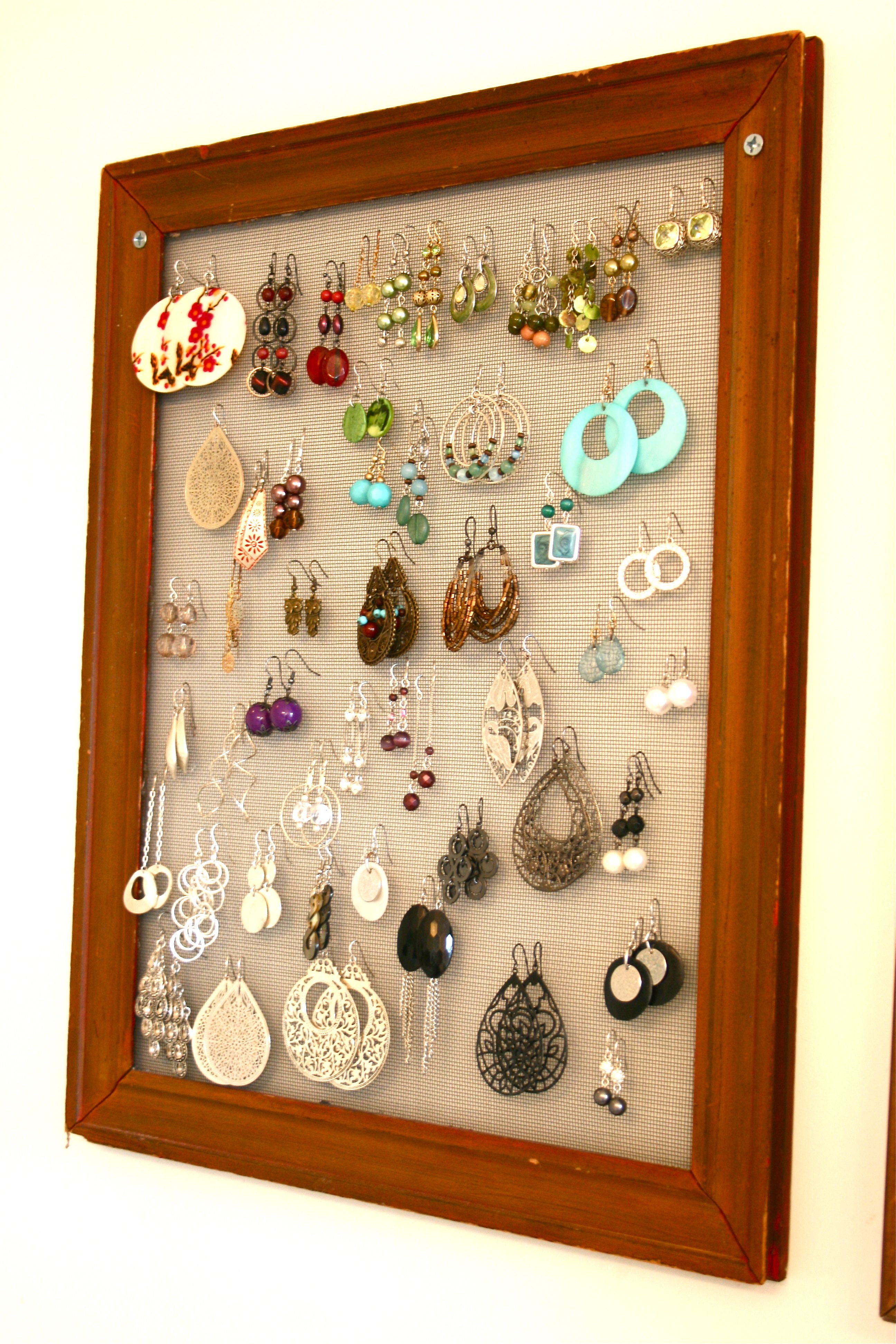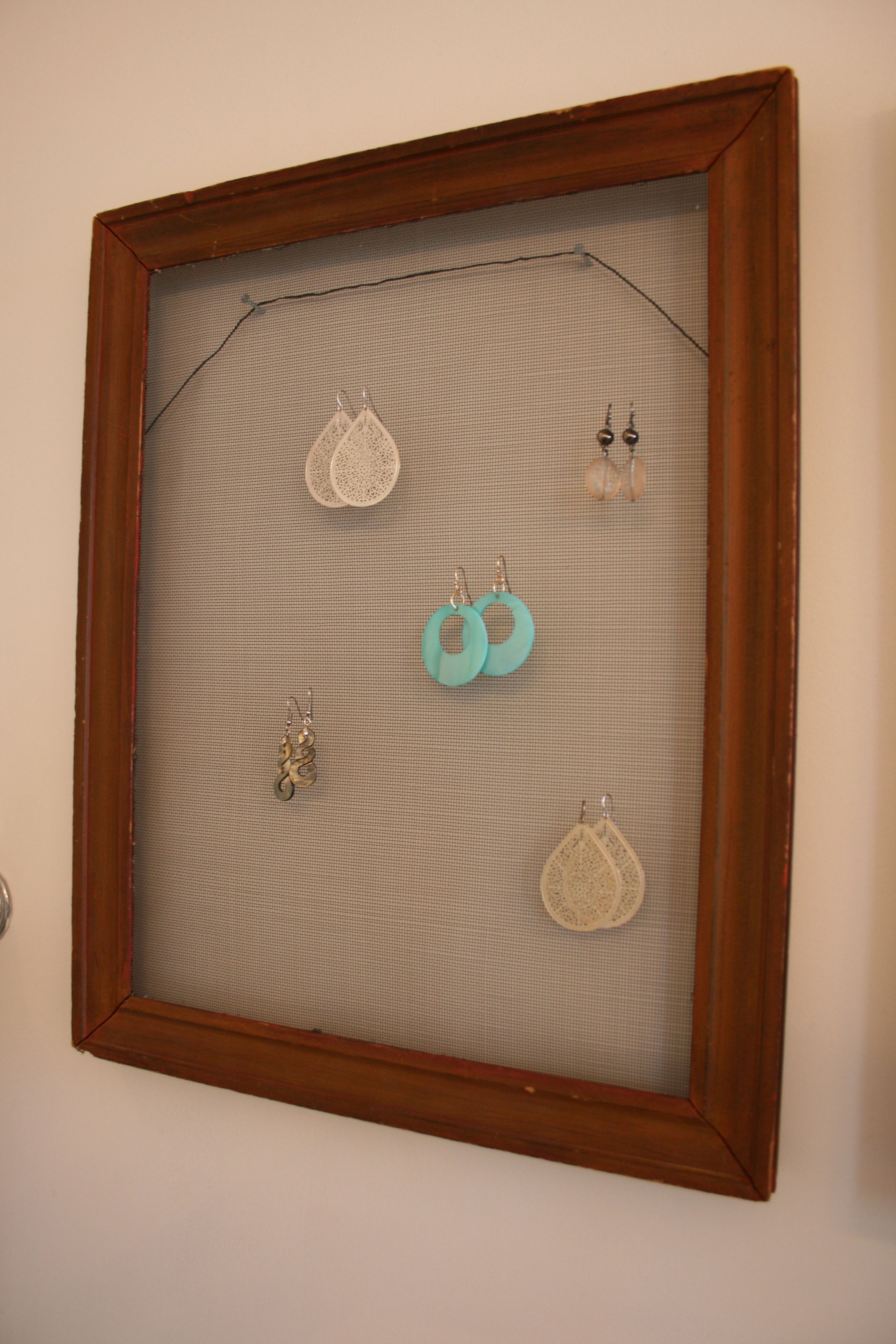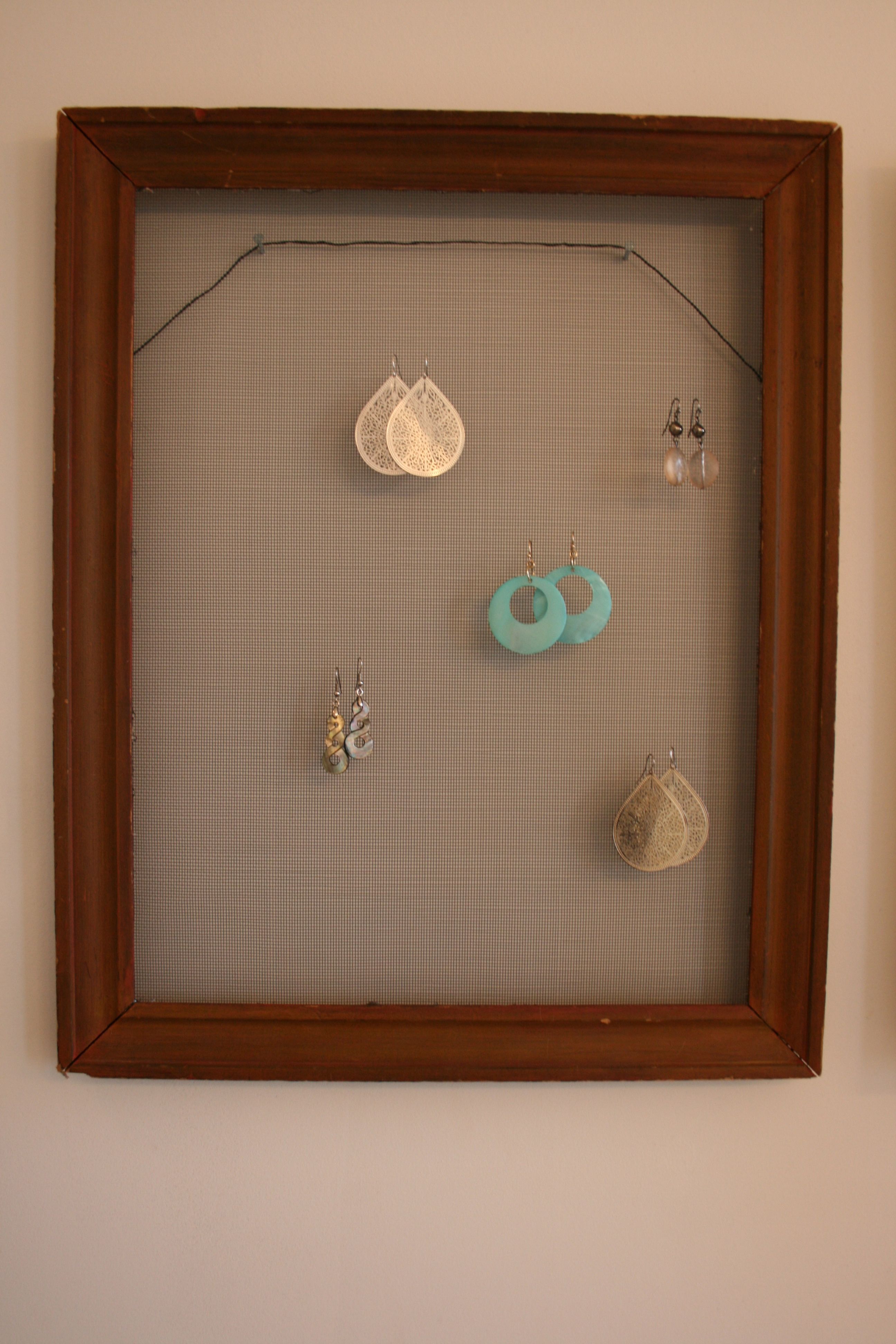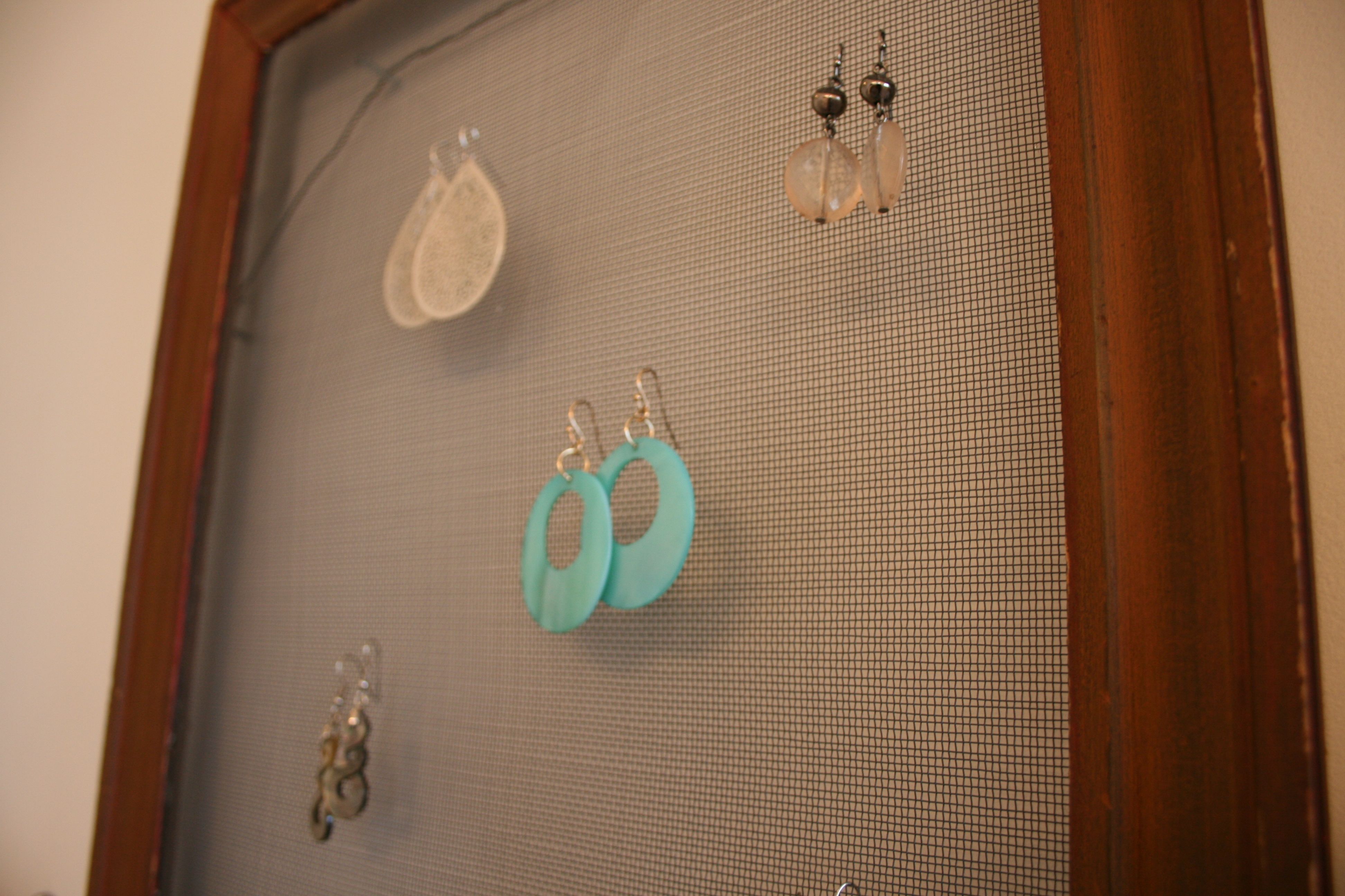 Not so sure about the black hanging wire seen through the wire mesh though…I may switch it out for clear fishing line. Or I might just drill through the frame and screw it into the wall. Don’t really like the fact that I am going to constantly have to straighten it when I move the earrings around. I’ll keep you posted!