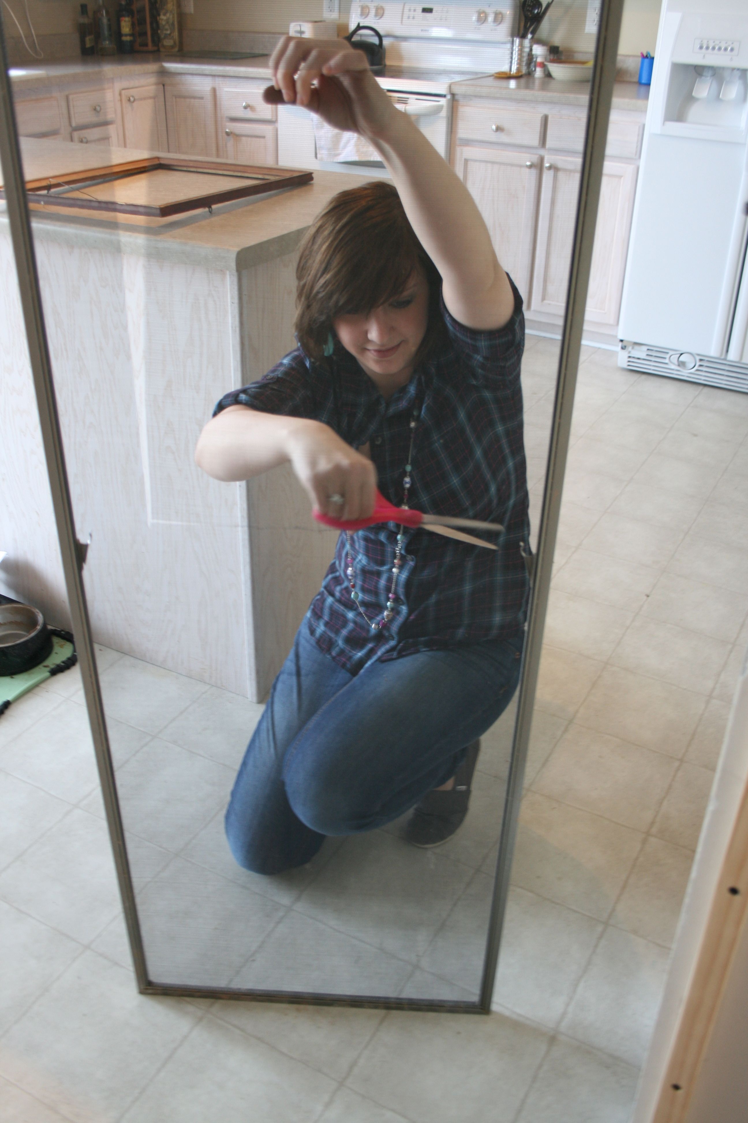 First thing I did was my always-scientific manner of getting measurements – i.e. stab the screen with scissors somewhere to start the cutting and then hold the frame up to the screen, eyeball it and start cutting out a rectangle about the size of the frame.