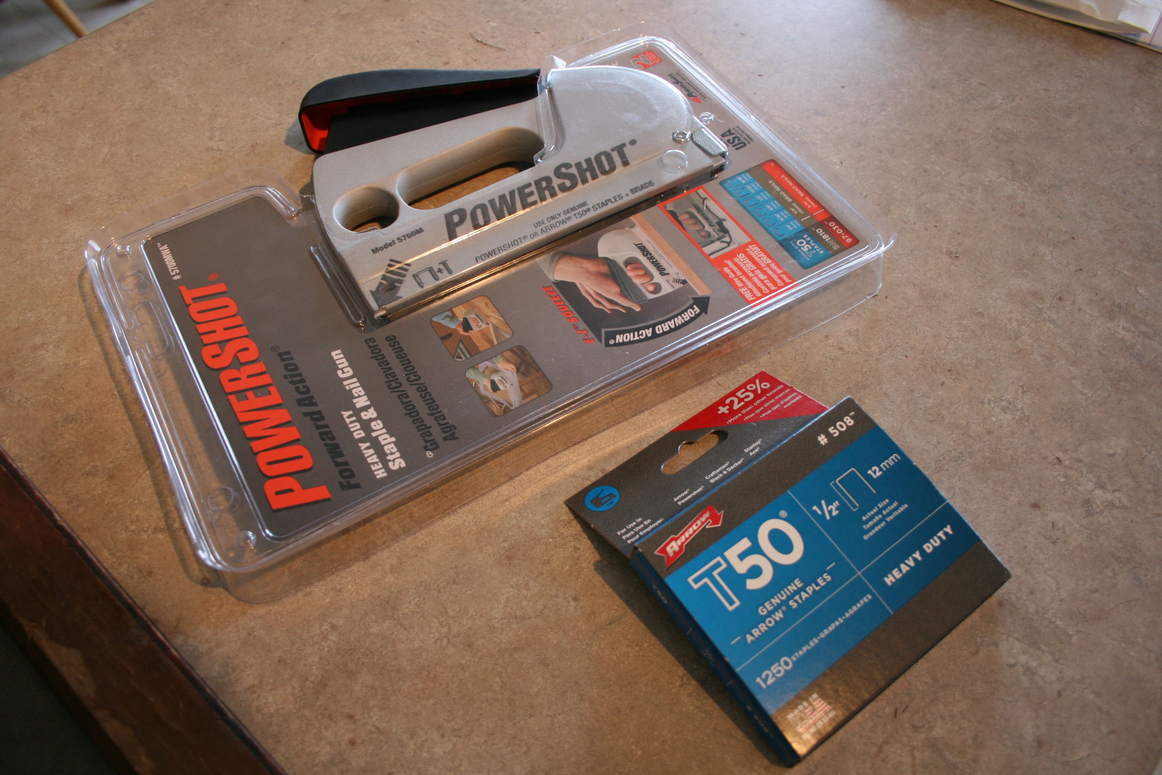 My mom’s going to be jealous when she sees this – I bought the kind where you push on the FRONT of the gun to fire the staple. I think she’s had the same issues that I have with the old kind where you push on the back to fire the staple out the front end. It’s frustrating having to try not to rear the staple gun back too far when you fire it so that the staple actually catches on the material.