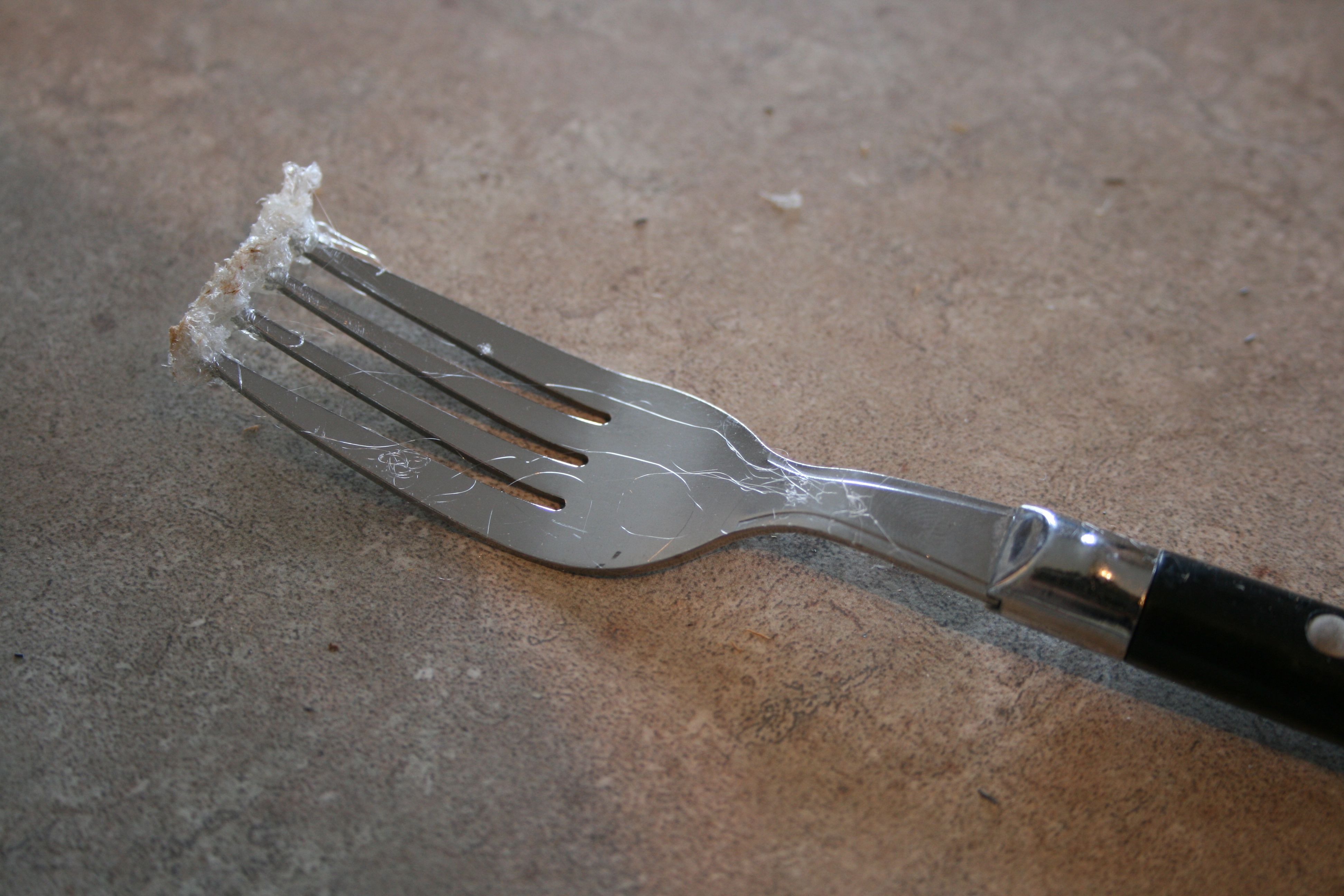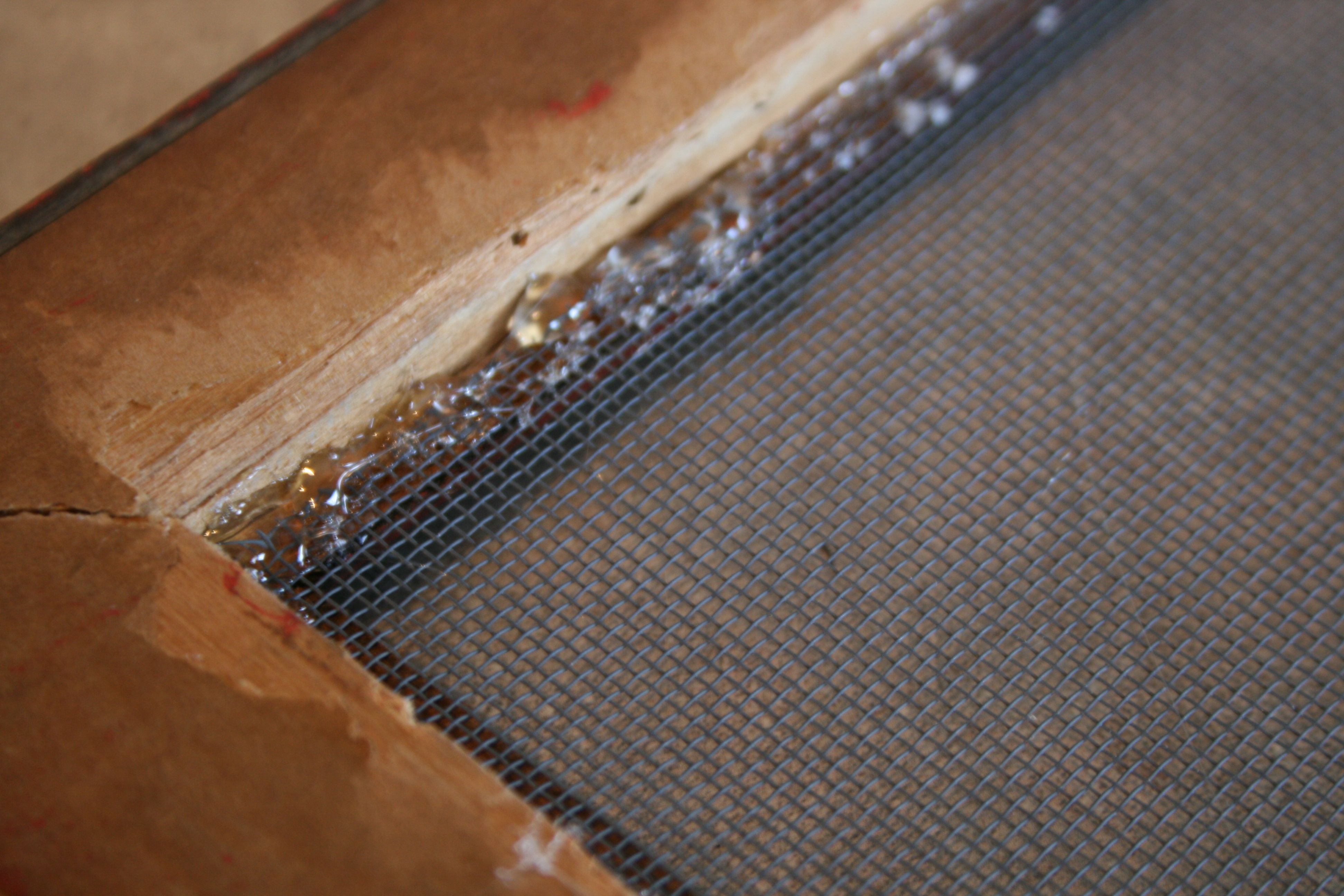 I lifted the edge of the screen mesh, put a line of glue down on the backing lip of the frame and pushed the mesh down into the too-warm-for fingertips glue using a fork.