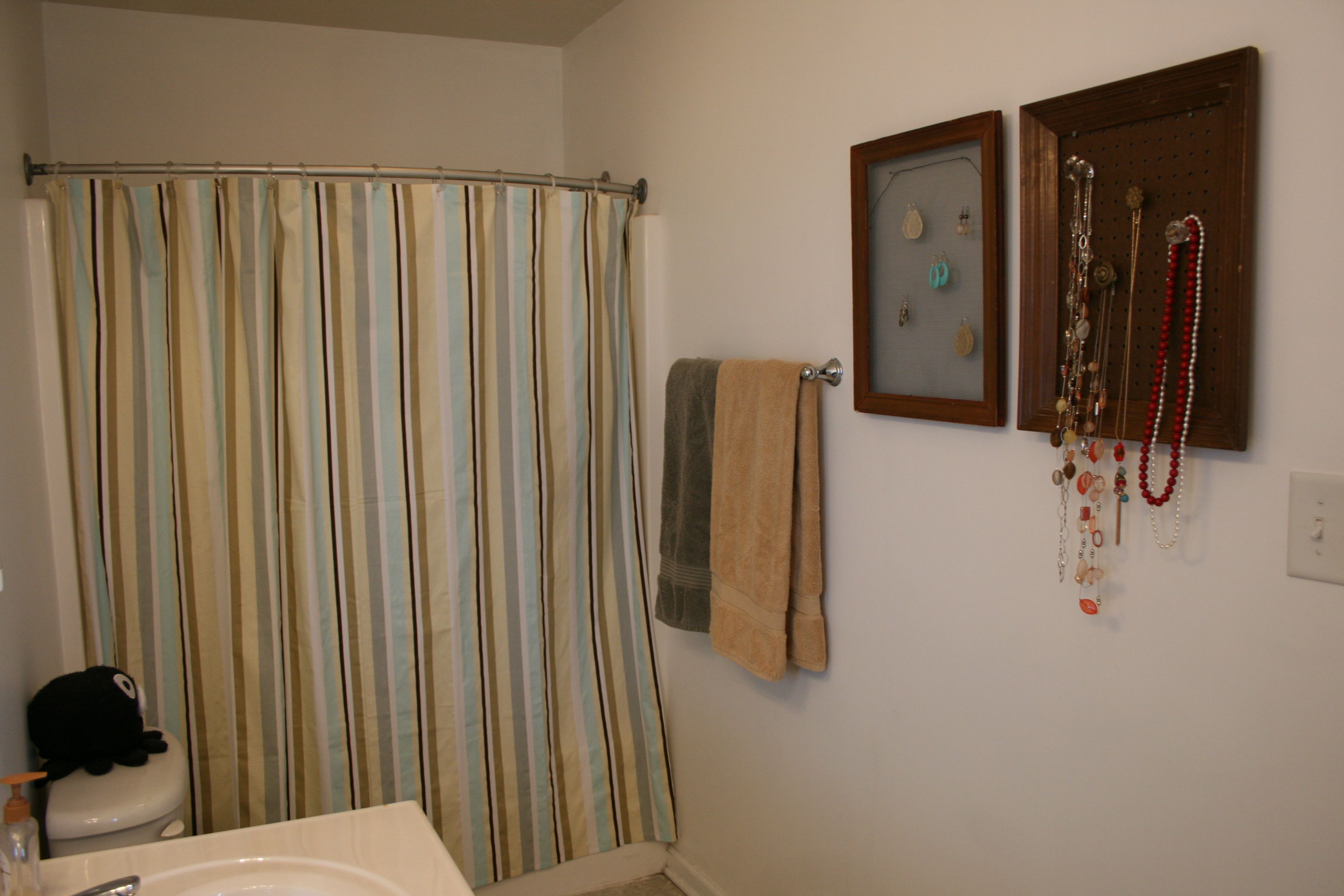 So up to the master bathroom we went! I decided to move the necklace-holding frame to the longer wall so that the two can be a pair. Miraculously, the frames were the EXACT same size – Still blows me away that that happened. It wasn’t intentional, but definitely a happy mistake.