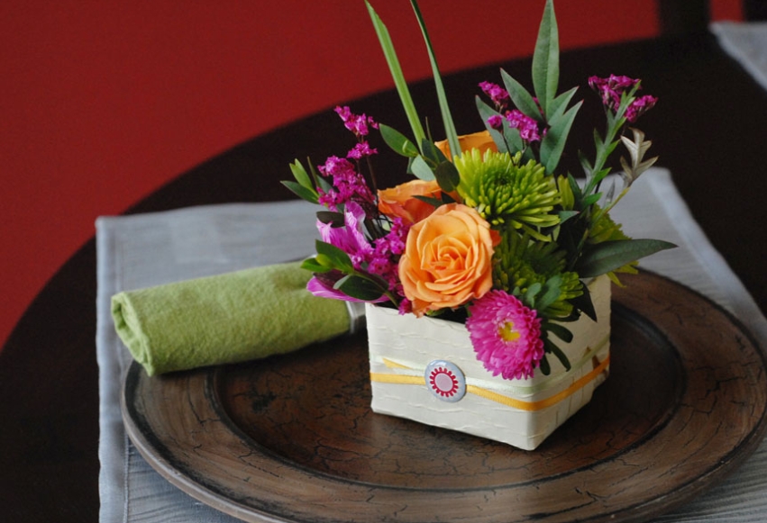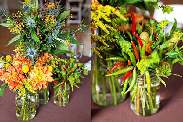 Want the color of flowers but also a little something different to set your arrangements apart? Try placing several mason jars in the center of your table and fill them with wild flowers, leafy herbs and vegetables. Bright red peppers still in a bunch on the stem are great for this because they hang over the side of the jar and give a great pop of color in an unexpected way. Herbs also give off a wonderful scent that flowers just can’t match.