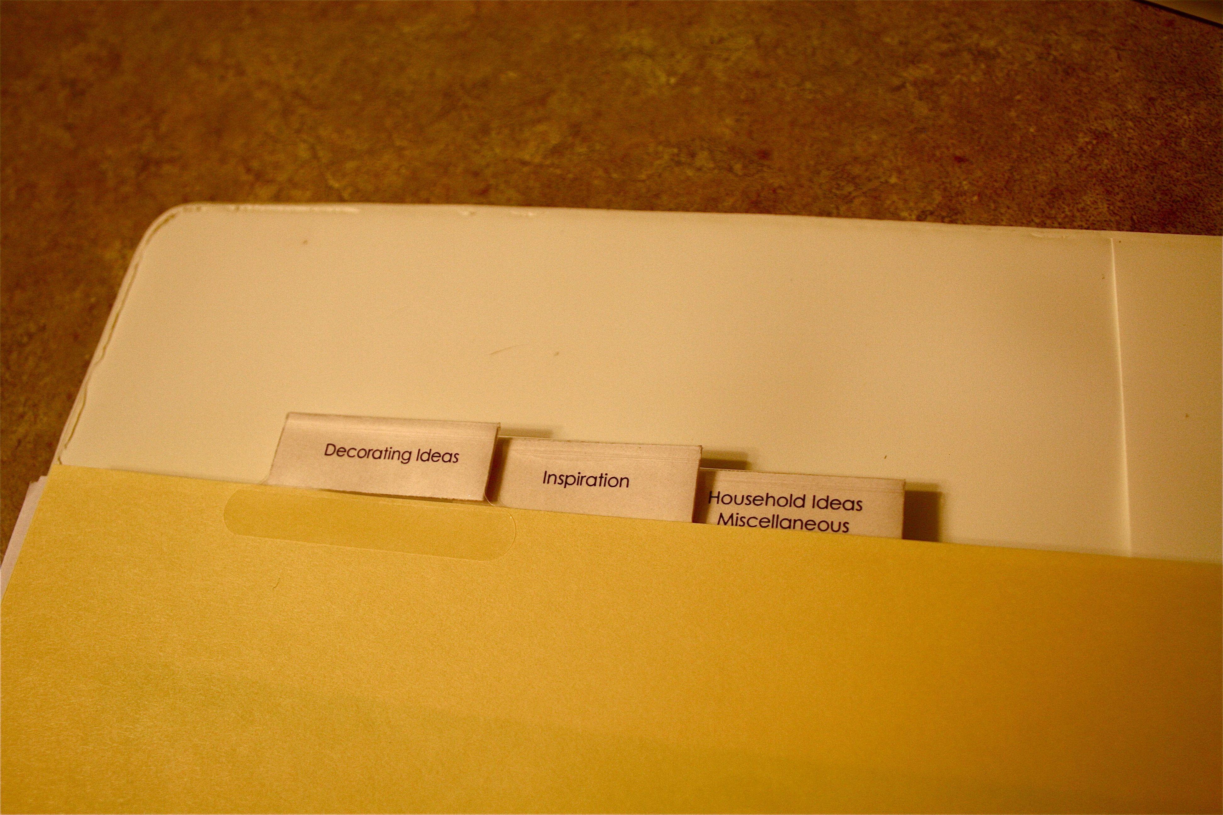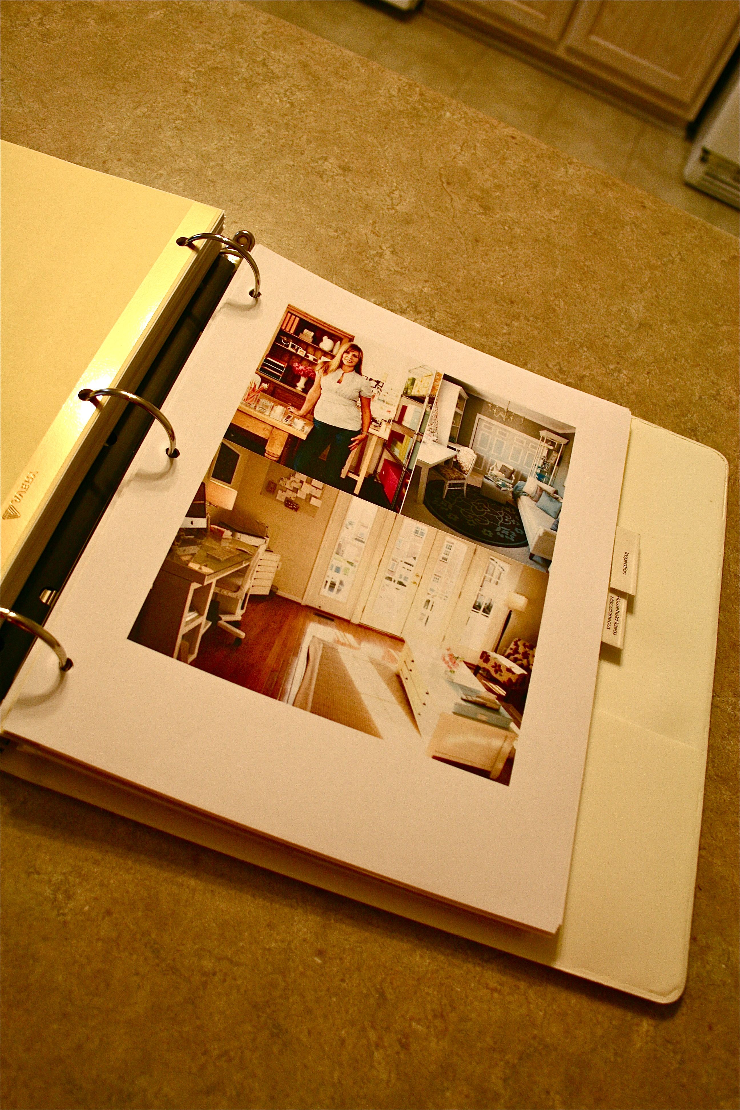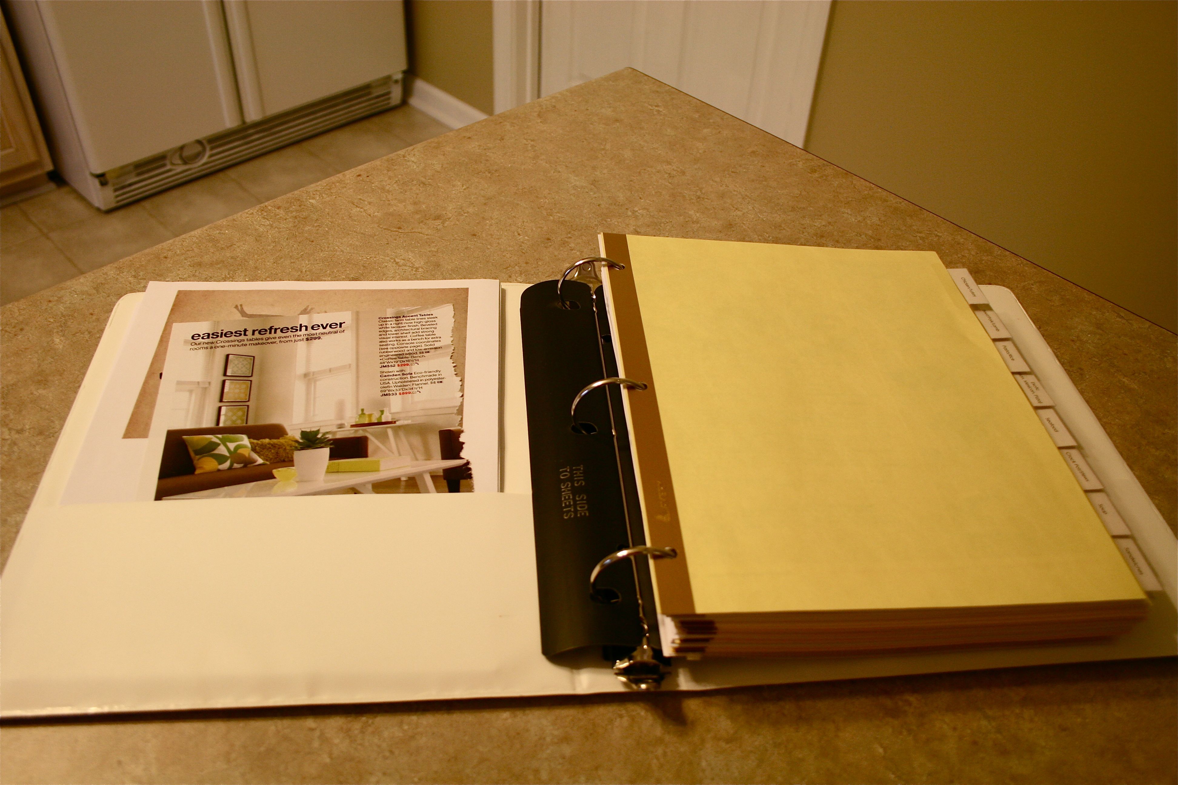 This is where I put tear sheets taken from catalogs and magazines (Crate a Barrel, Better Homes & Gardens, Do-It-Yourself, etc.) that I love or want to try out. It’s also where I put my “Inspiration Sheets”, which are essentially just Word documents that I keep saved to my desktop and, any time I come across an image I like on the internet, I copy/paste it to the digital document. When it’s full, I print it out in color, hole punch it and stick it in the “Everything Binder”!