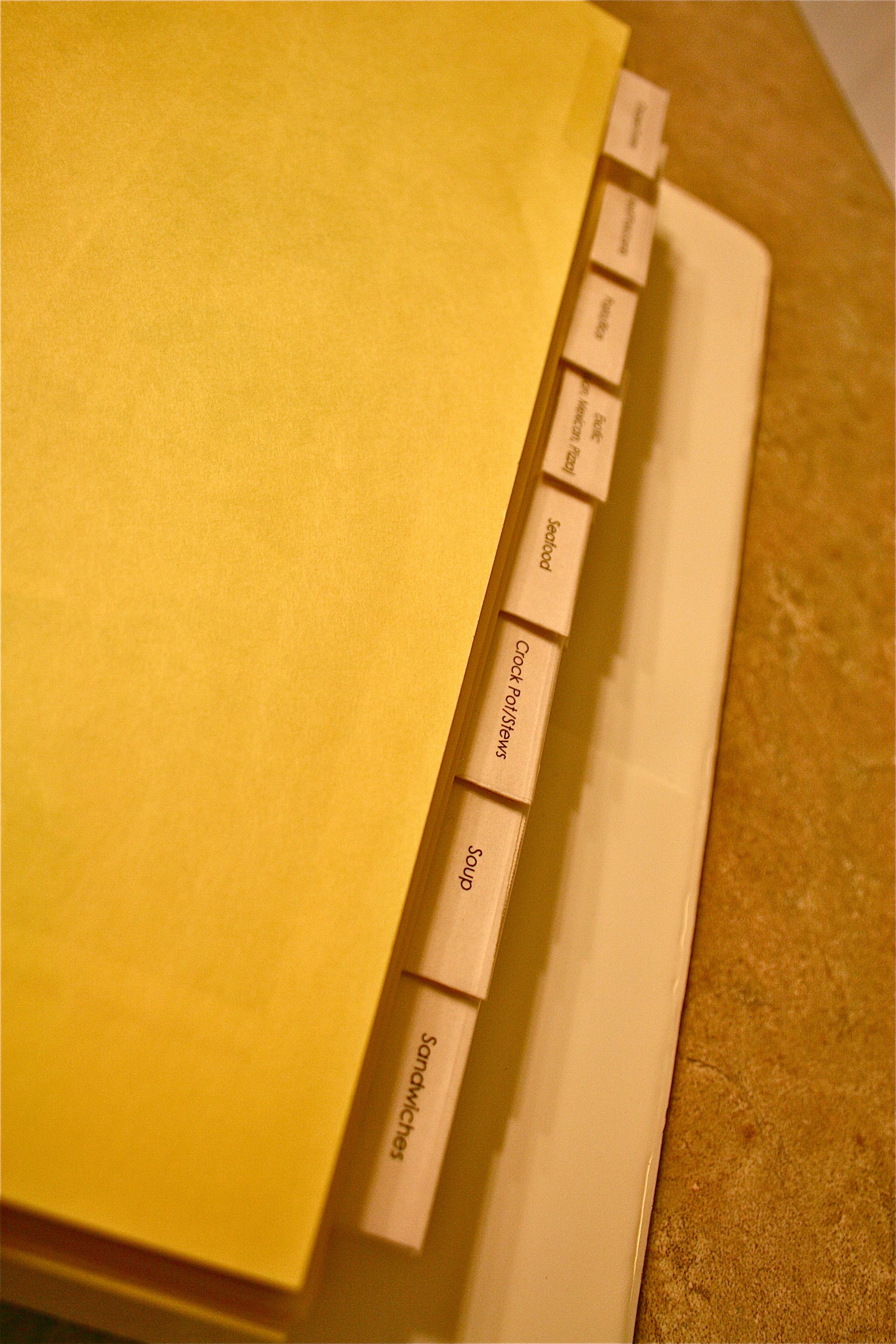 The binder begins, as you now know, with recipes and is broken down into something like 12 sections – chicken, beef, fondu, sandwiches, exotic (Asian, Mexican, etc.), soups, vegetarian/vegan (my sister is vegetarian), pasta, desserts, breakfasts, etc.