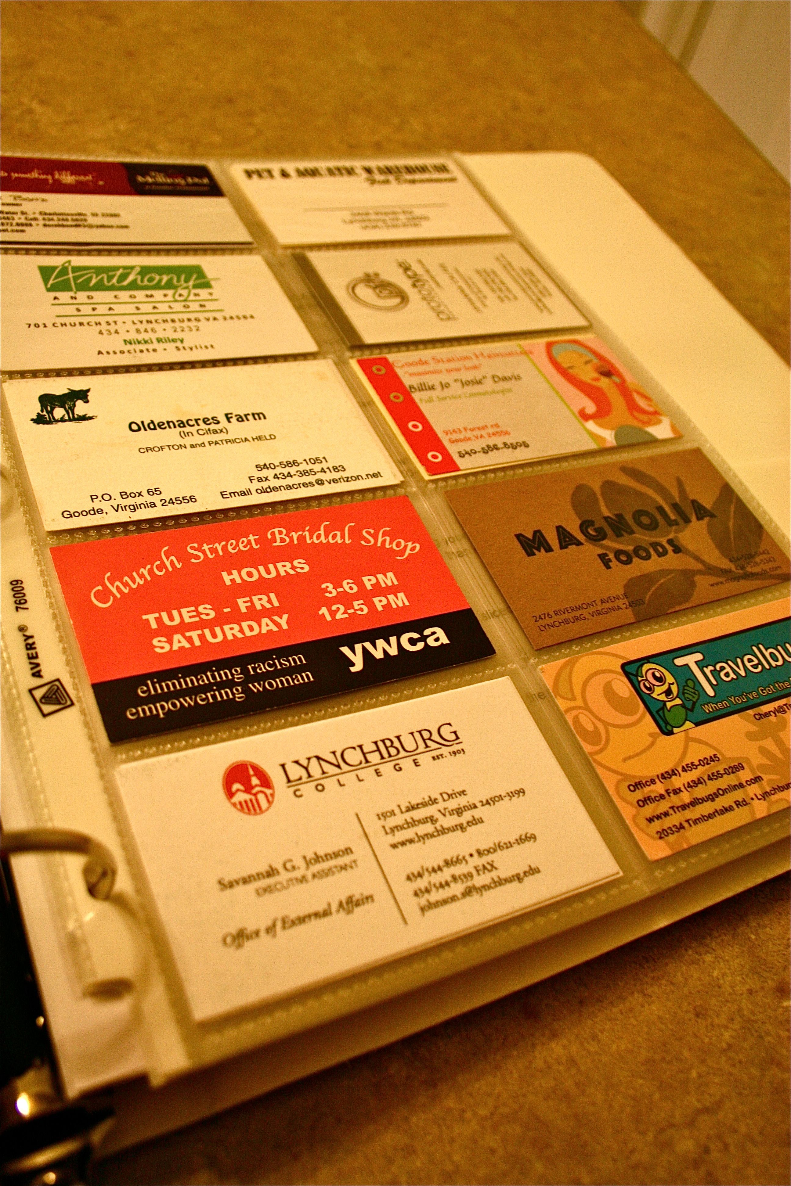 The last section we have to date is a place for business cards. My wallet was STUFFED with these little pieces of cardstock, so I’m happy that they now have their own special place. All it took was a $5 pack of clear hole punched sheets from Staples that have individual pockets sized to standard business card dimensions:
