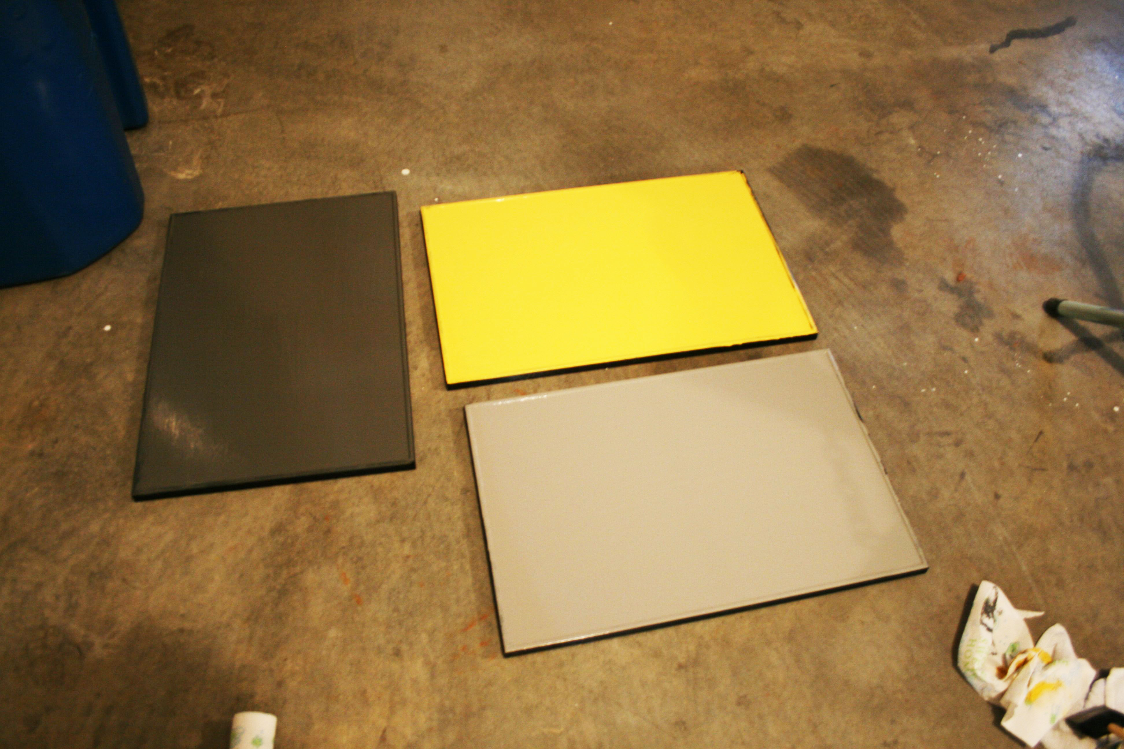 My dad recently gave me some framed posters from work that someone was going to throw away. My original plan was to paint the posters using our living room colors as inspiration – grey and yellow – and hang them in the living room on the big empty wall (seen below).