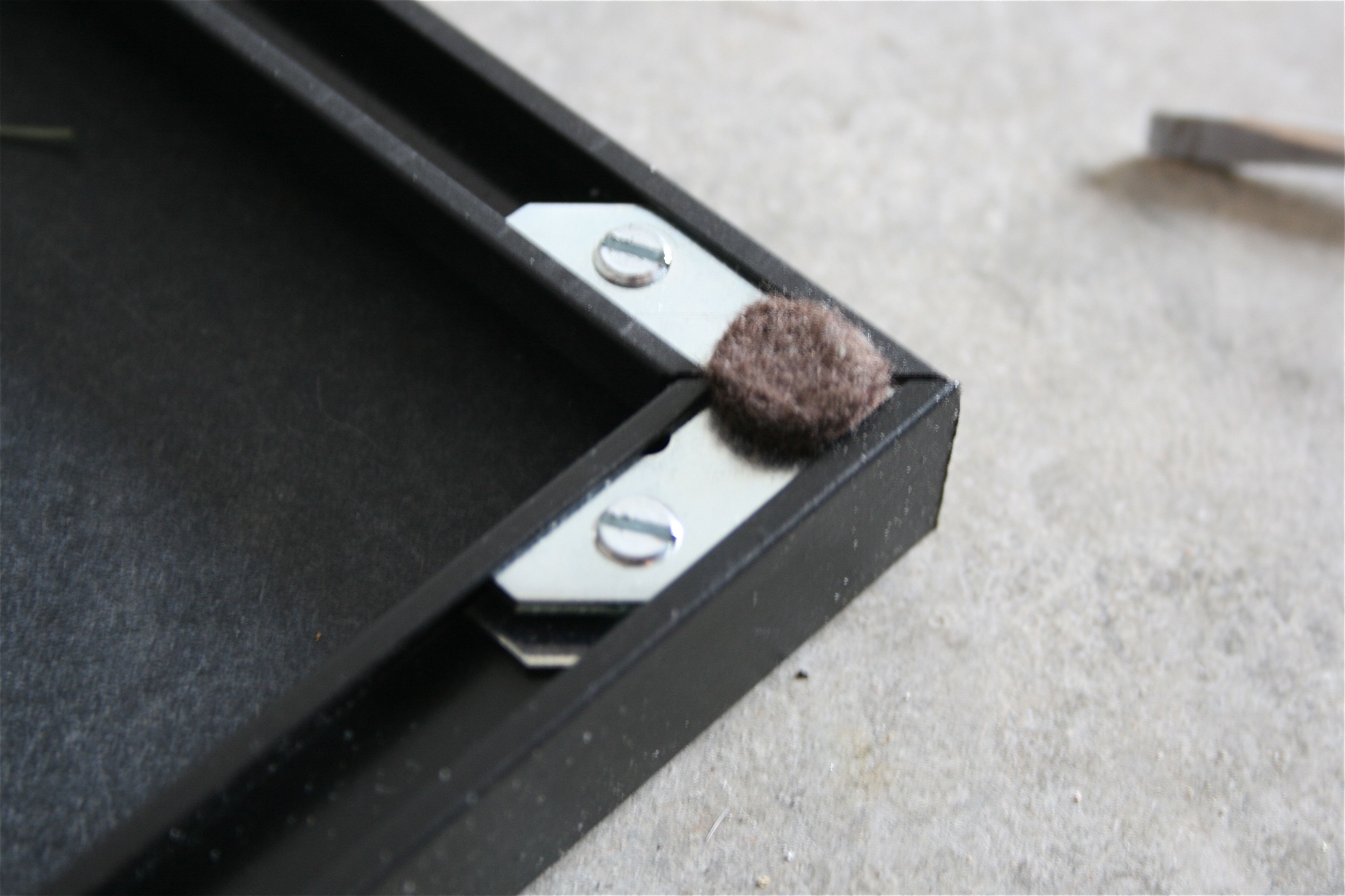 Now time for the connecting materials: the “L-shaped” metal pieces (with and without holes/felt) and screws.
