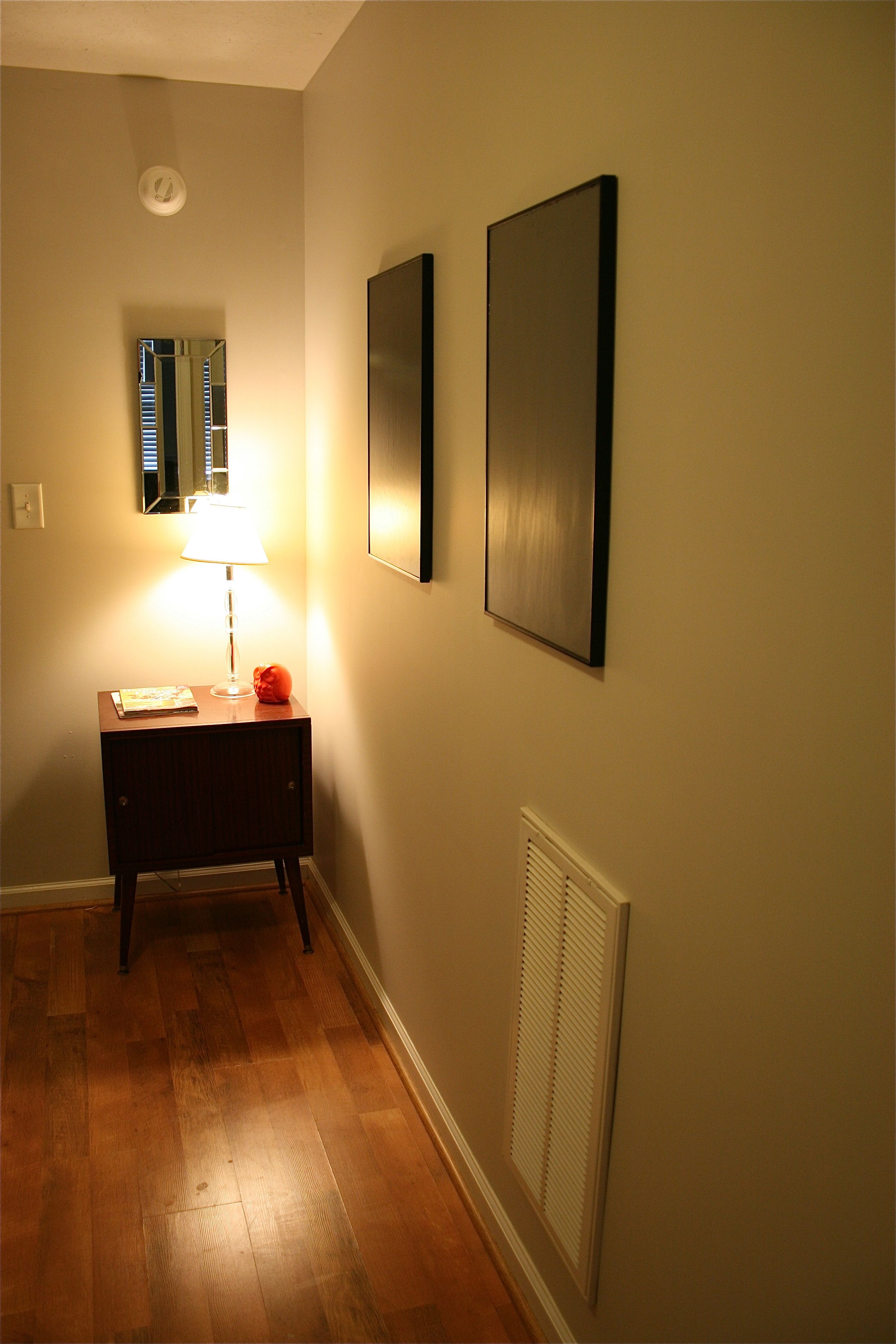 I’ll have to do some touch-ups to the paint (this time, I’m going to mask) but I think these two can be salvaged. In fact, we even put them up on the wall! However, they didn’t get their place of glory in the living room as planned…They made their home upstairs in the hallway.