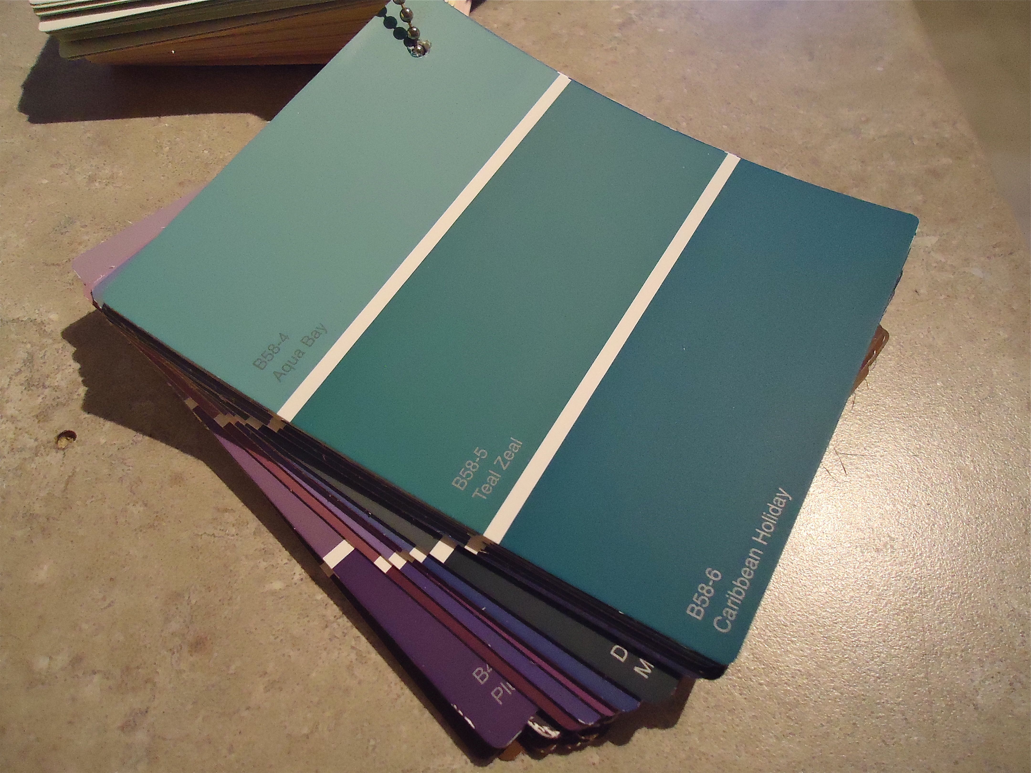 As you know from yesterday’s post, we went with a slightly insane paint color aptly called “Teal Zeal”. SUCH a rich and intense color – Something I’ve never played with before. It’s the middle color in the paint chip below:
