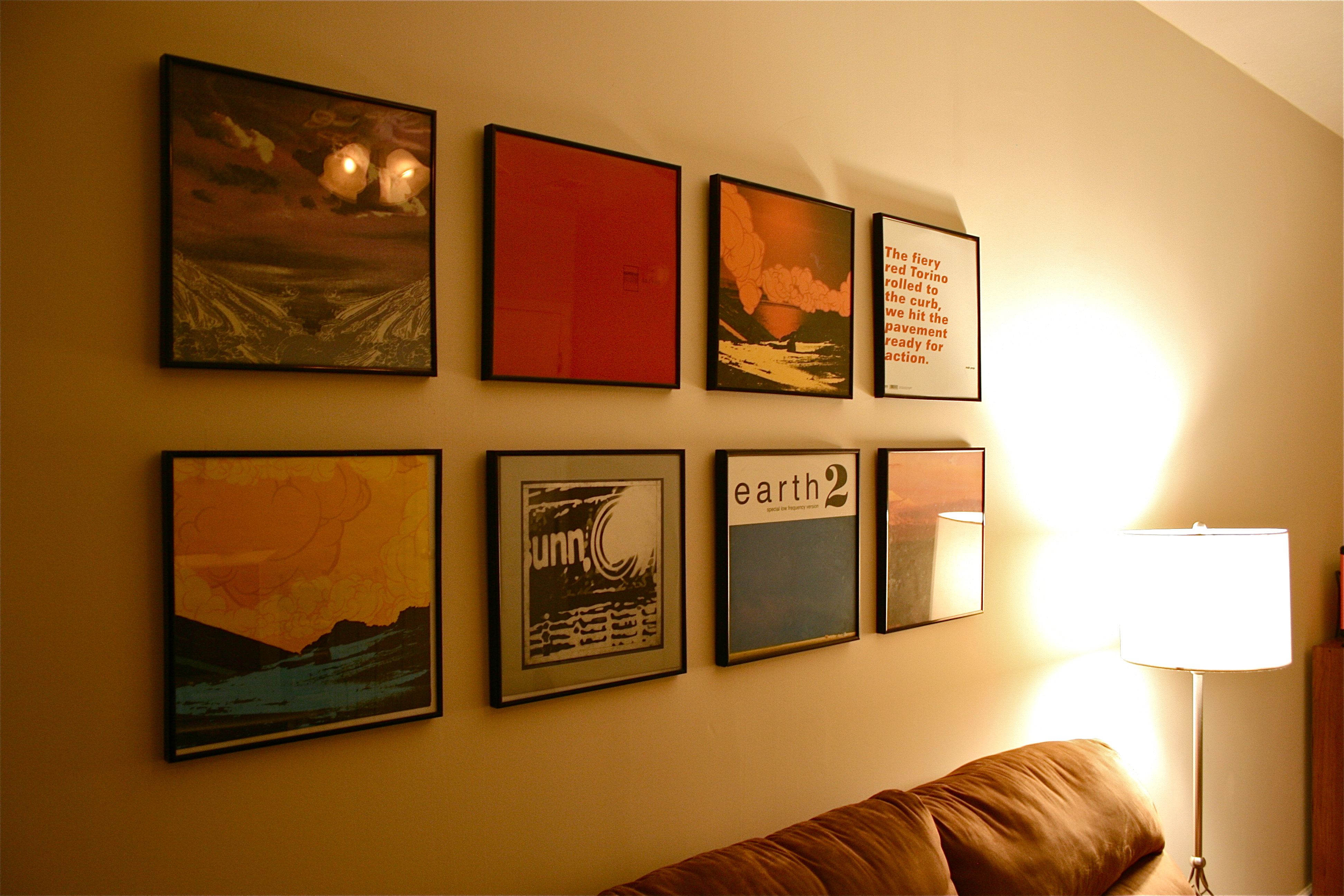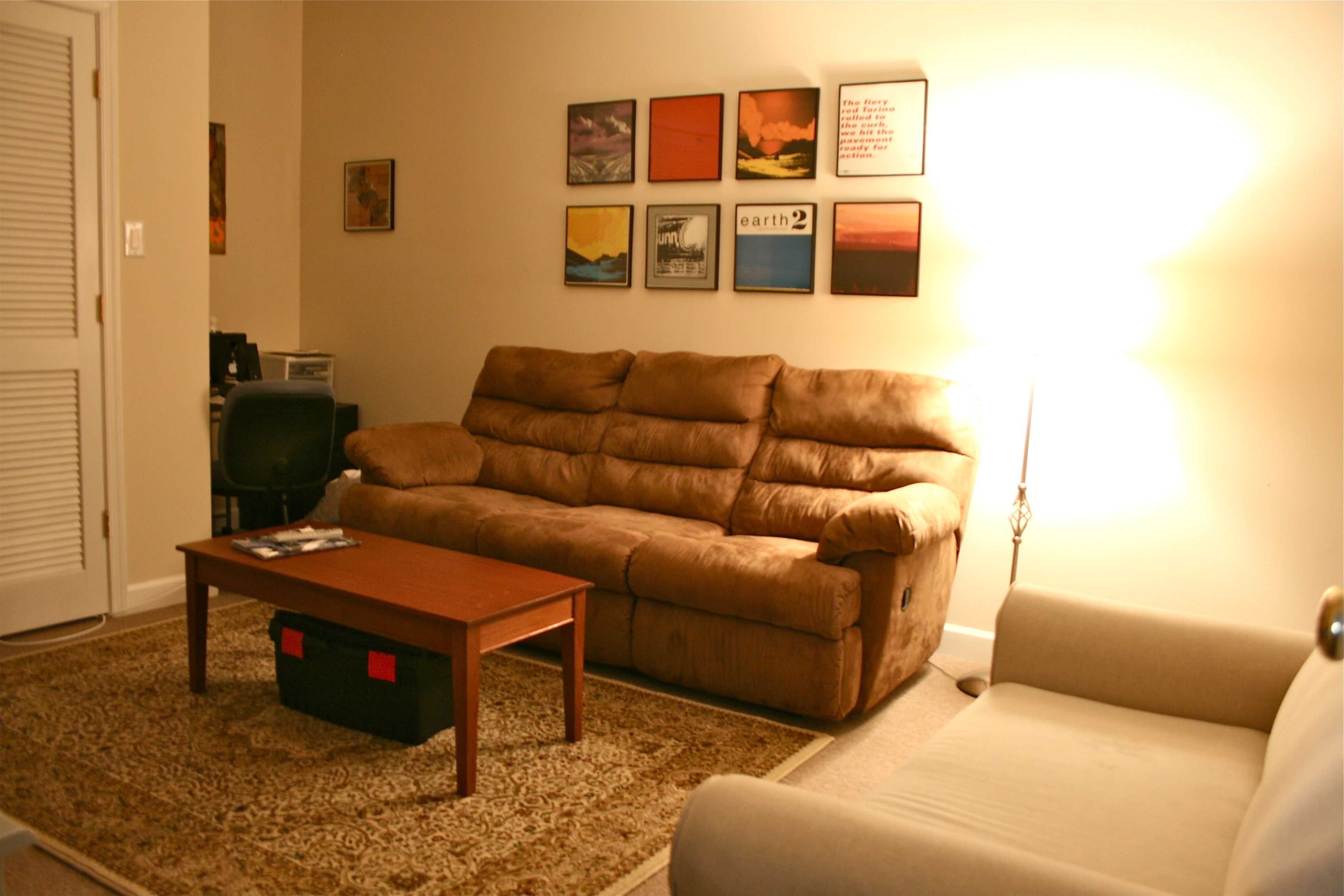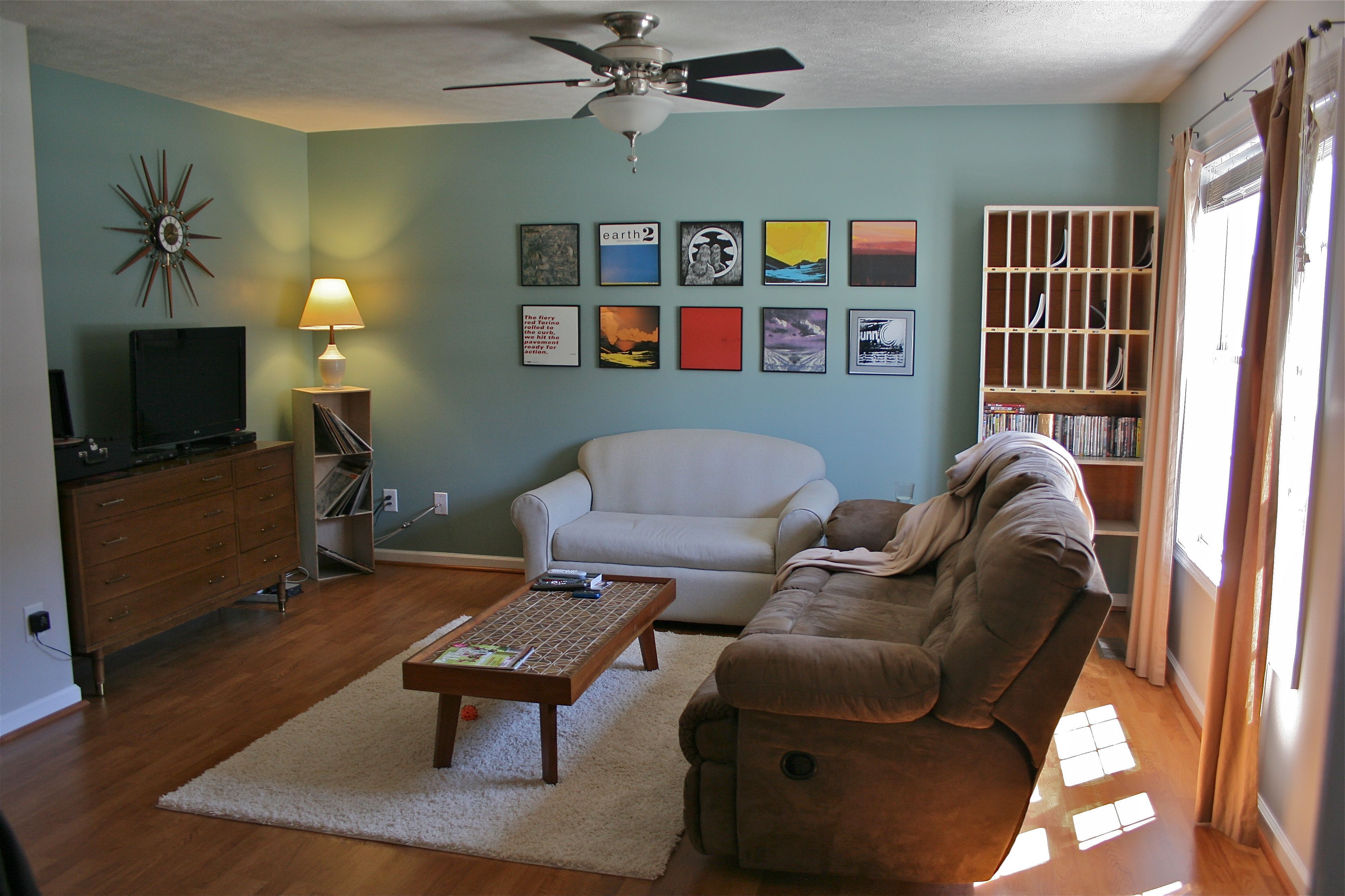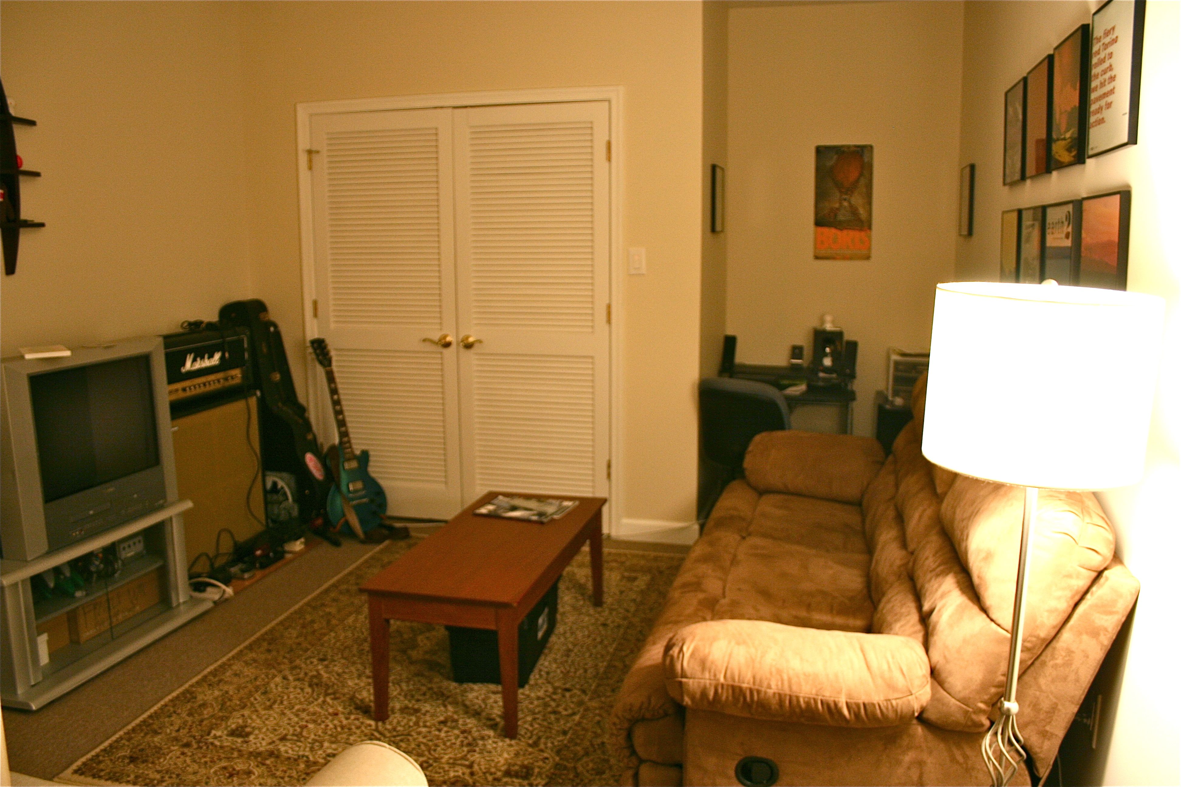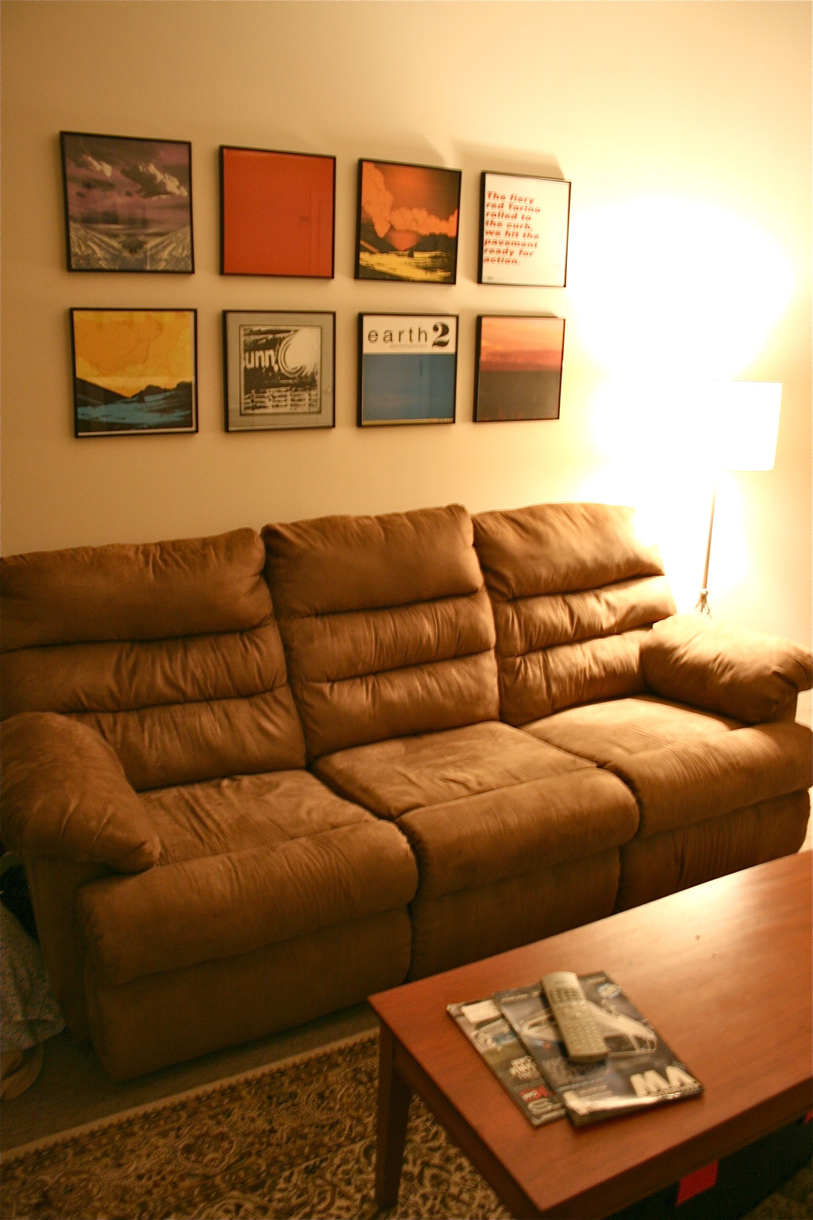 We brought in the oriental rug and wooden coffee table that I had at my apartment, and also put up the framed records again: