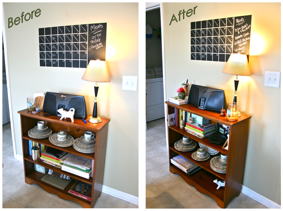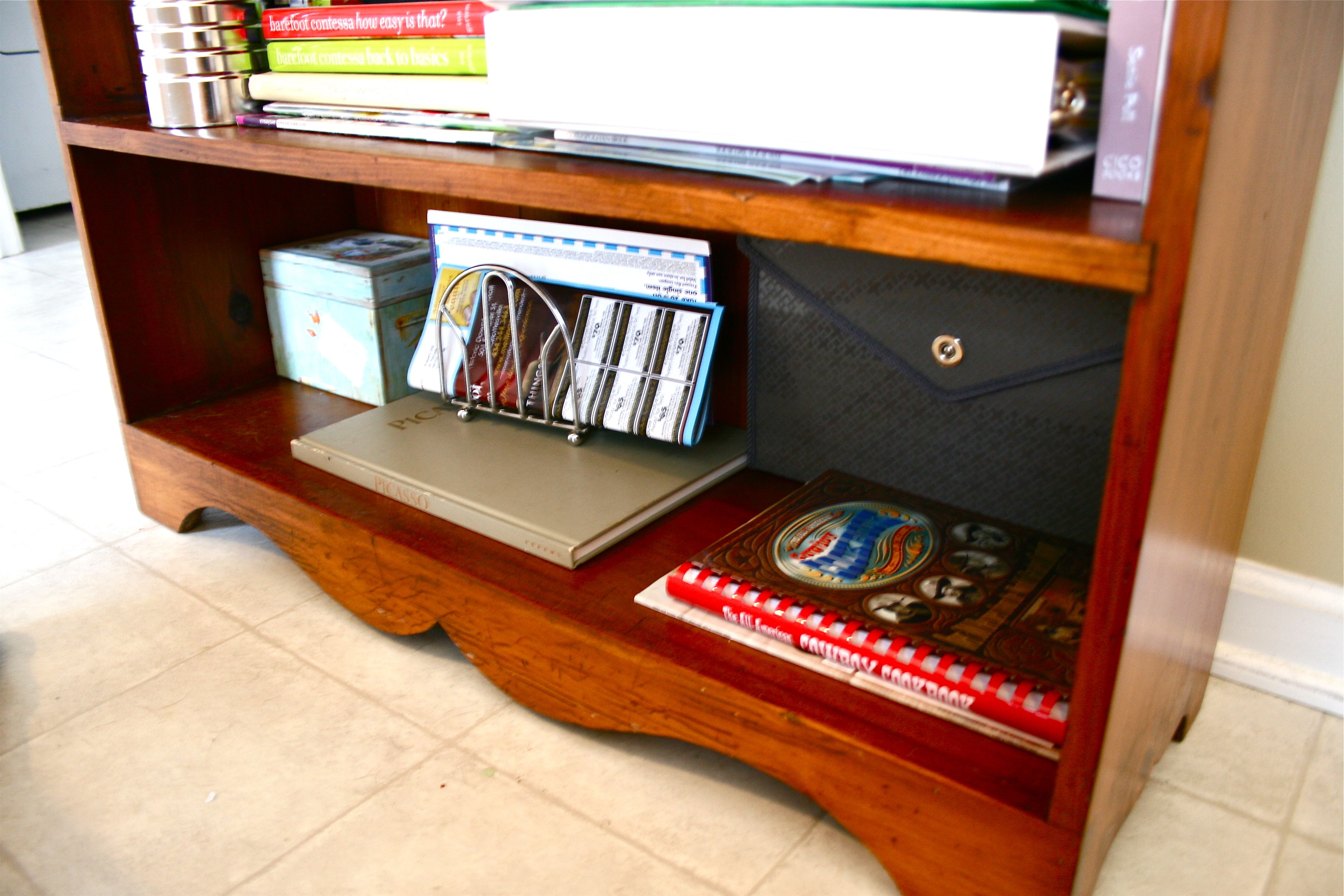 So from there I did some rearranging, putting cookbooks with cookbooks and magazine with magazines. I put all of the necessary stuff on the top shelf and the lesser-used items on the bottom. I ended up with extra space on the bottom where I’m thinking about putting a tray to hold mail and other papers that come in through the front door.