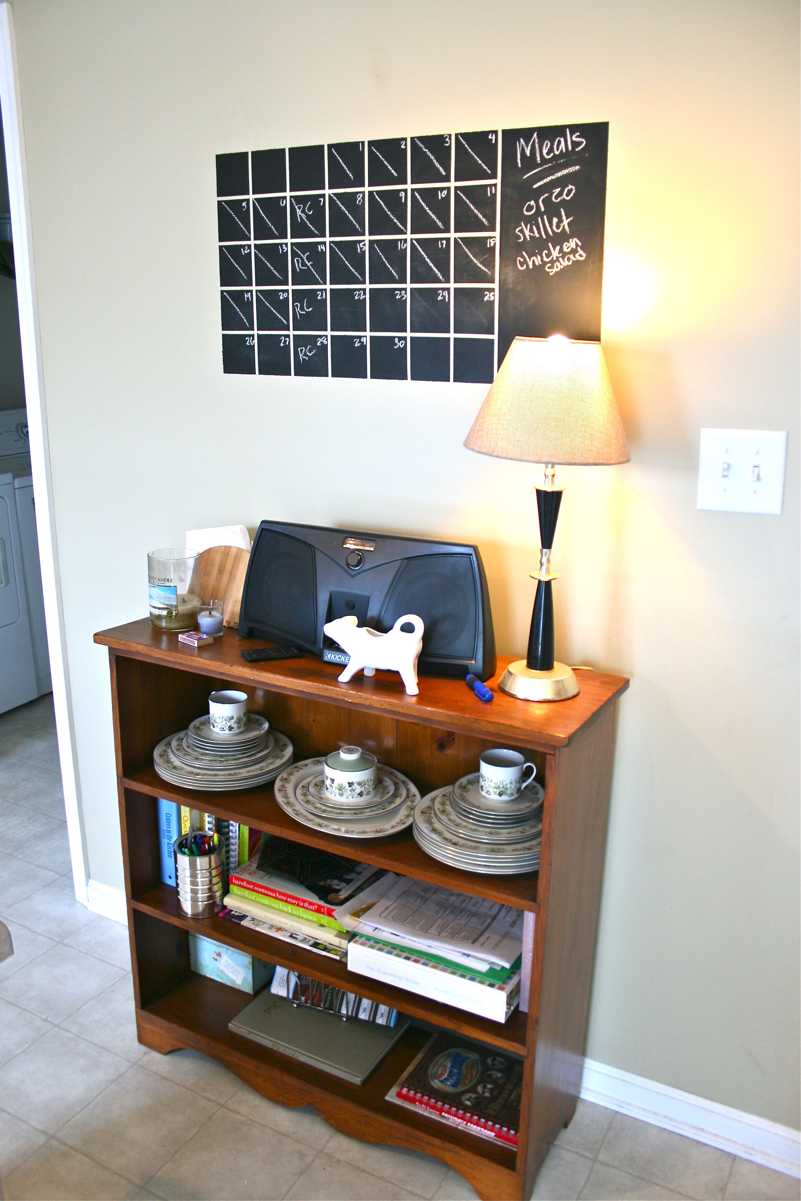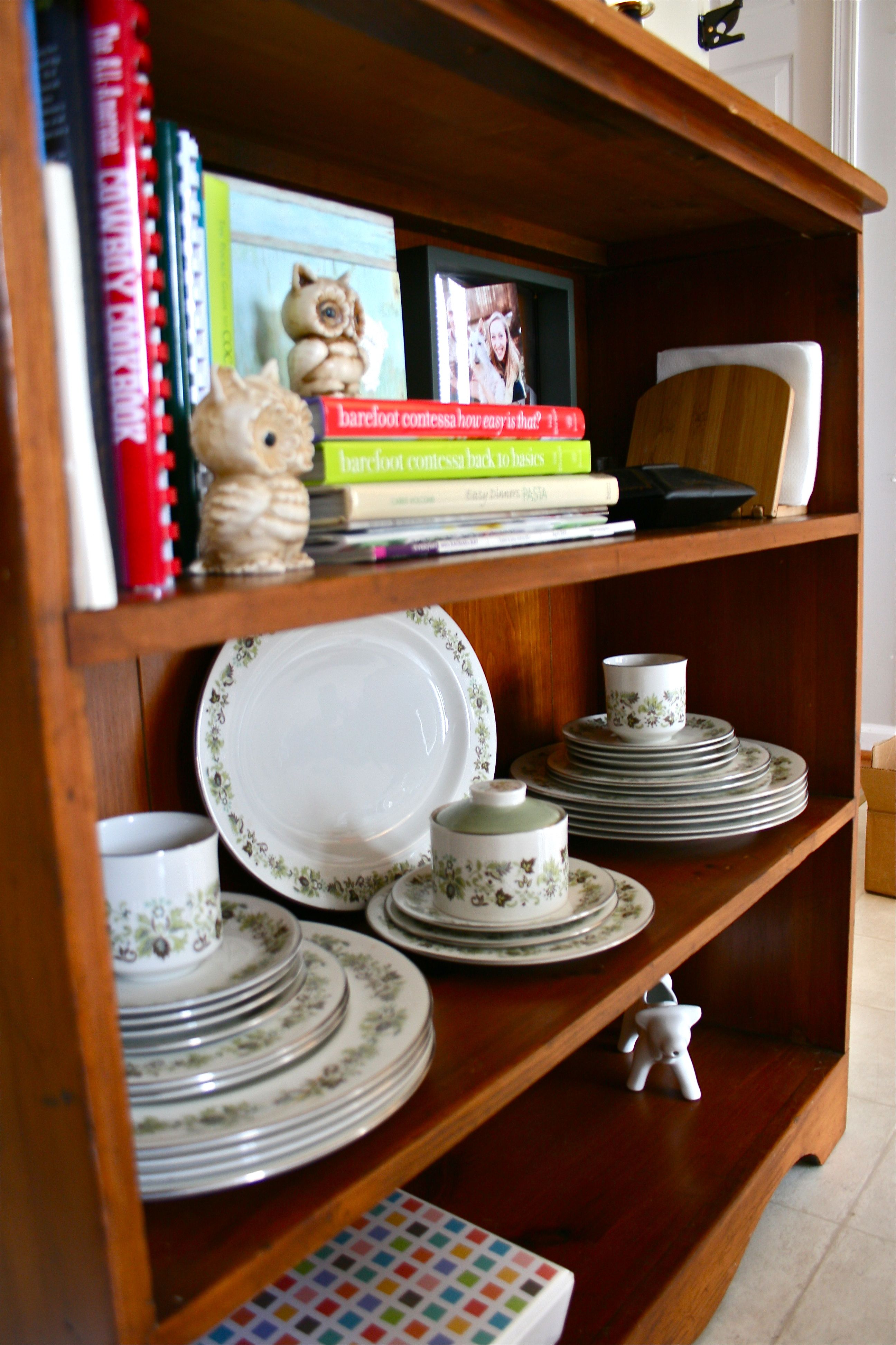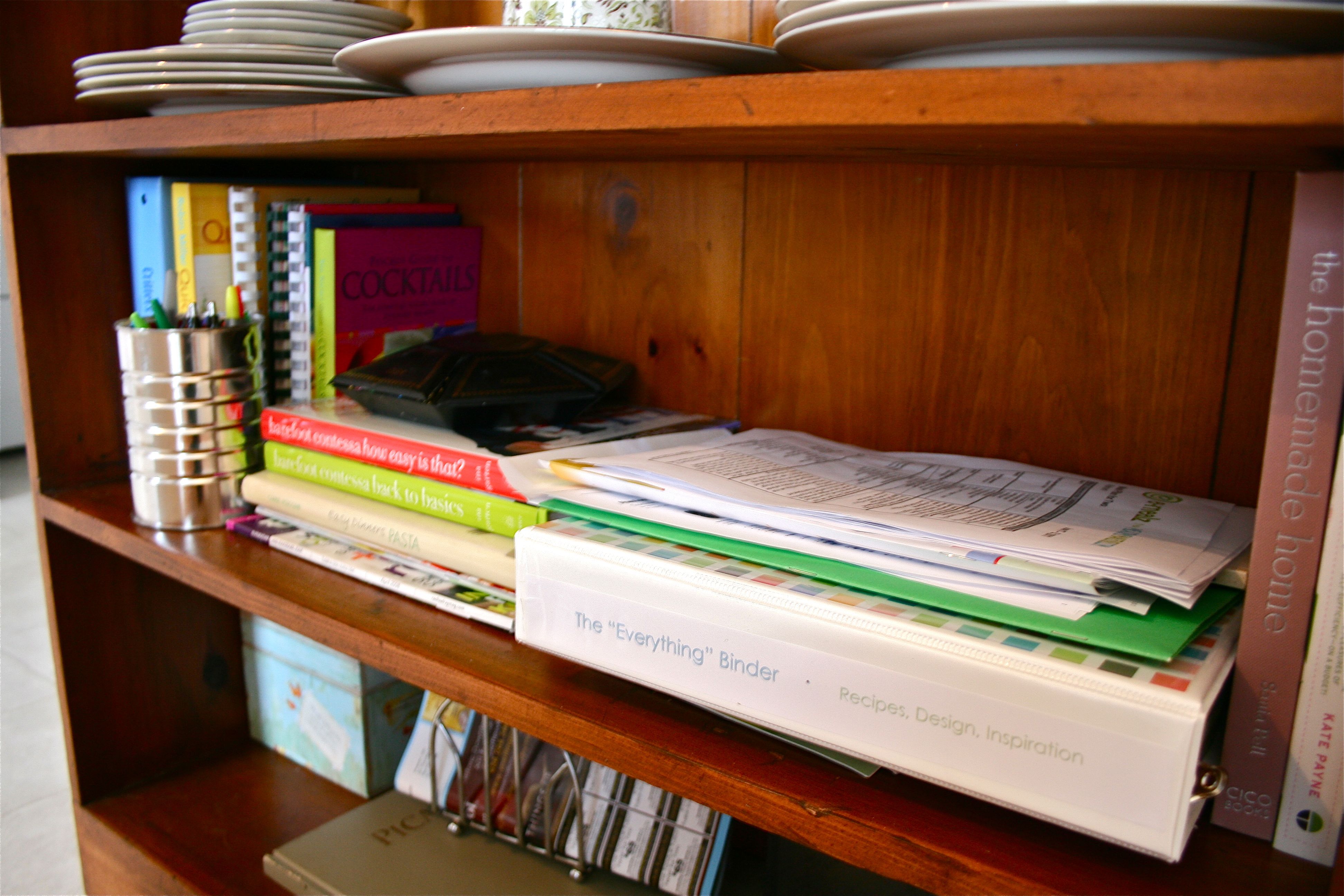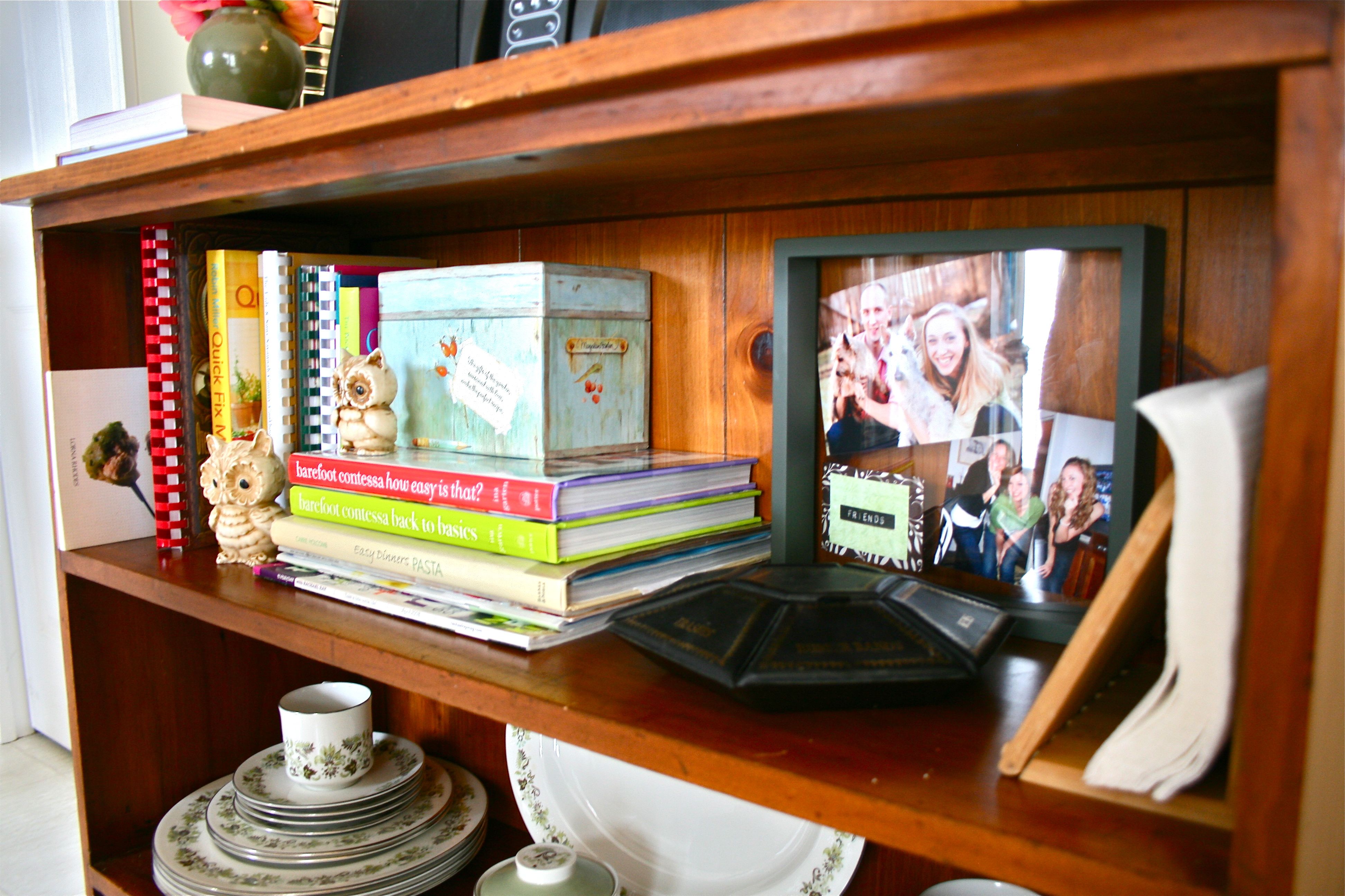 This bookshelf has proven to be excellent for being a cookbook catch-all and the perfect spot for our stereo (we LOVE to play music when we cook/bake/unwind from the day in the kitchen). But it was looking like a dumping ground at this point – Books and papers stacked haphazardly, the things we needed on a daily basis on the bottom shelf and “special occasion” stuff within easy reach. Plus, it lacked any kind of decoration or style.