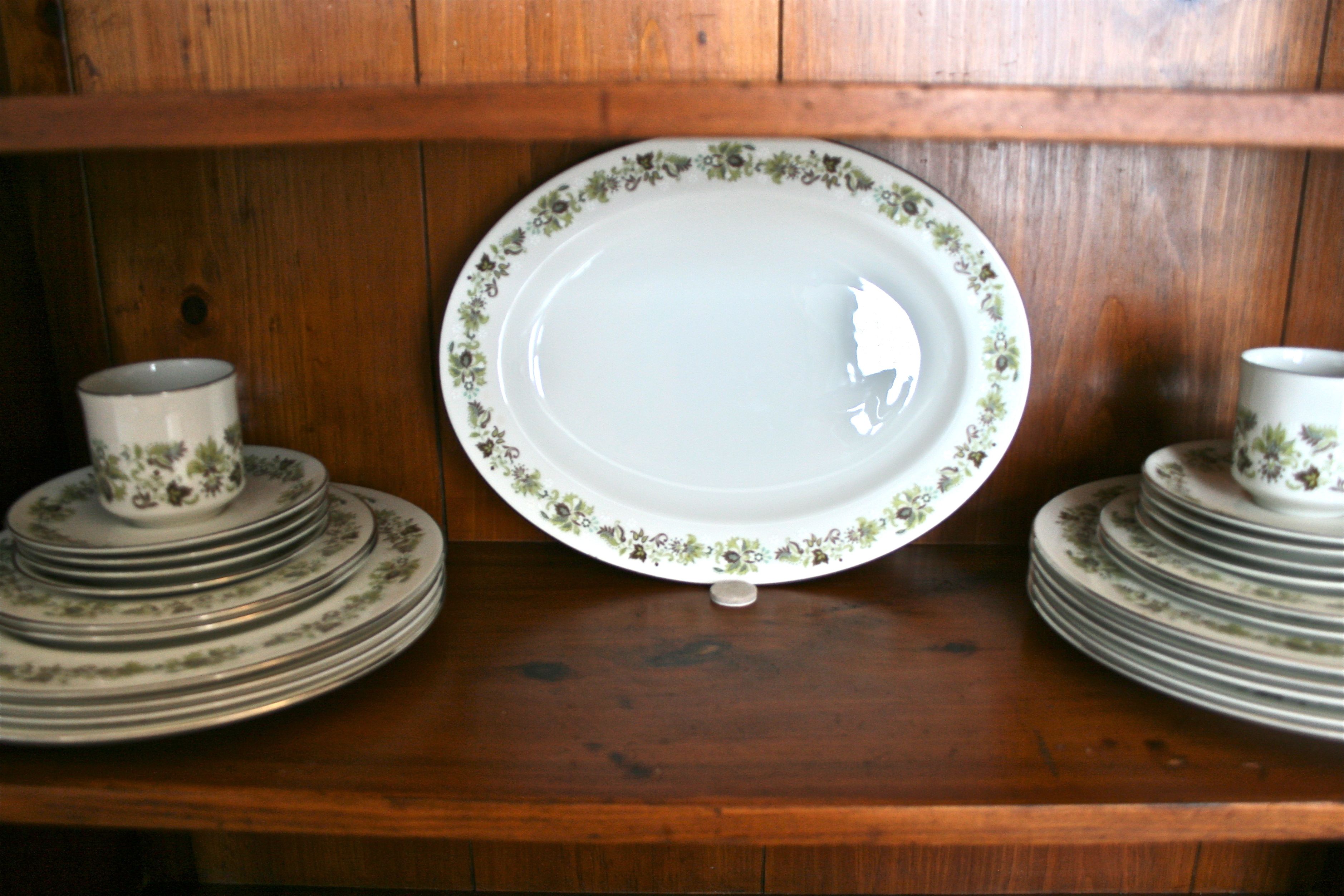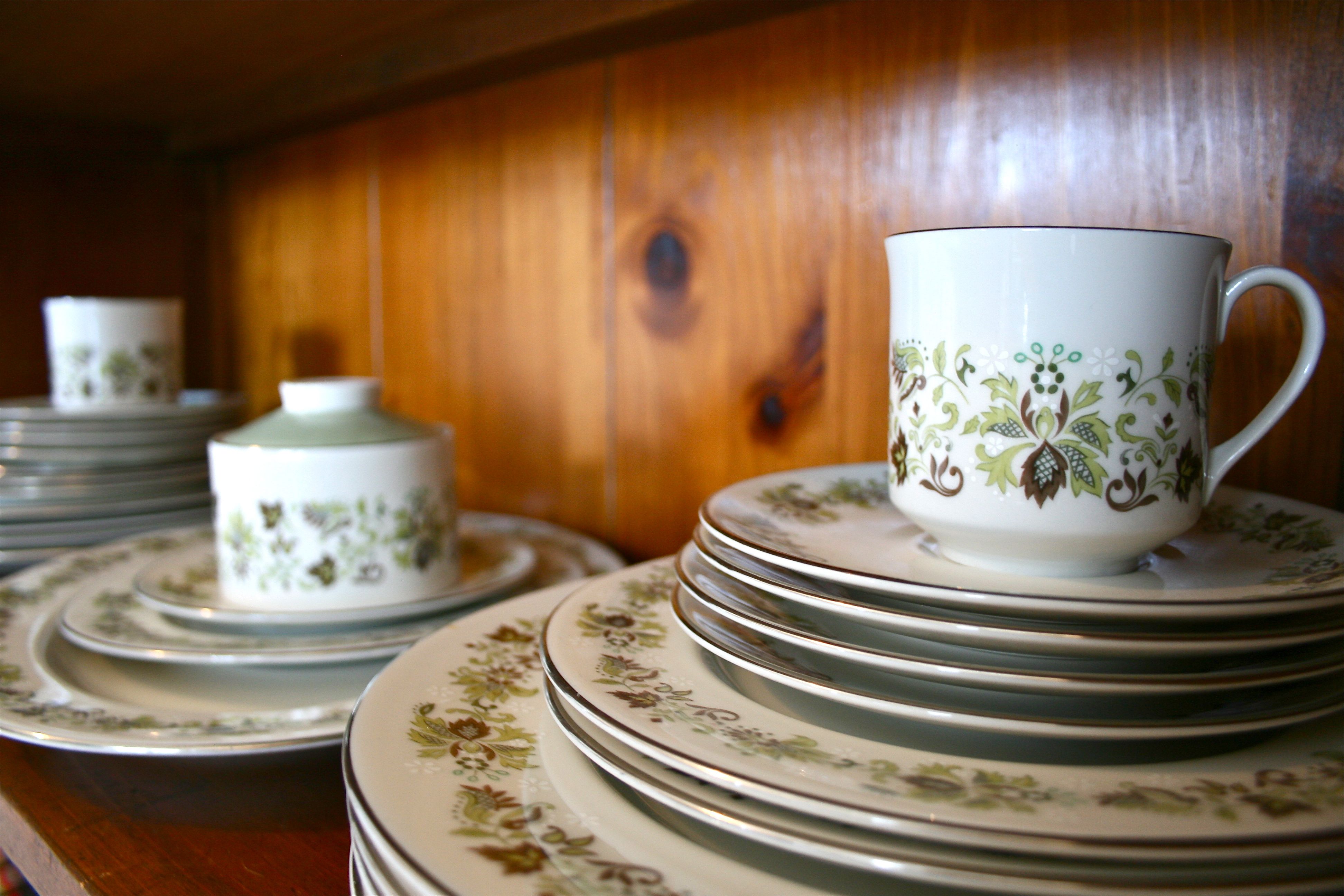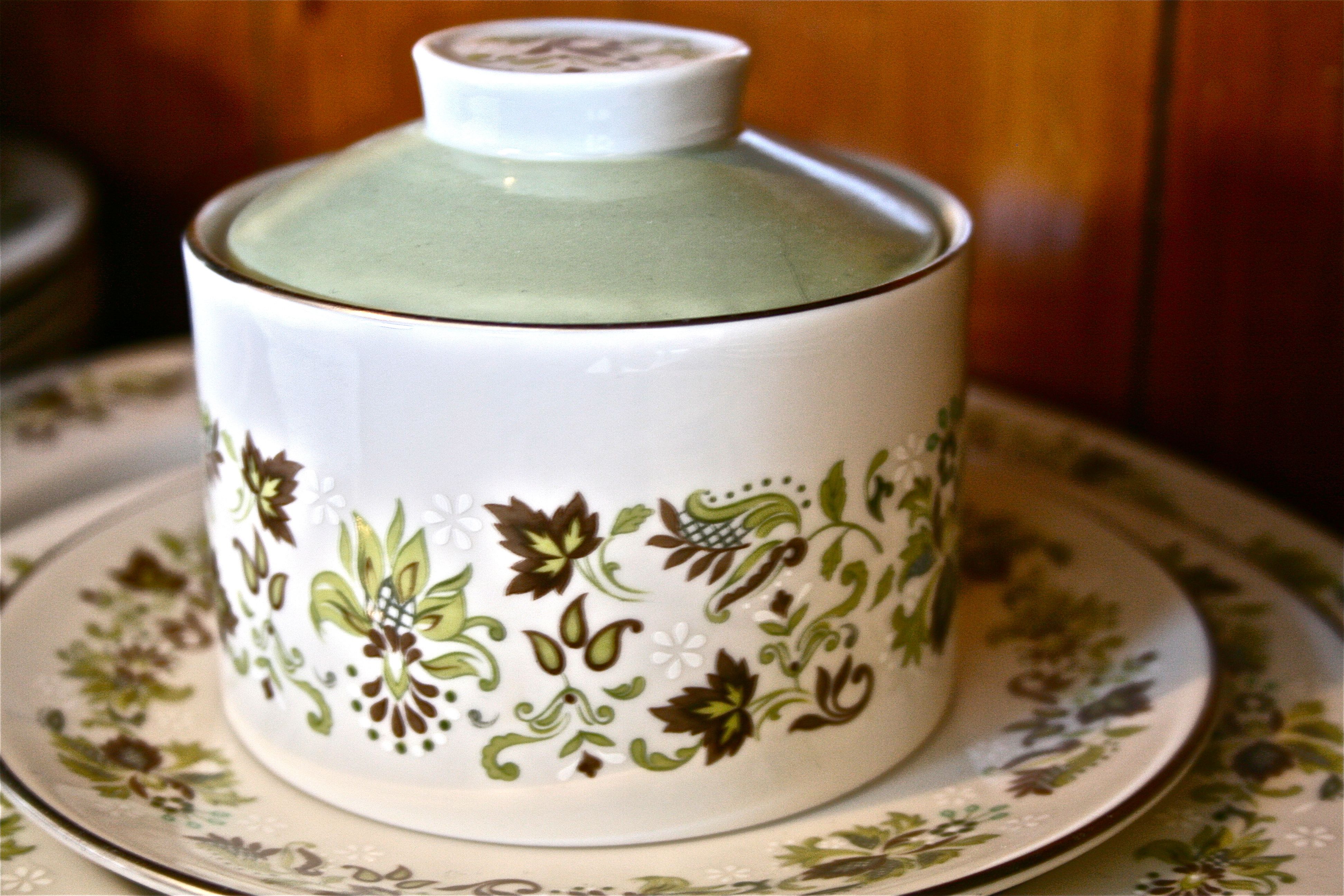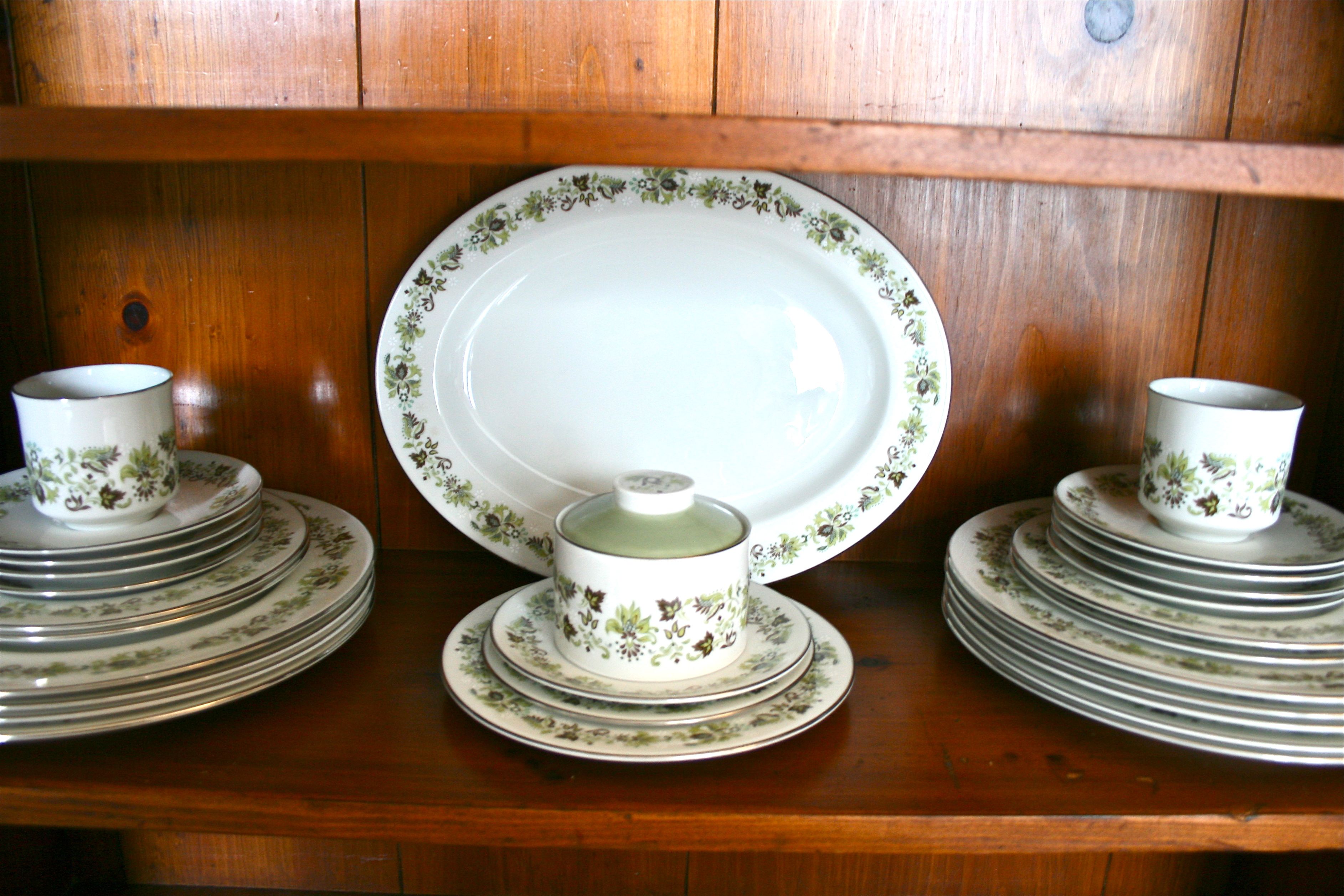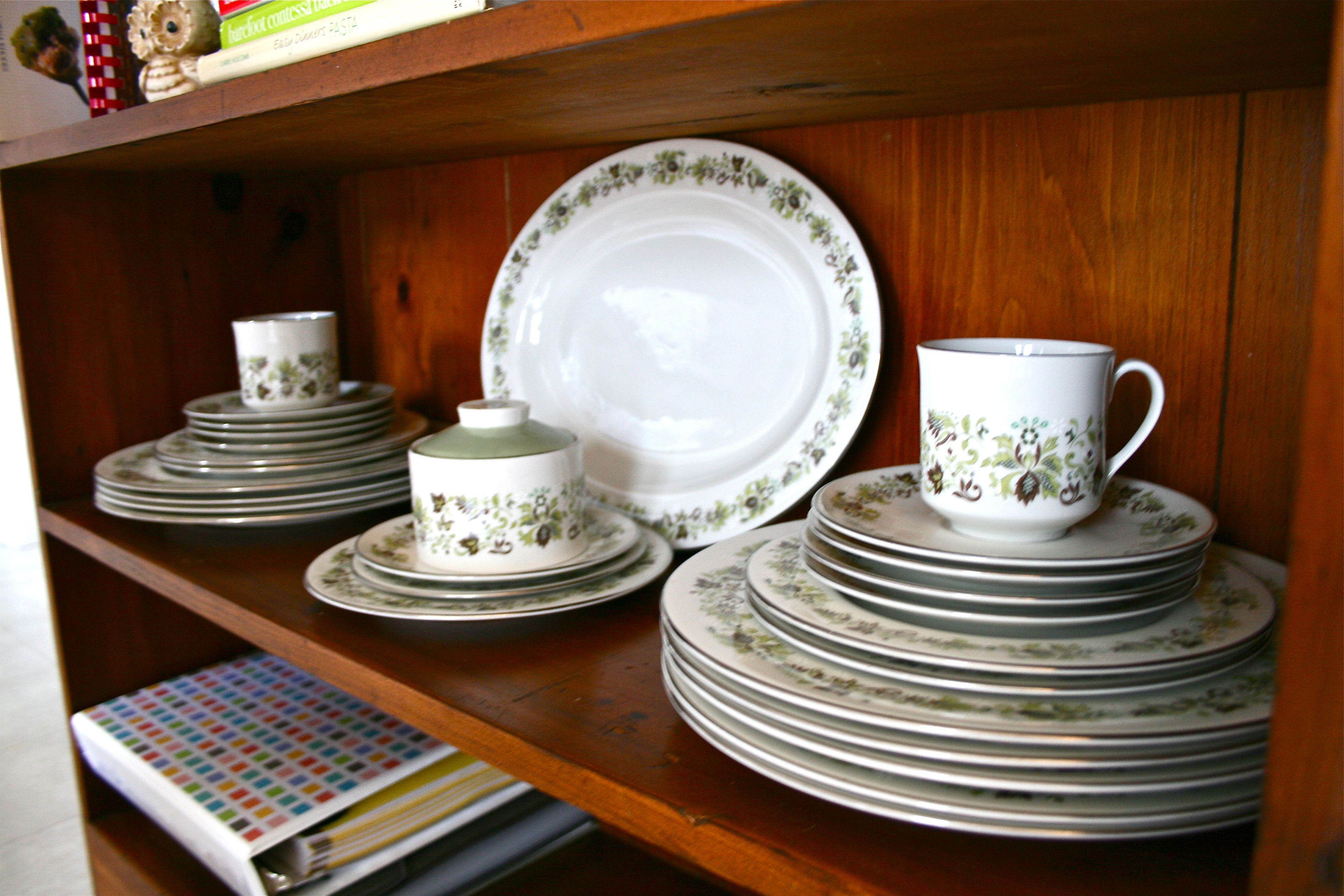 Oh and about my china? It’s a (slightly incomplete) set that I picked up from my favorite second hand shop in town for $32. I wasn’t with John at the time (in fact I was single), but I decided that I didn’t have to wait until I got married to have some gorgeous wedding china! I instantly fell in love with the green, brown, and eggplant pattern – In my opinion it’s sort of a mid-century version of floral.