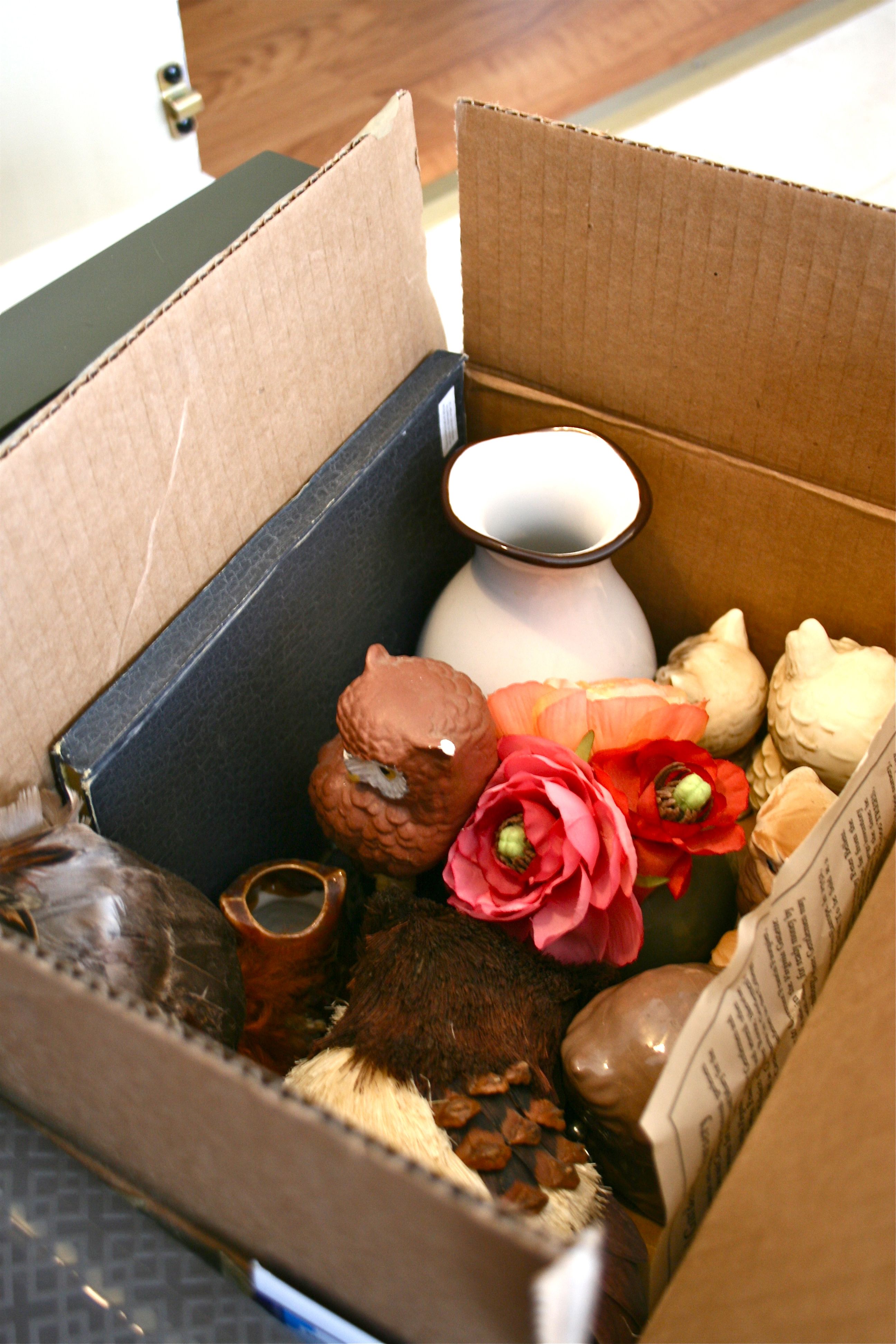 Yes, I have fake flowers in there – I love how much life plants give a room, but since I have a brown thumb (i.e. I kill plants like a serial killer), I have to resort to the immortal version. And yes, 90% of the box is filled with owls – Thrift stores NEVER fail me in their endless supplies of owl trinkets…