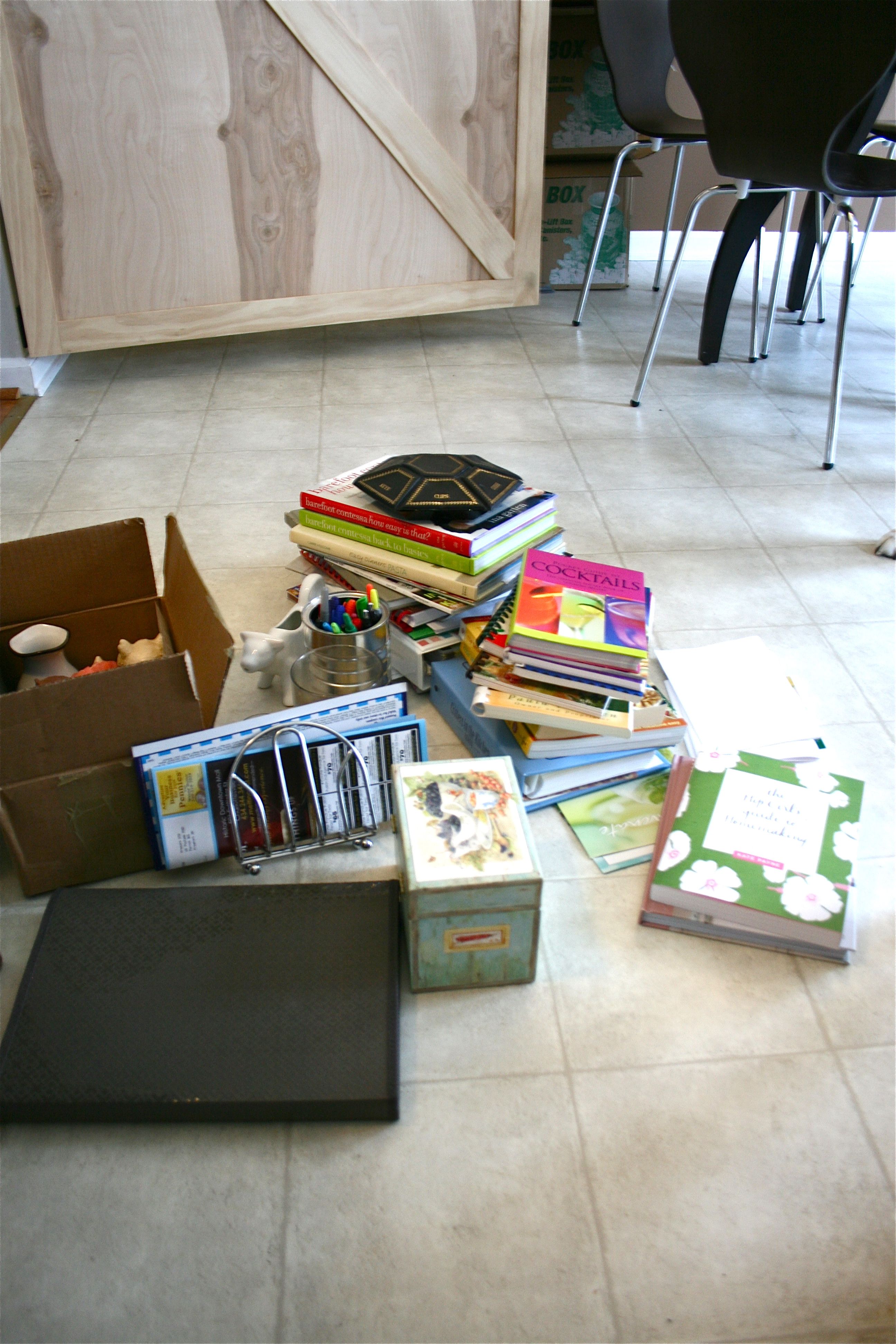 So the first thing I did was squat on the kitchen floor and take everything off the shelves, stacking books, papers, etc. on the floor in piles. I left my china in place because I wanted to avoid moving the delicate pieces any more than I had to.