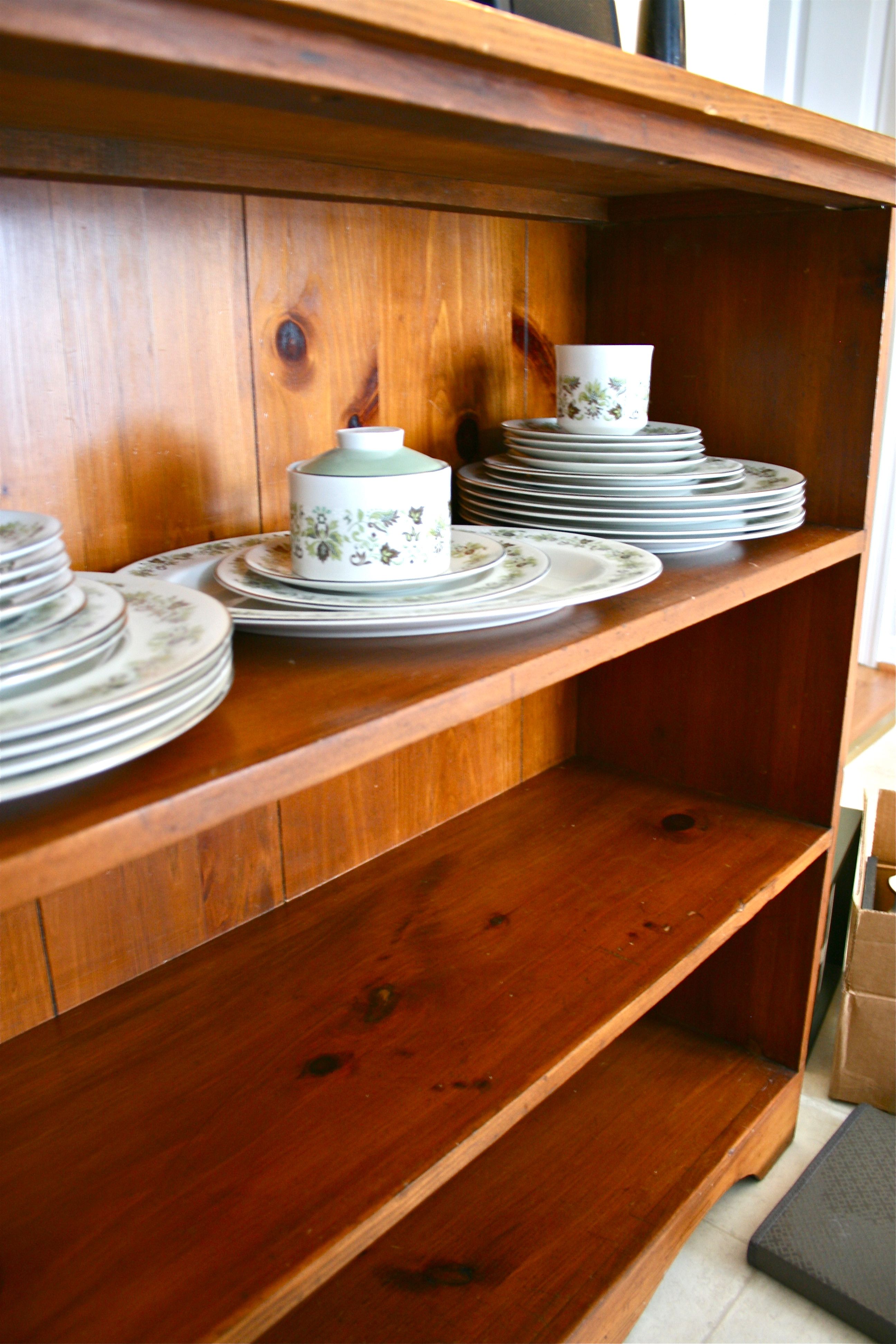 Task #1 was prioritizing. The china, which as you saw started out on the top shelf (taking up prime real estate), was moved one shelf down. I didn’t want it on the bottom shelf for fear of the dog’s strong happy tail, but the middle shelf seemed safe enough.