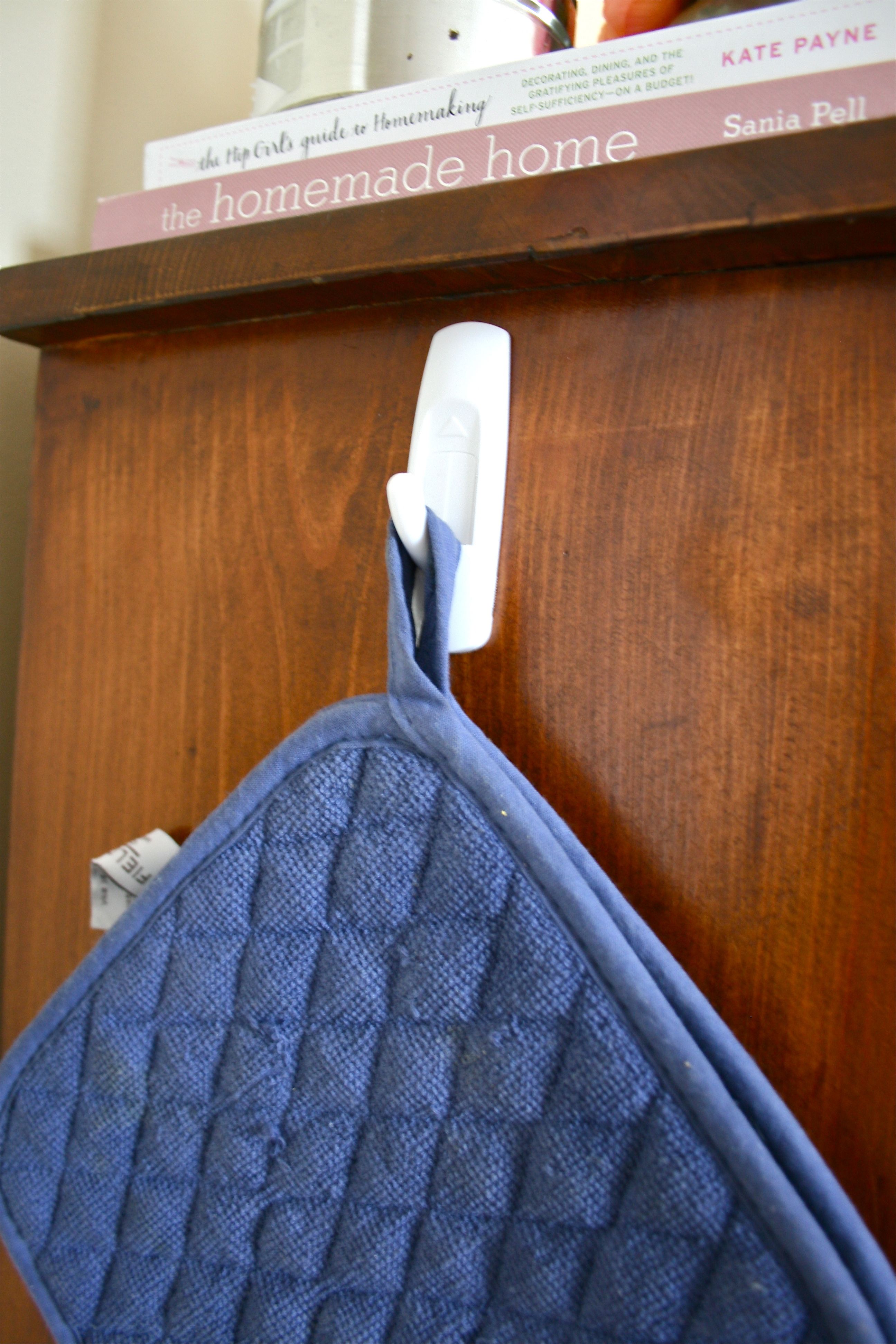 I also added a little 3M hook on the side of the shelf for oven mits to be within easy reach (but not clutter up the kitchen drawers):