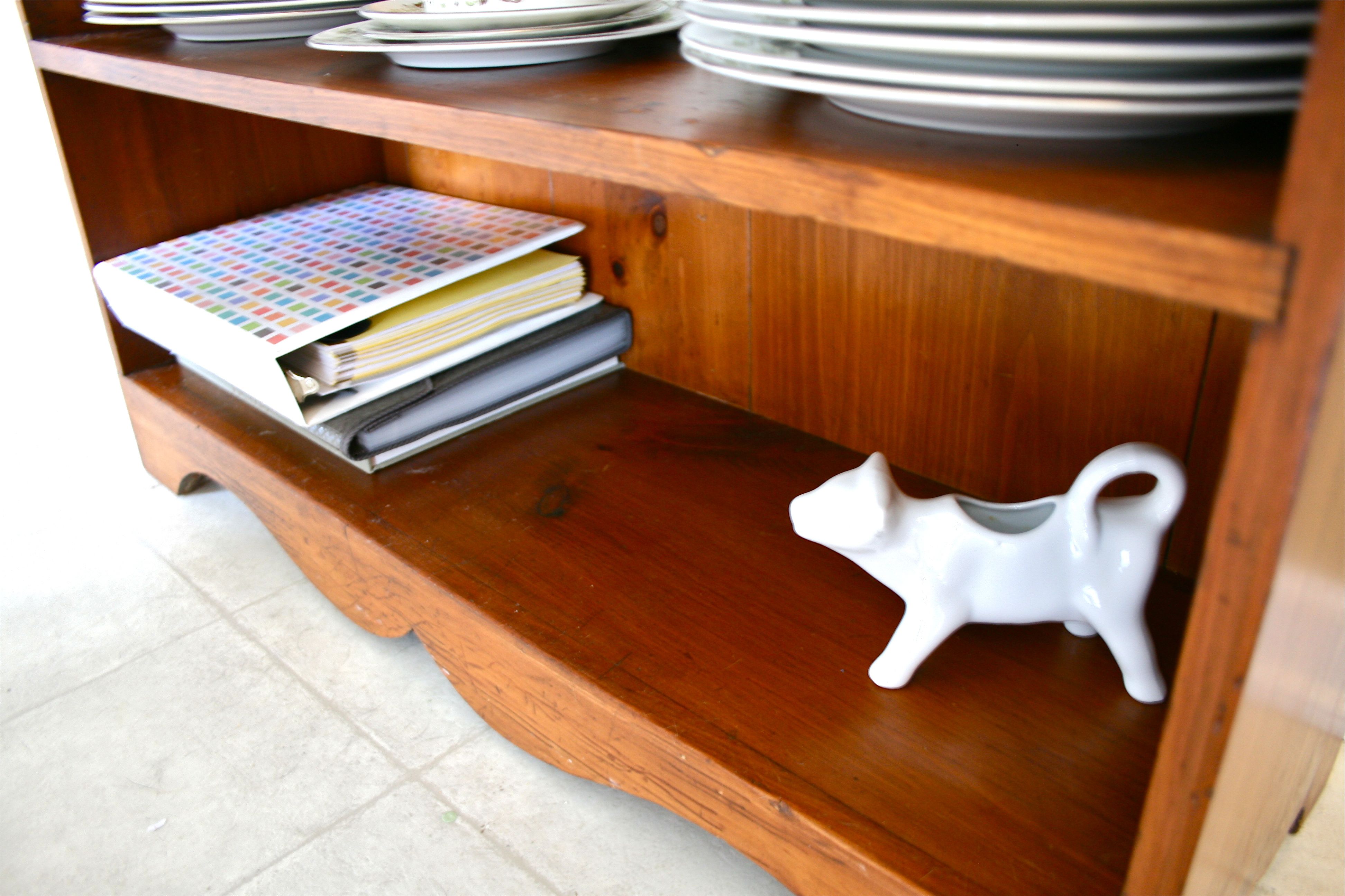 And the mostly empty bottom shelf which will eventually be the place for random papers and whatnot. (Plus a cream/gravy boat shaped like a cow that reminds me of my childhood and was just too cute to hide in a kitchen cabinet!)