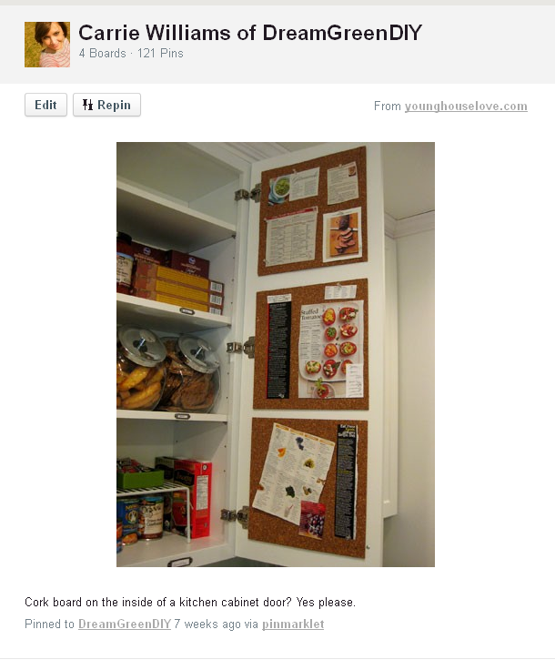 Here’s an image (via YoungHouseLove.com) that I pinned to my board a few months ago. It’s a simple project involving the inside of your kitchen cabinet doors, some tape and a few squares of cork board.