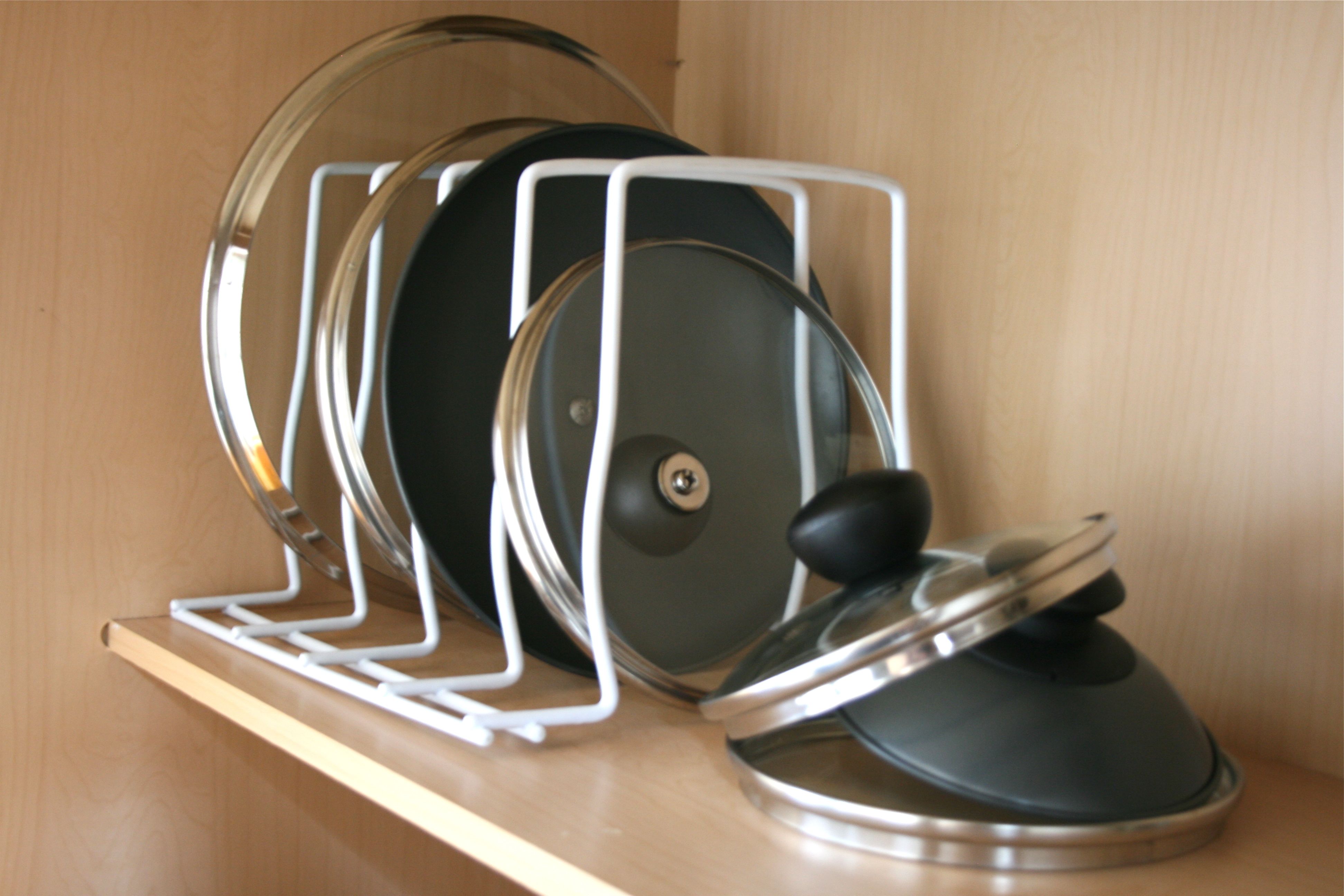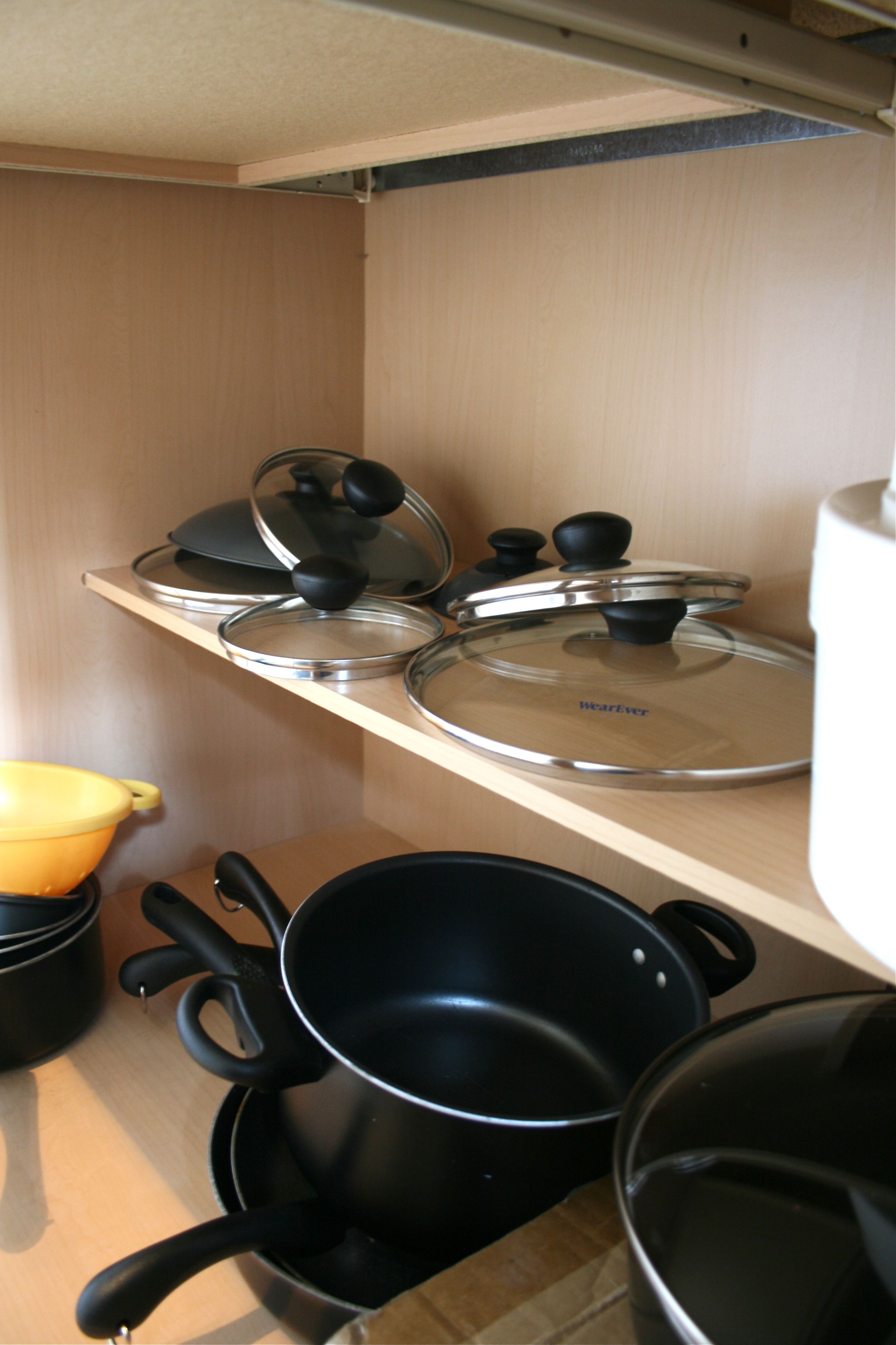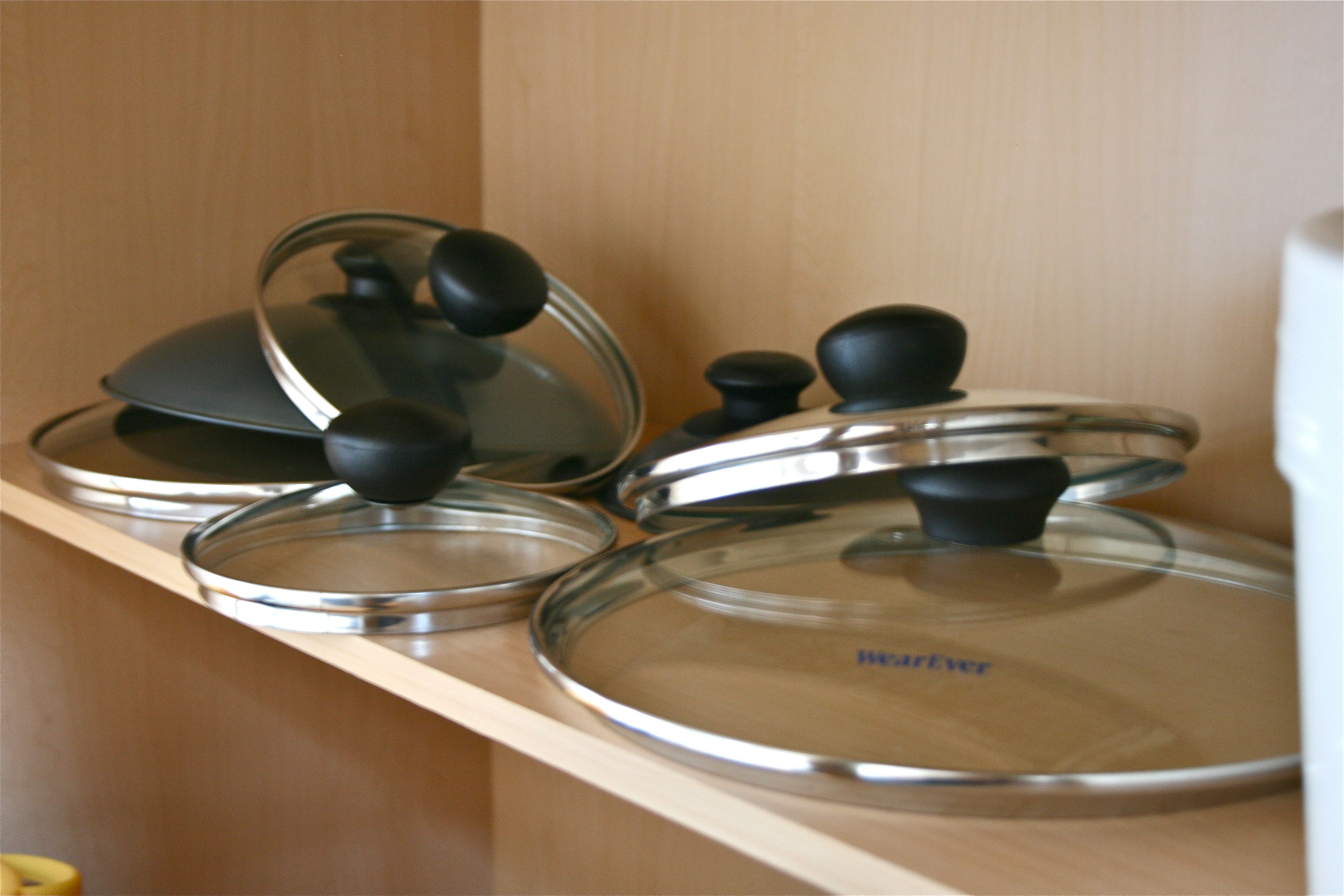 We plan on either registering or purchasing a hanging metal pot rack (anyone know where we can get a good one? Or is it possible to DIY one??) so the pots and pans are temporarily nested within one another. But the tops are a different story…