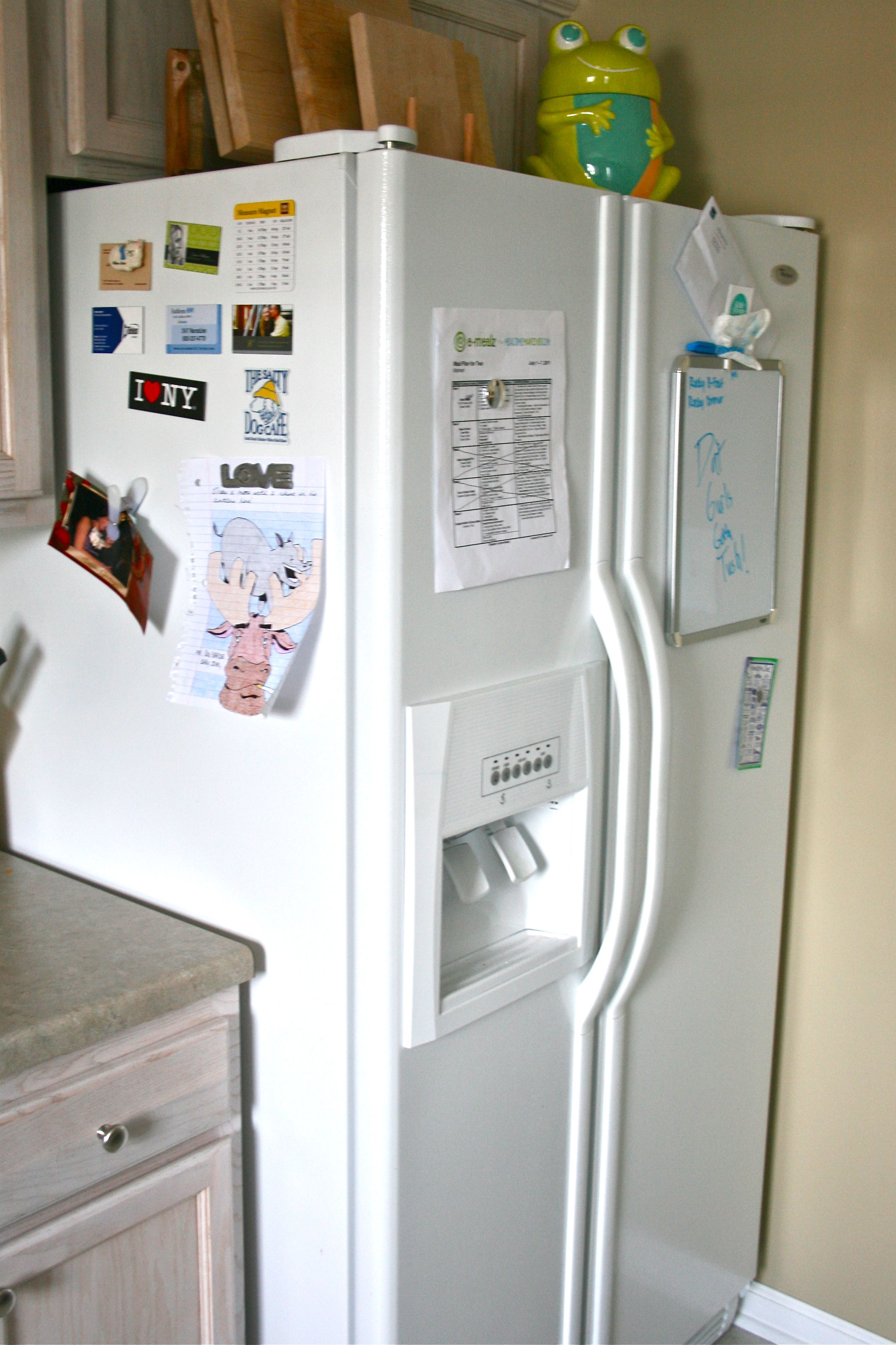 The next project we tackled was our refrigerator. It’s not an overly cluttered surface, but it could use a little paring down…Between magnets, business cards, weekly dinner menus, a dry erase board and other random things, it was starting to put my obsessive-compulsive need for cleanliness into overdrive.