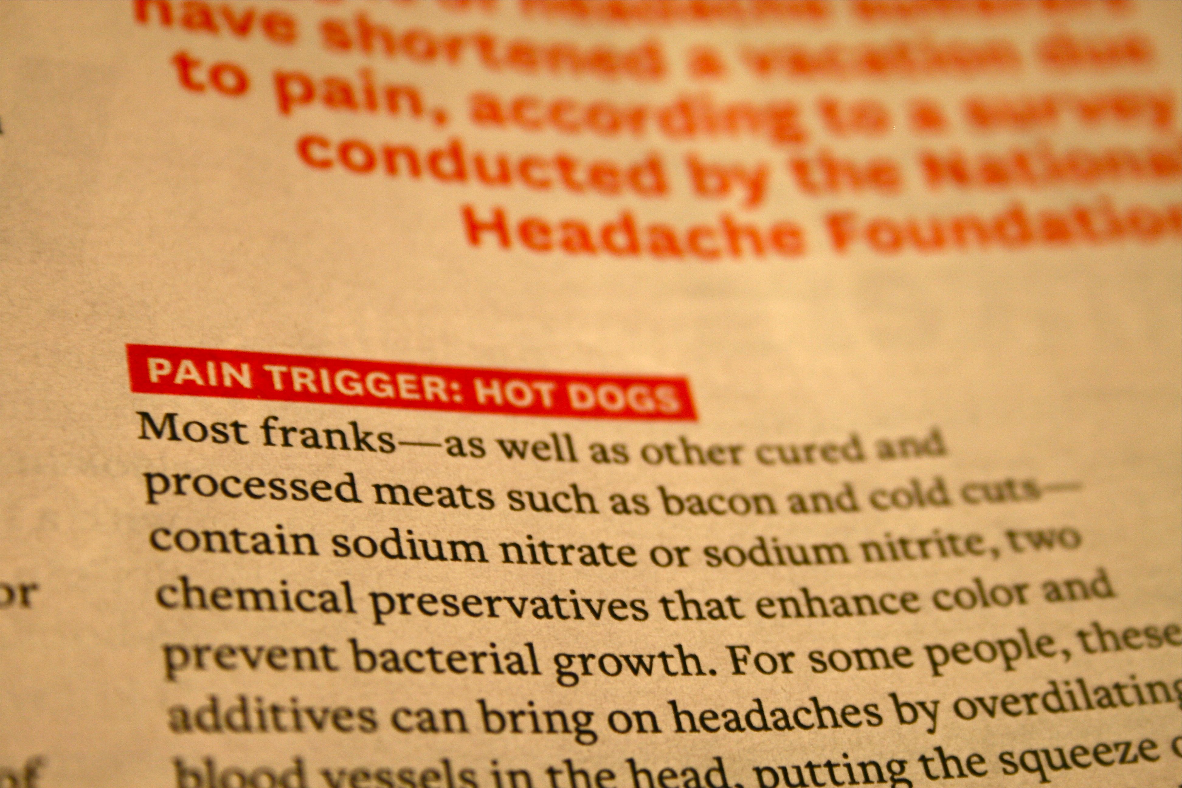 Hot dogs???! Let me just tell you, I could eat hot dogs morning, noon and night – But apparently they are very bad for headache-prone people like me! I think there is definitely truth to this tip though – The last big headache I had was after a cookout up in the mountains with John and two of our friends, followed the next day by another cookout for my dad’s birthday. Now I know why!
