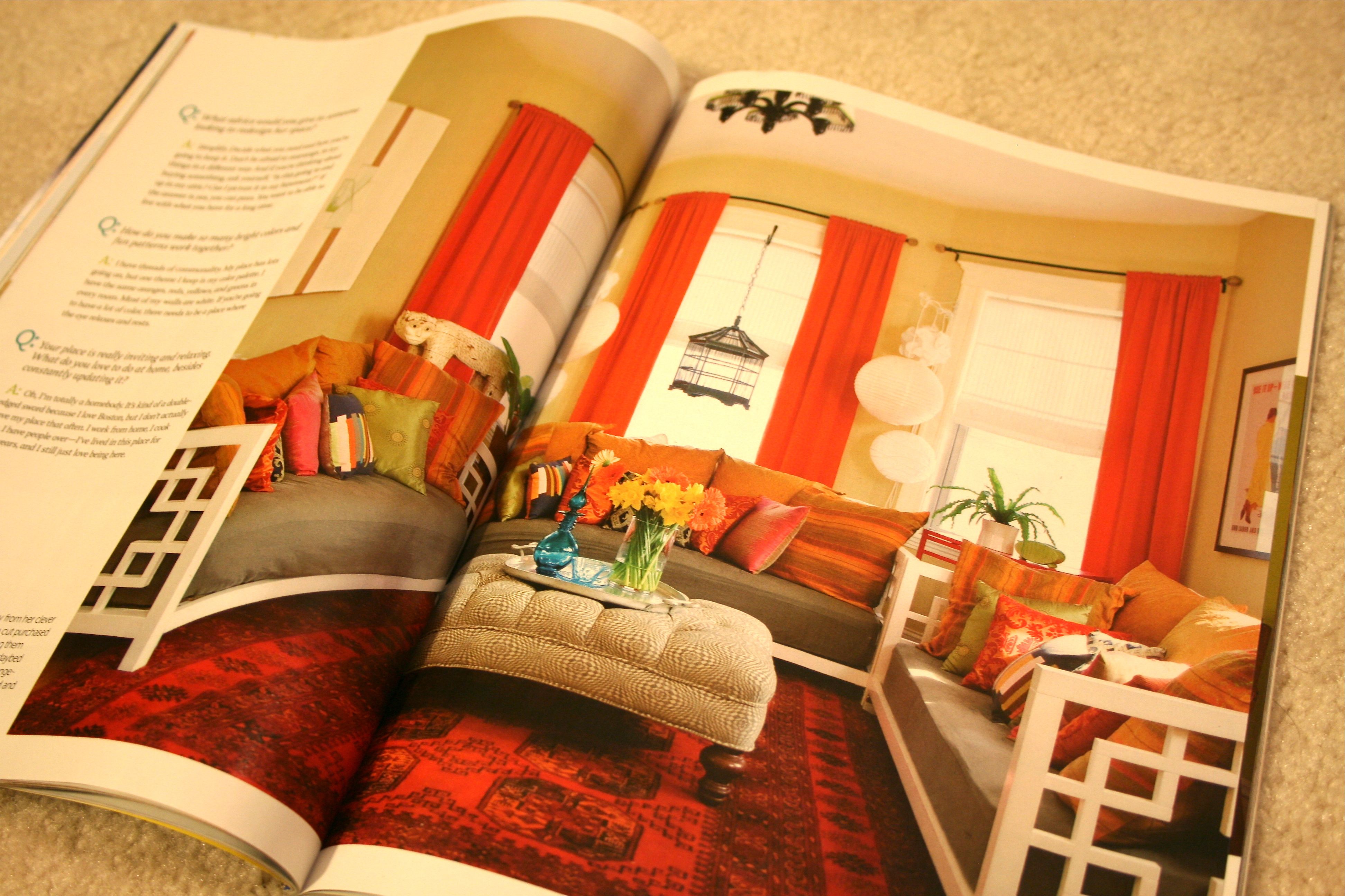 This page was share-worthy because those bright curtains and the rich color palette in the pillows and rug are so lovely! I don’t often decorate with rich reds and oranges, so I don’t really have any intention of recreating this in our house. But sometimes it’s just fun to flip through glossy photos of rooms you know you’ll never try, just to admire what other people have the guts to do. But who knows!? I might come around to red someday…