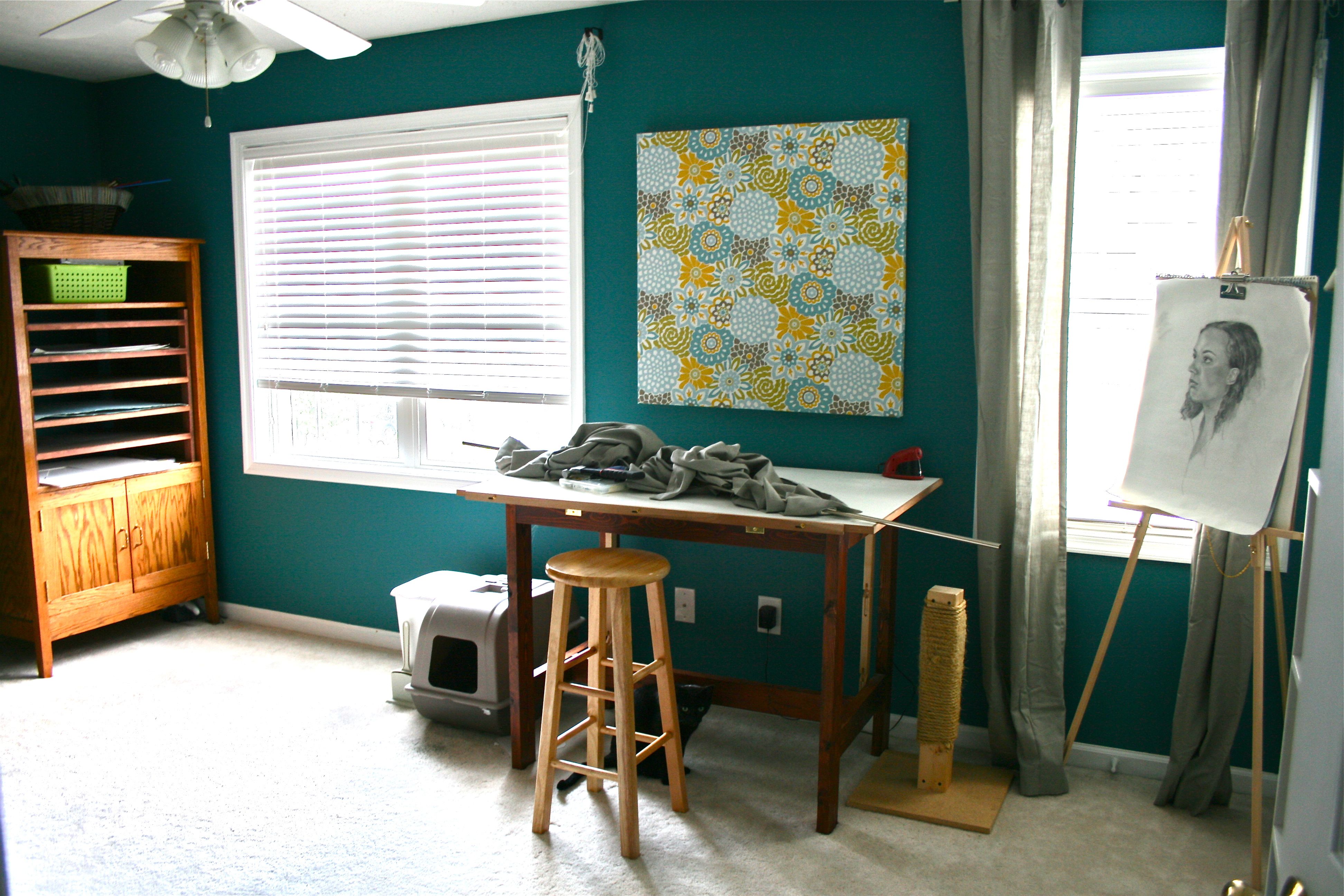 Allow me to (try to) explain. This is what the studio looked like before its quick makeover – The drafting table was between the windows and was the first thing you saw when you walked into the room. Next to it on the same plane of view was the big paper shelving unit.