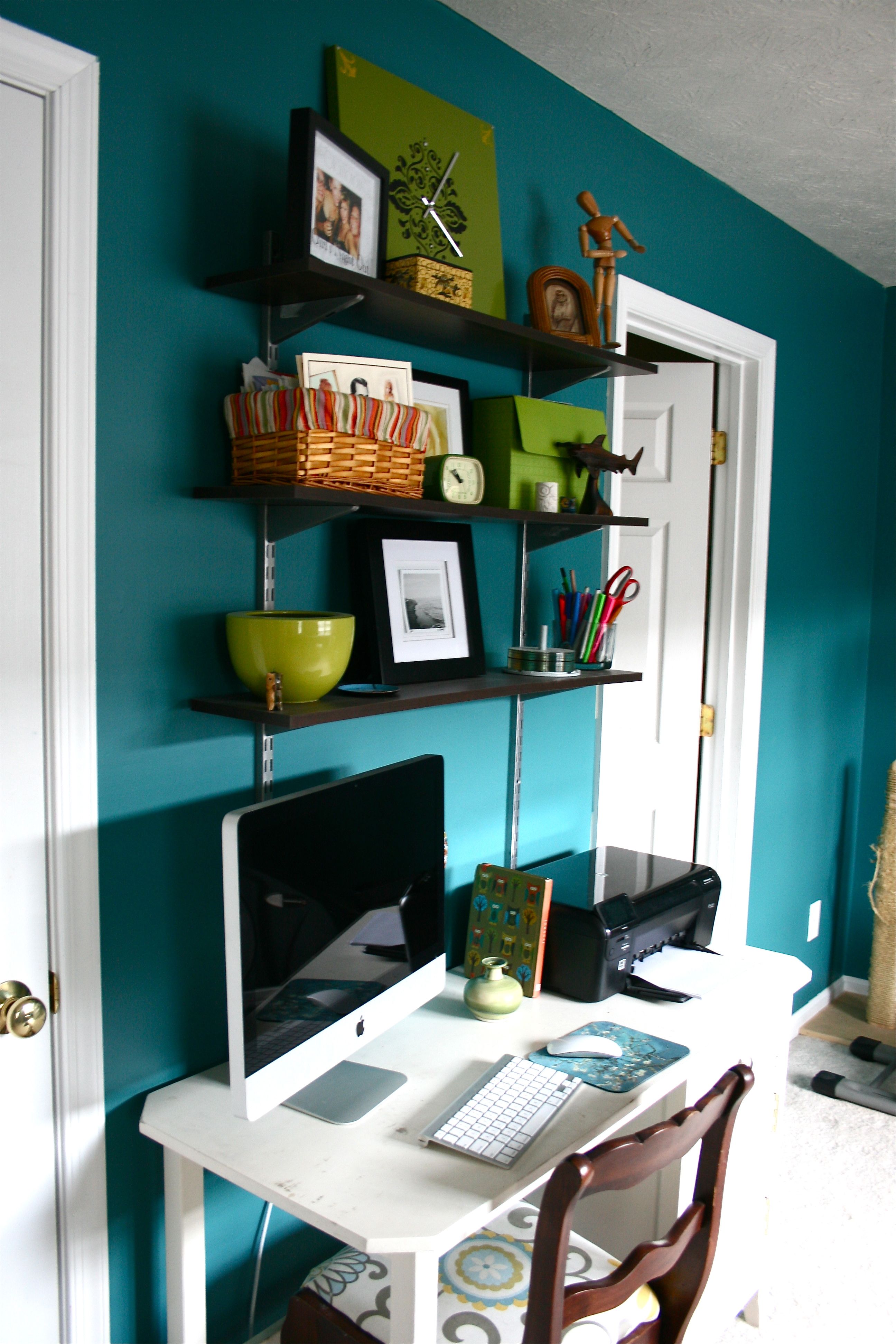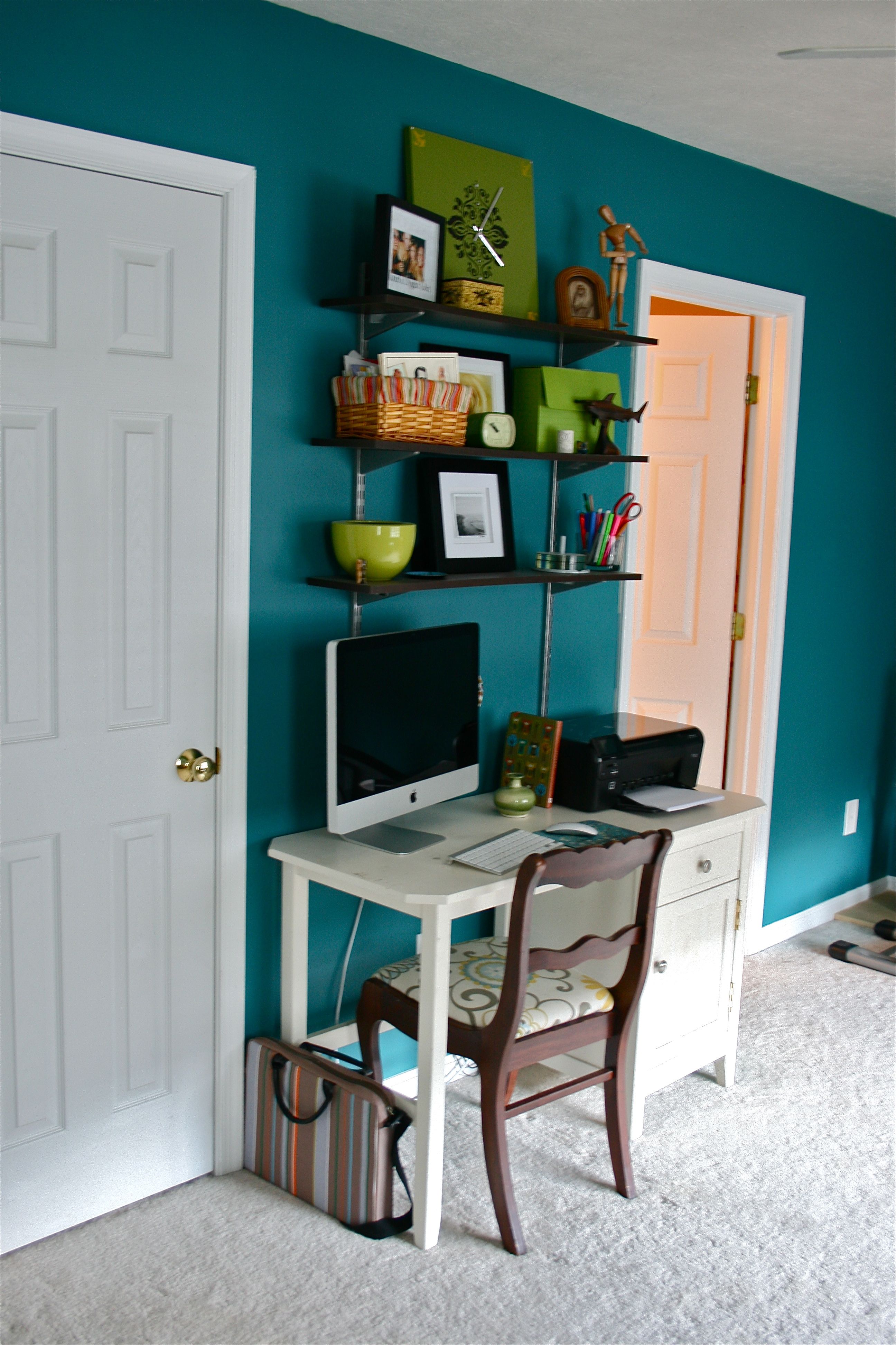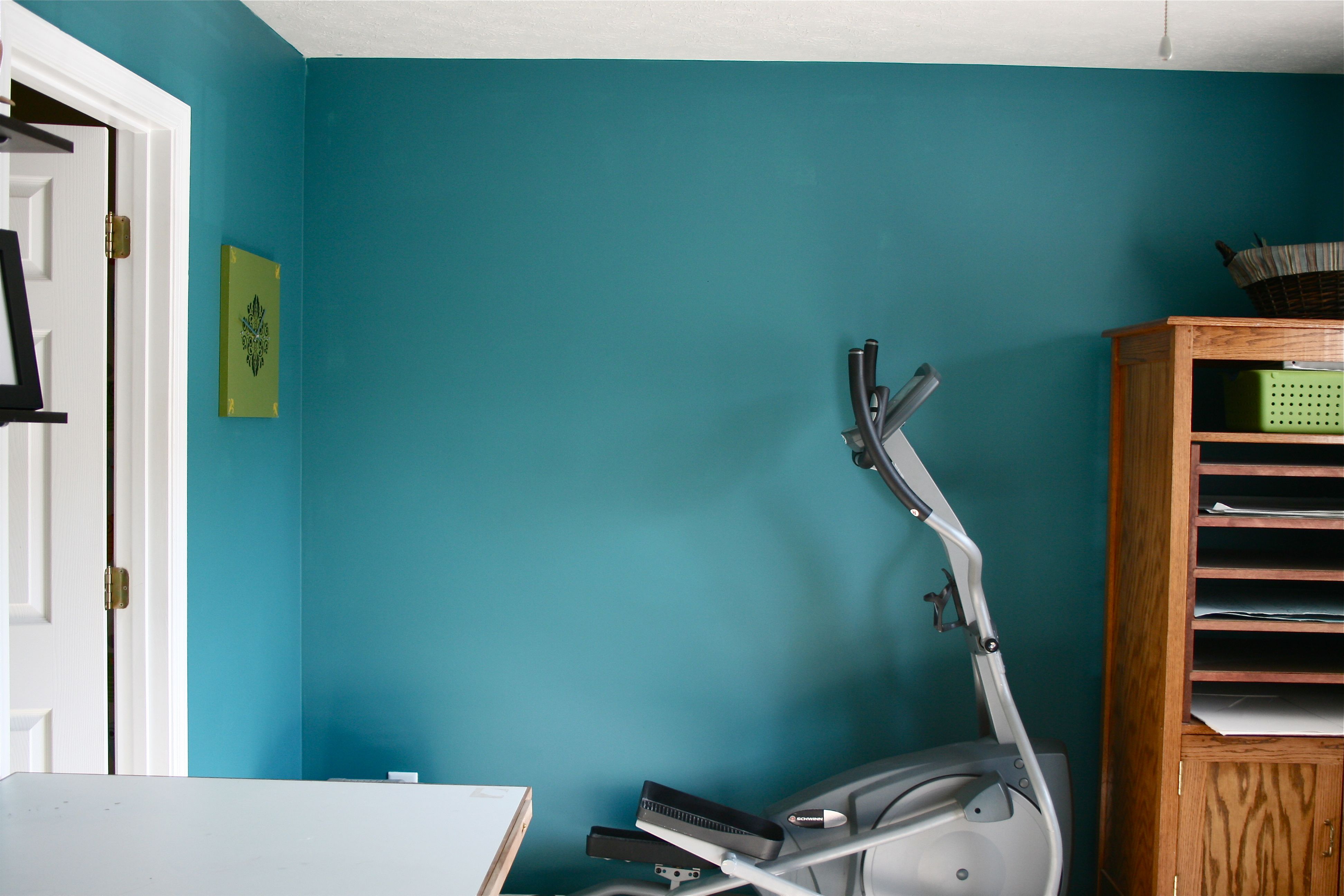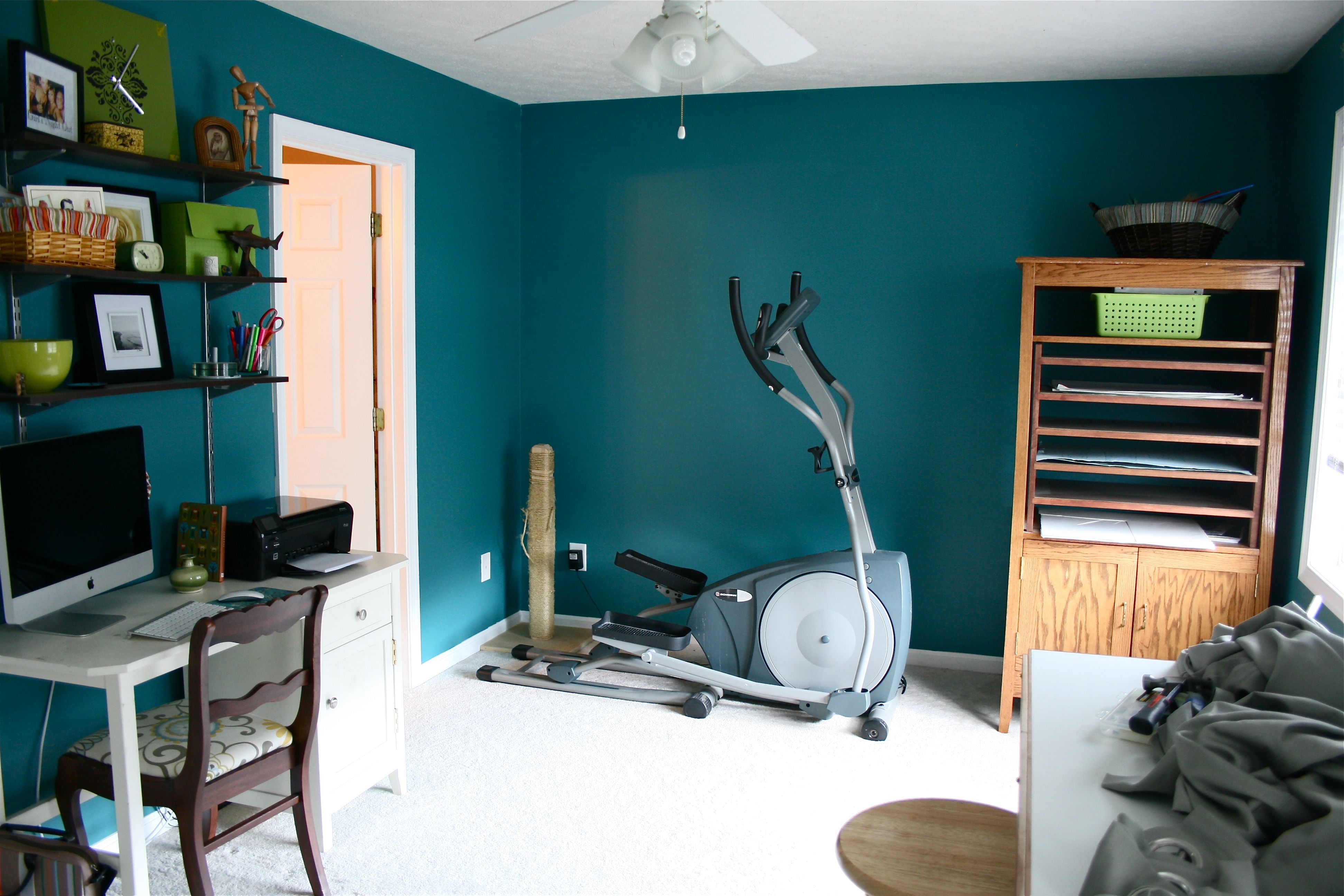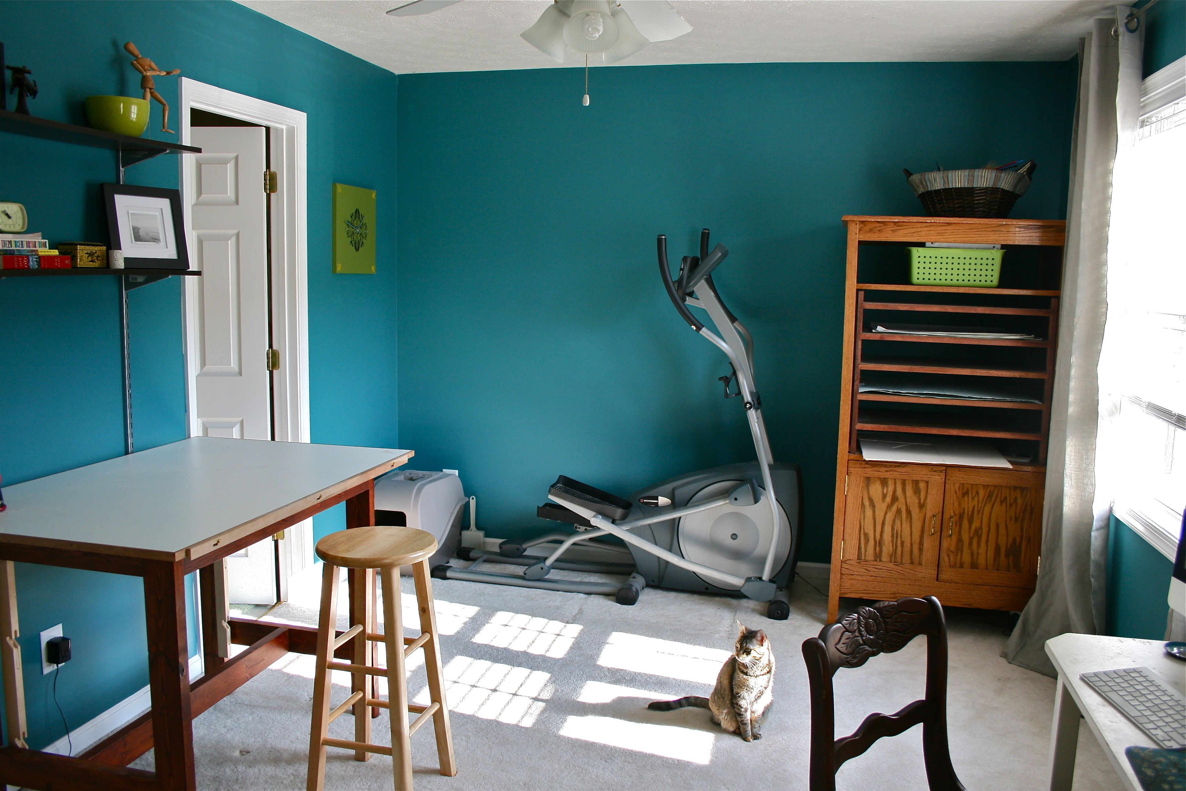 Flip around and look to the left and you’ll see the desk under the shelving unit John hung for me and also the ugly-but-necessary elliptical machine.
