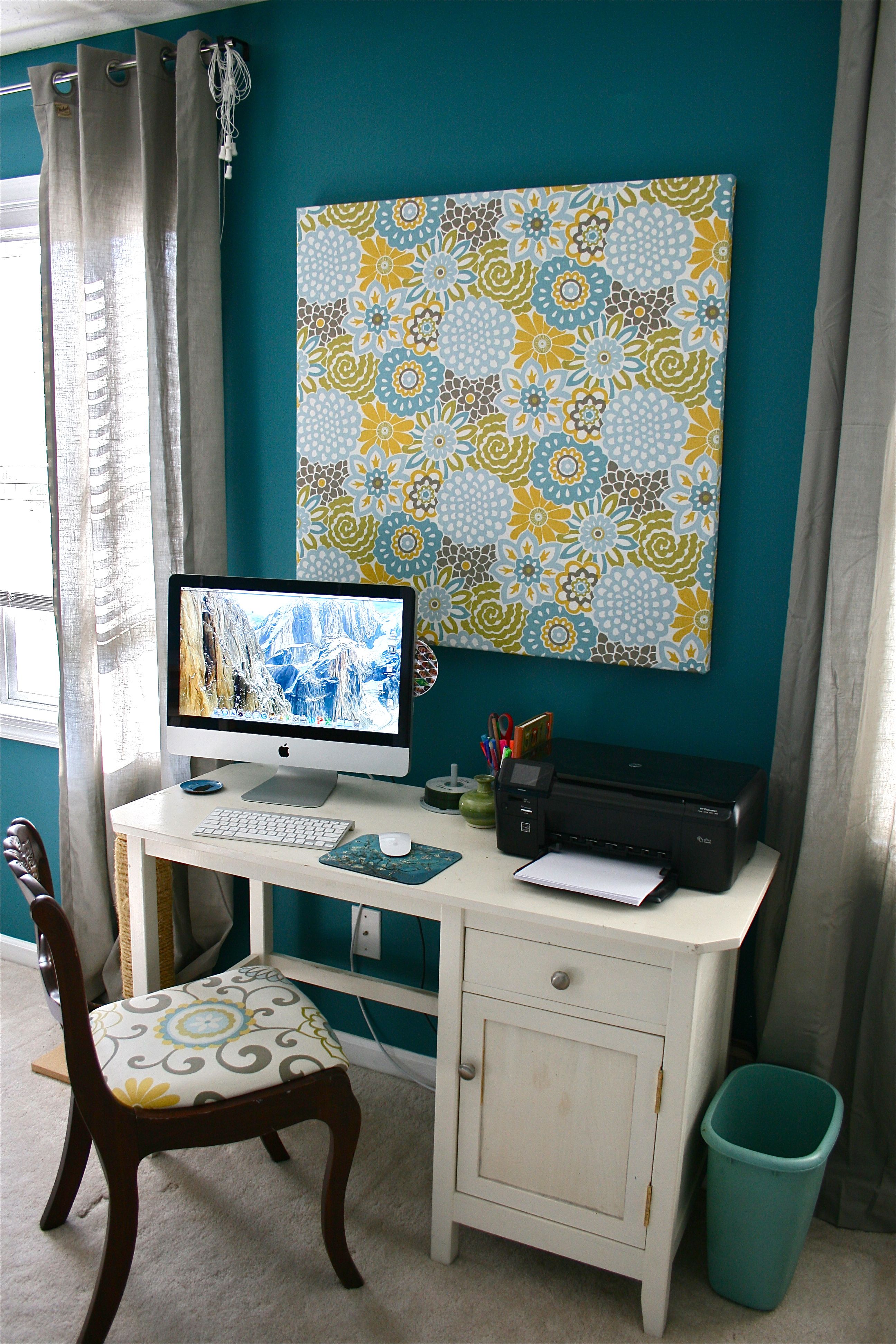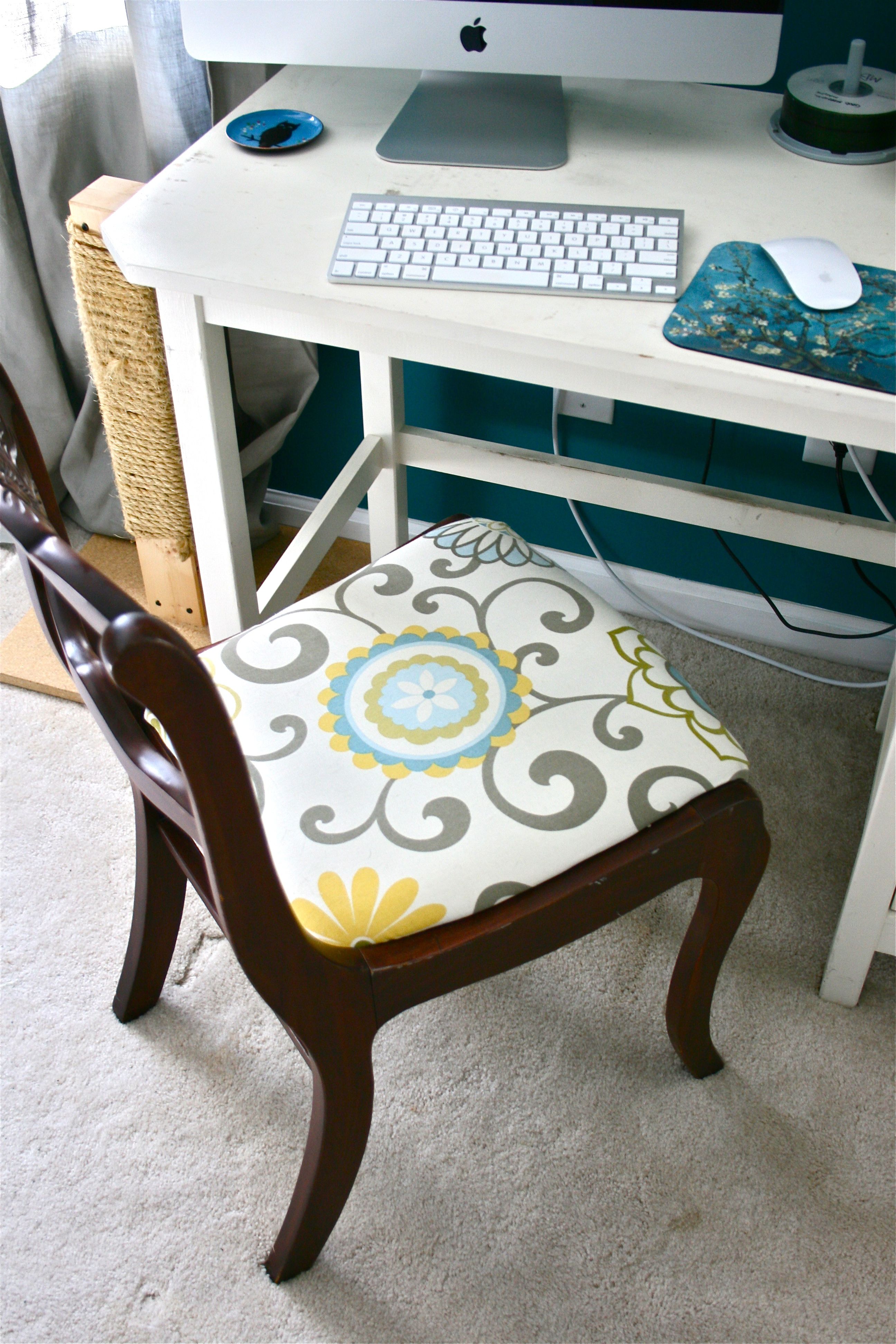 If you look back a few photos, you may be able to see how the two bulkiest pieces were along the same wall. By switching the desk and drafting table, we were able to displace all of that visual weight into a more diagonal line. Now you walk into the room and focus on the thin desk with its patterned chair (details of which are below) instead of the meaty table and shelving unit together – It all feels much more airy. Plus, the extra color and pattern in the desk chair give it a little more style that the plain bar stool simply didn’t have.