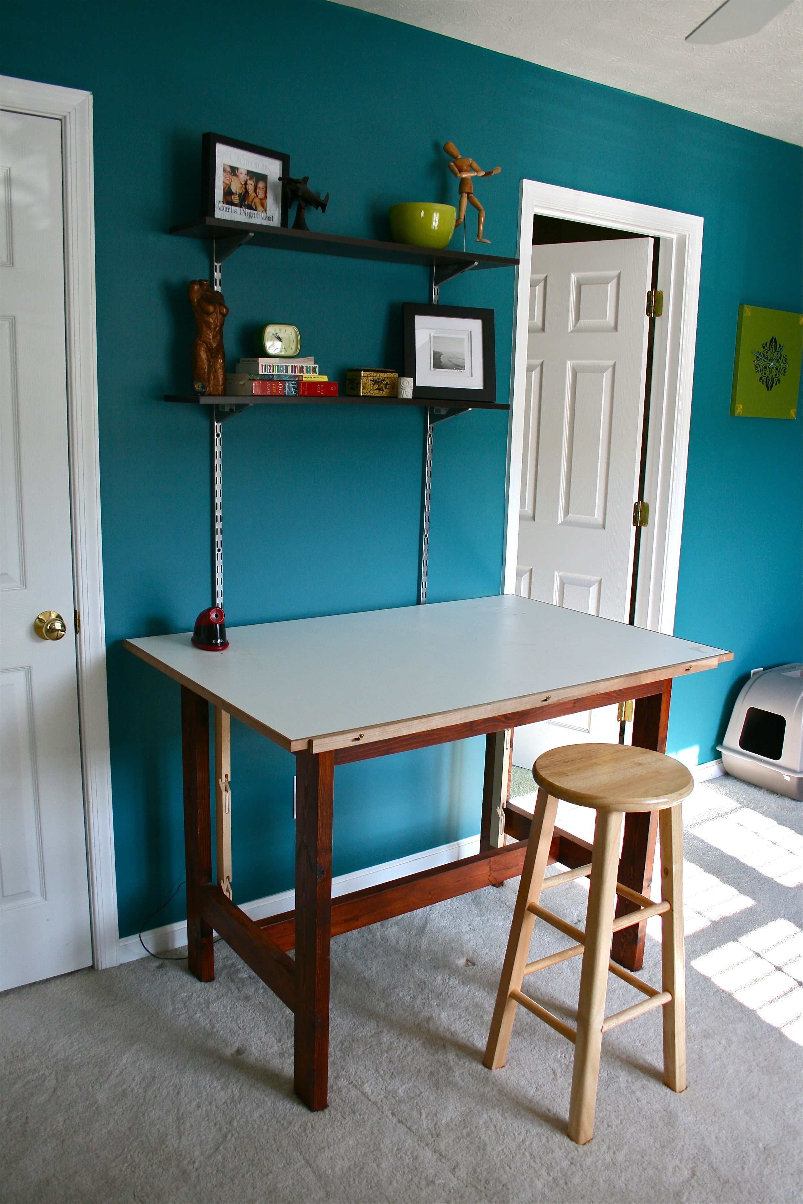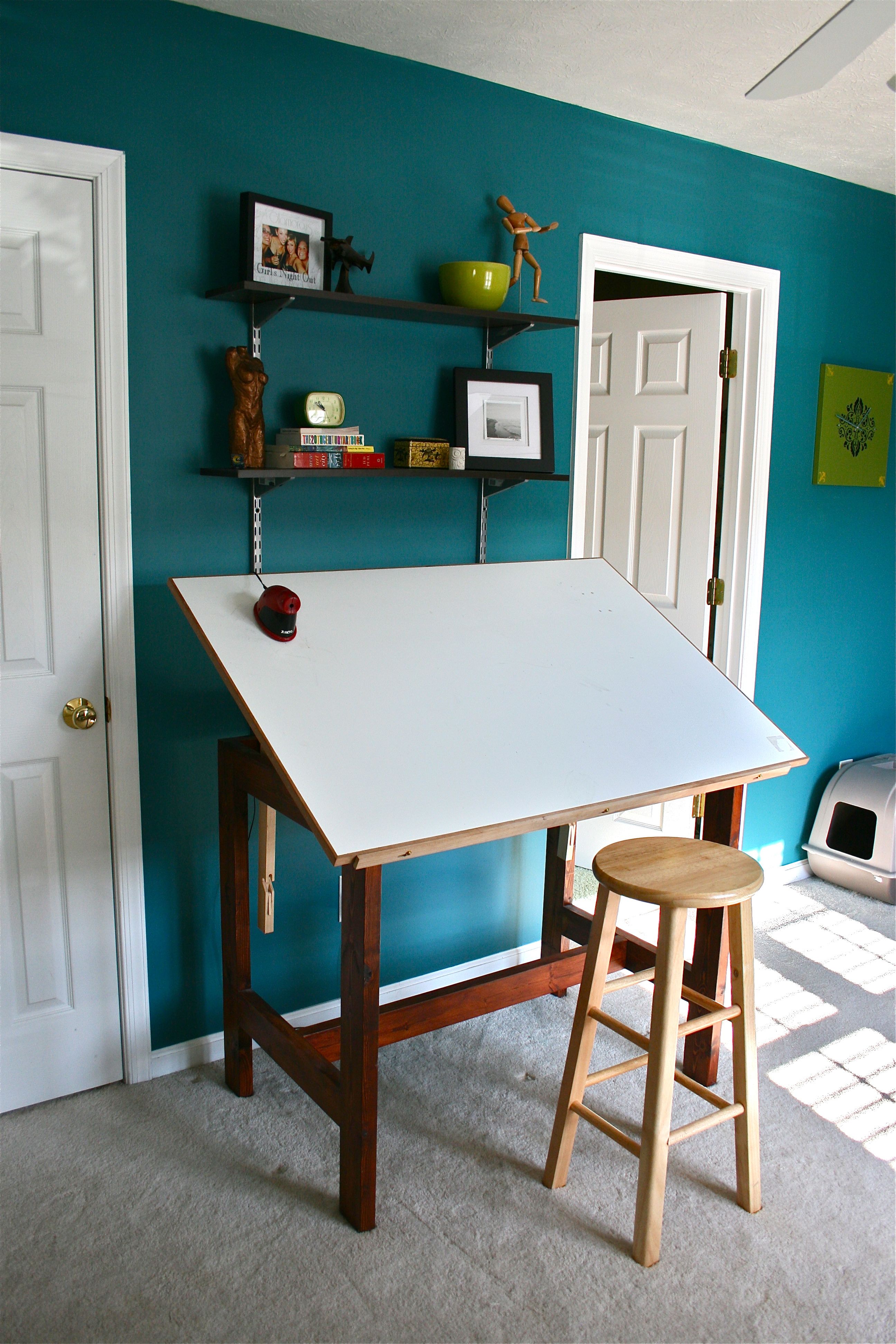 I had to remove one of the shelves from the wall unit because of the drafting table’s top – Its angle is actually adjustable so that, if I had left all three shelves up on the wall, the table top would have banged into it. Here it is down flat: