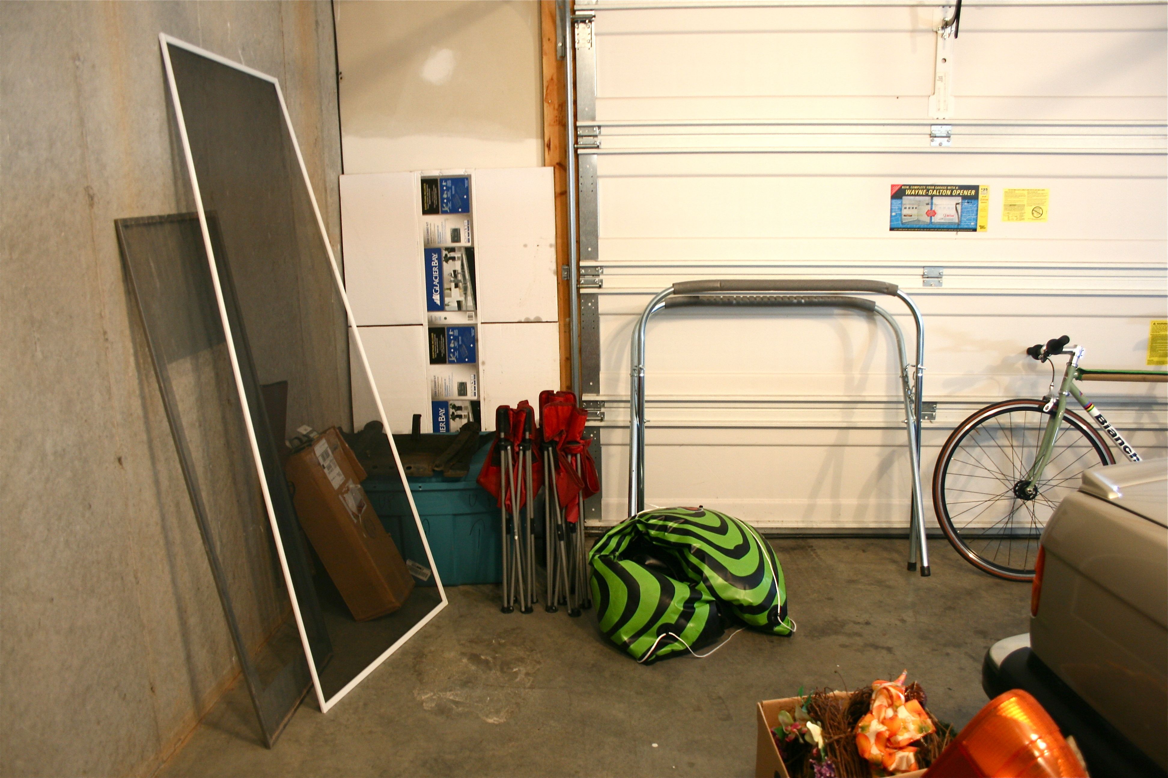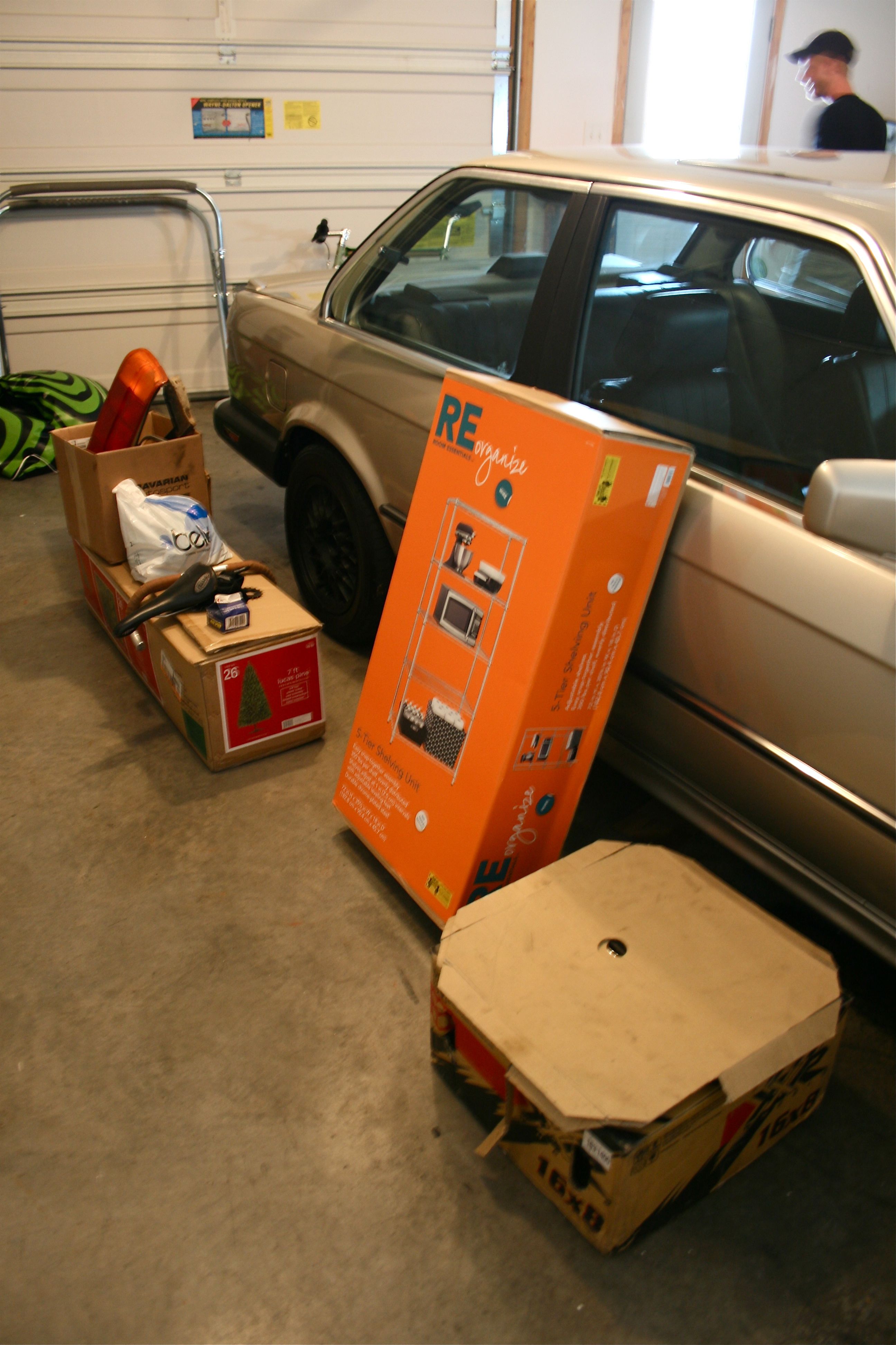 Oh, and John decided to get rid of the metal car-top rack, so we pulled it out and left it off to the side. That’ll be a fun project whenever we get around to it ::sarcasm:: Maybe you can’t exactly tell from the photo but it’s taller than John and I and weighs an INORDINATE amount of pounds…But it’ll be good to finally be free of it so that John can build the nice work bench he’s dreaming of along that wall. I think we’ll paint the wall too to cover up the exposed, stained concrete.