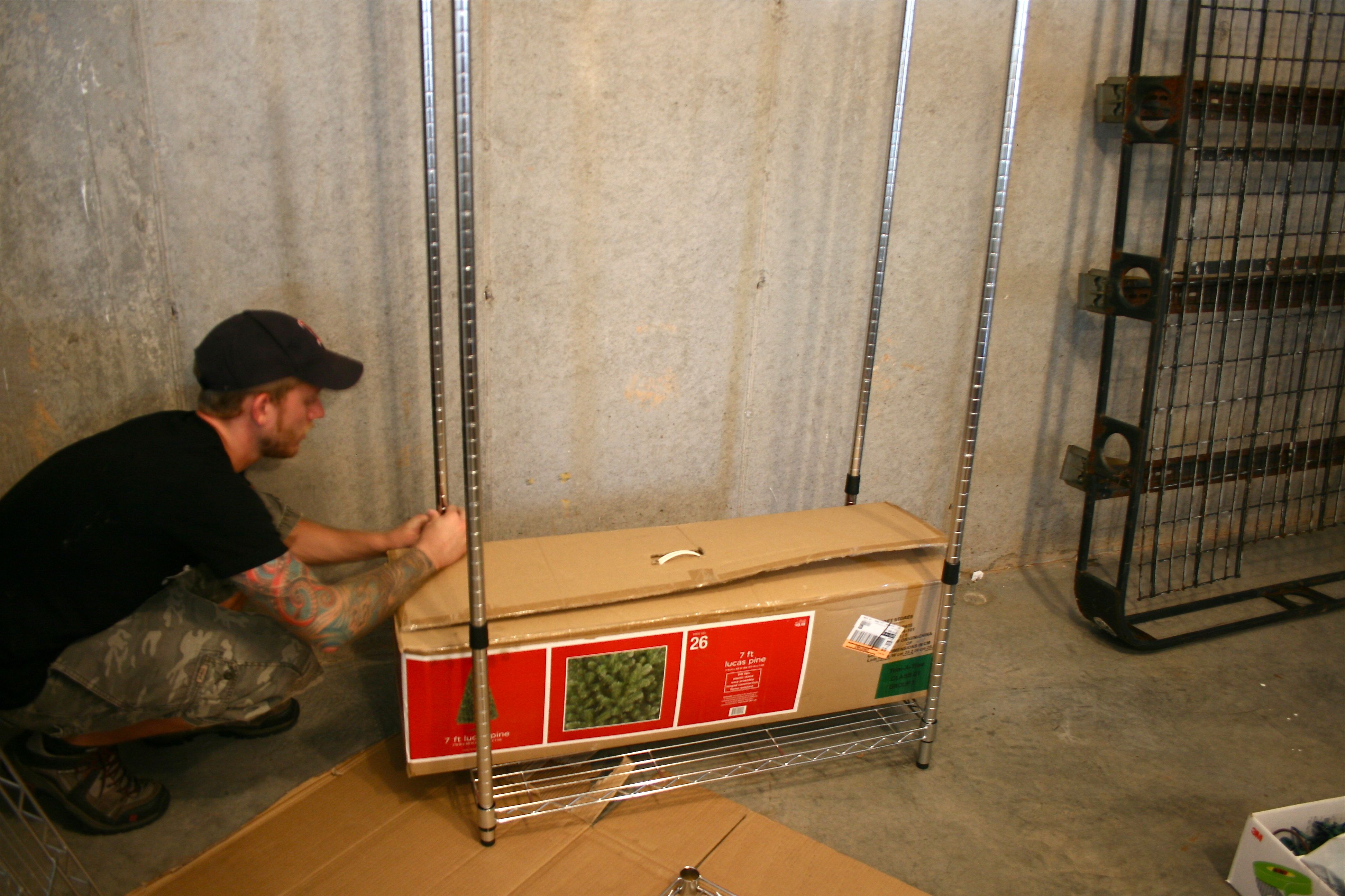 Once we had the bottom and sides in place, we put our heaviest and bulkiest item (which happened to be the Christmas tree) on the shelf to see where the next one should sit above it.