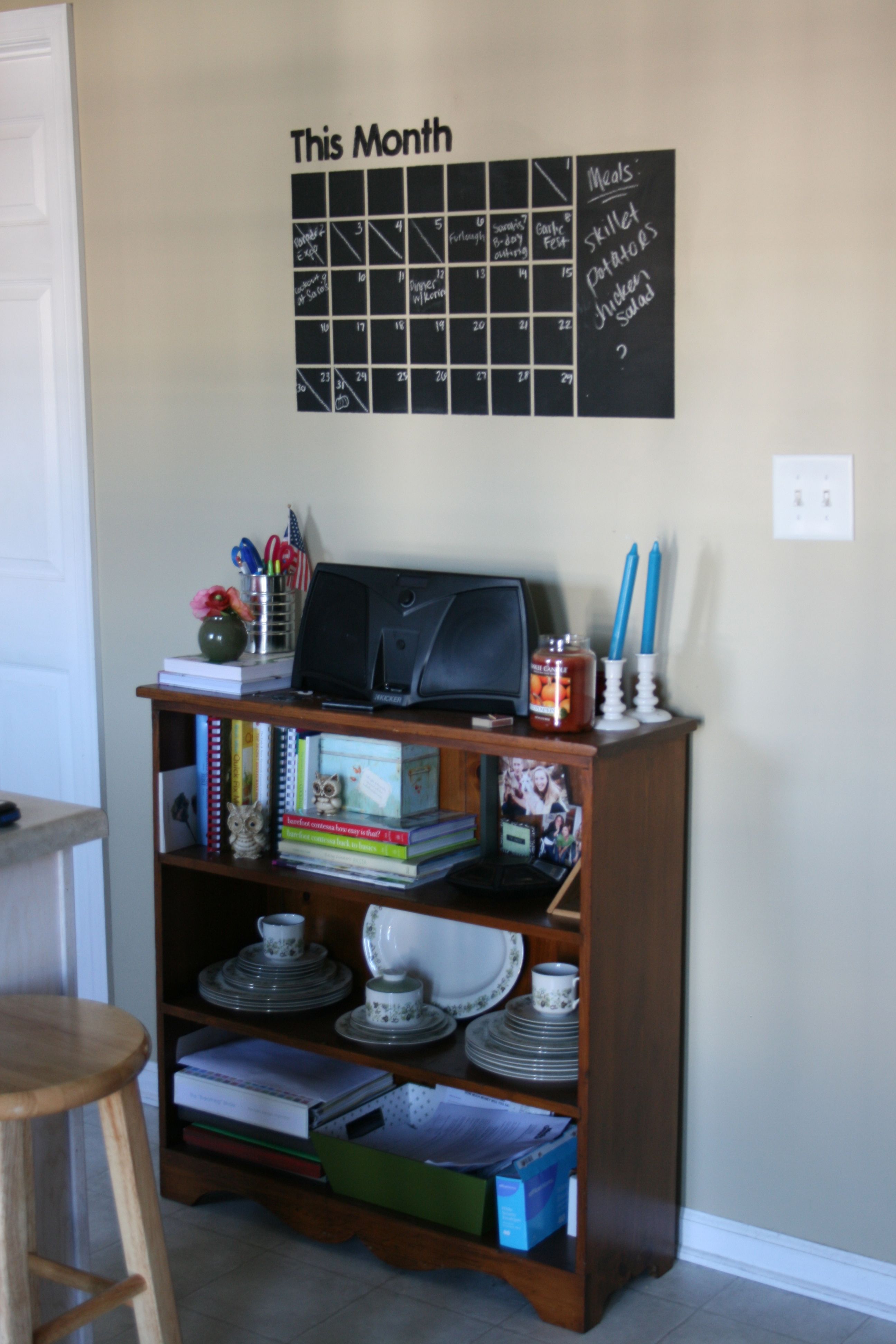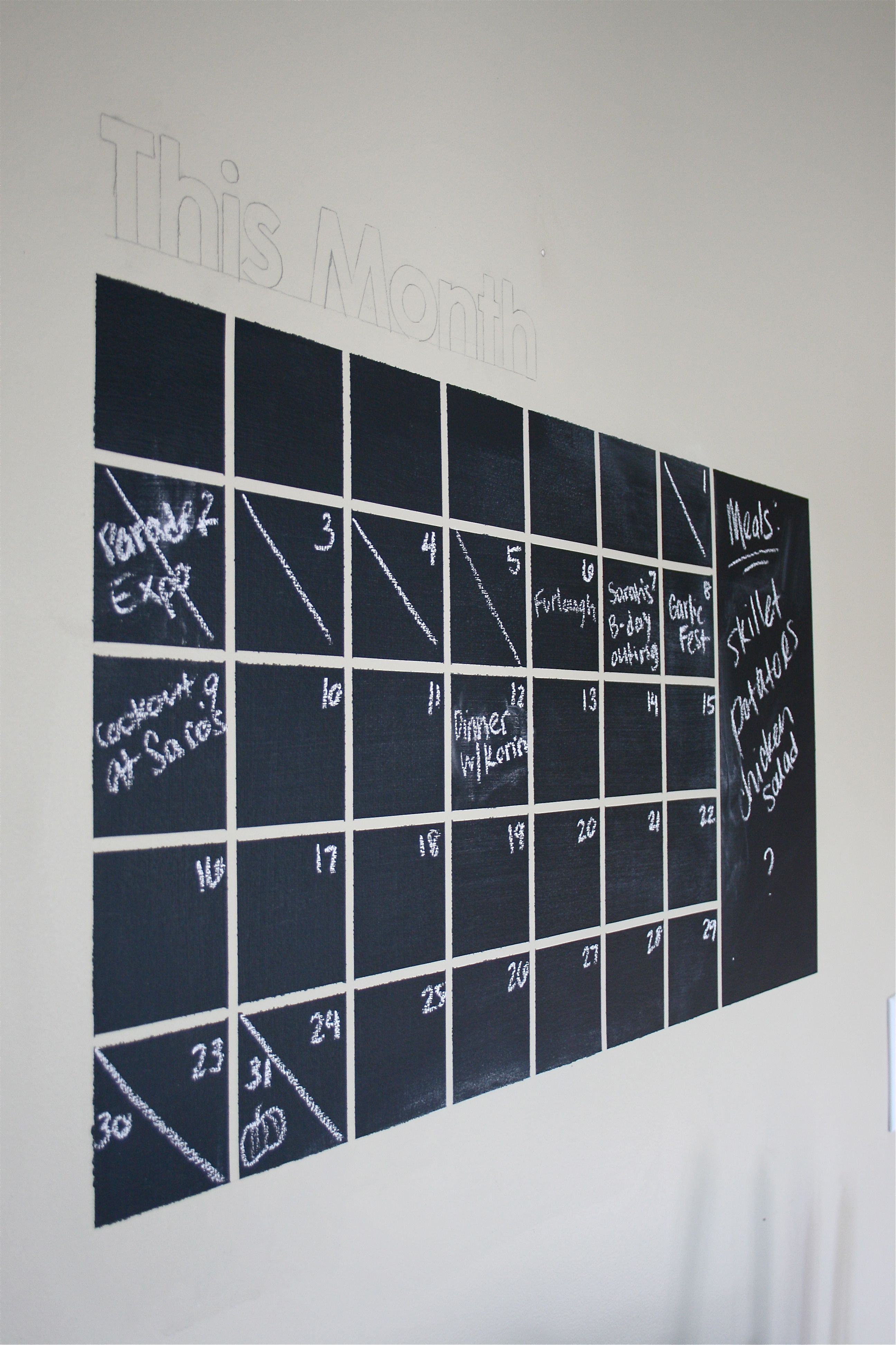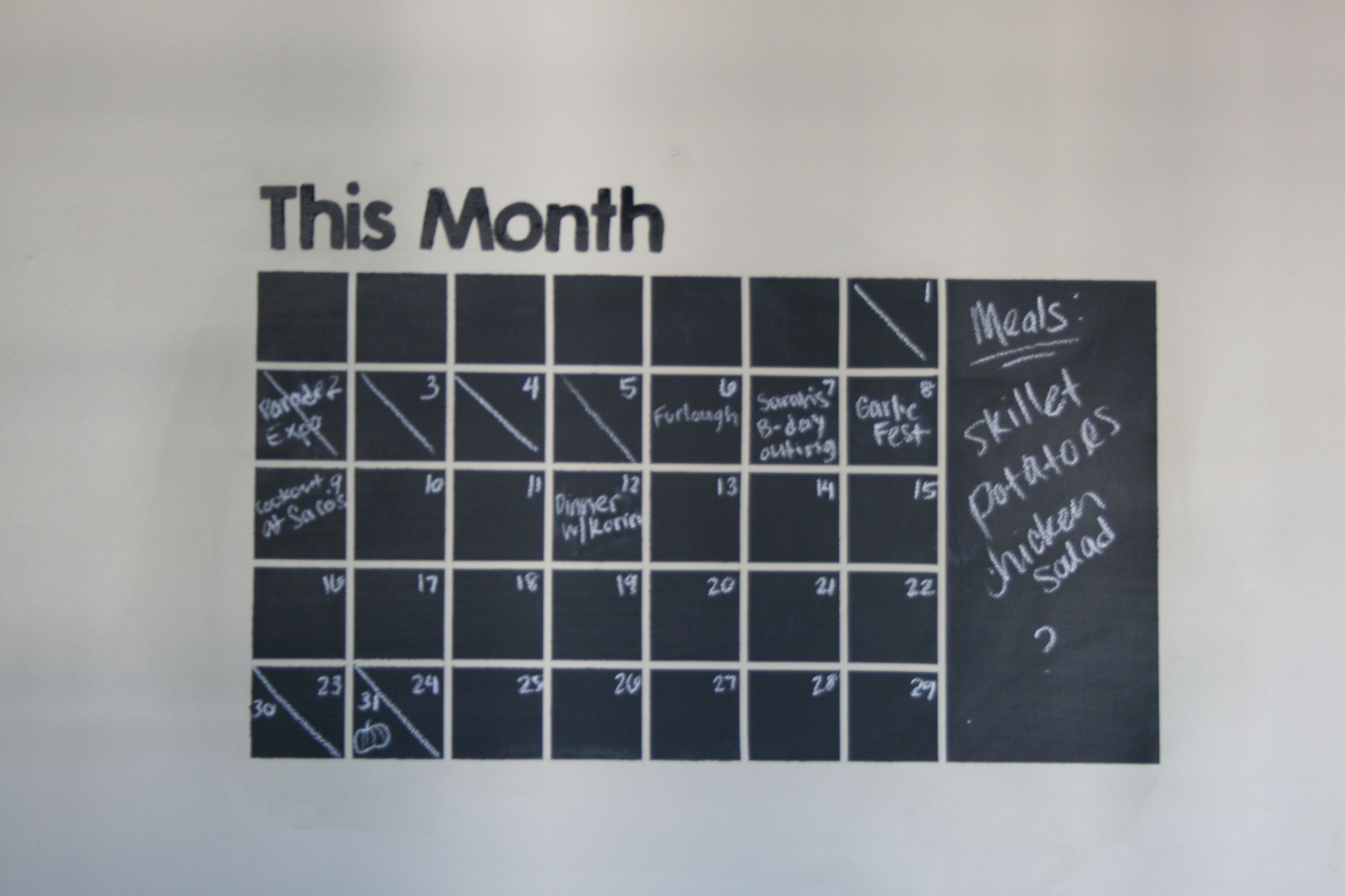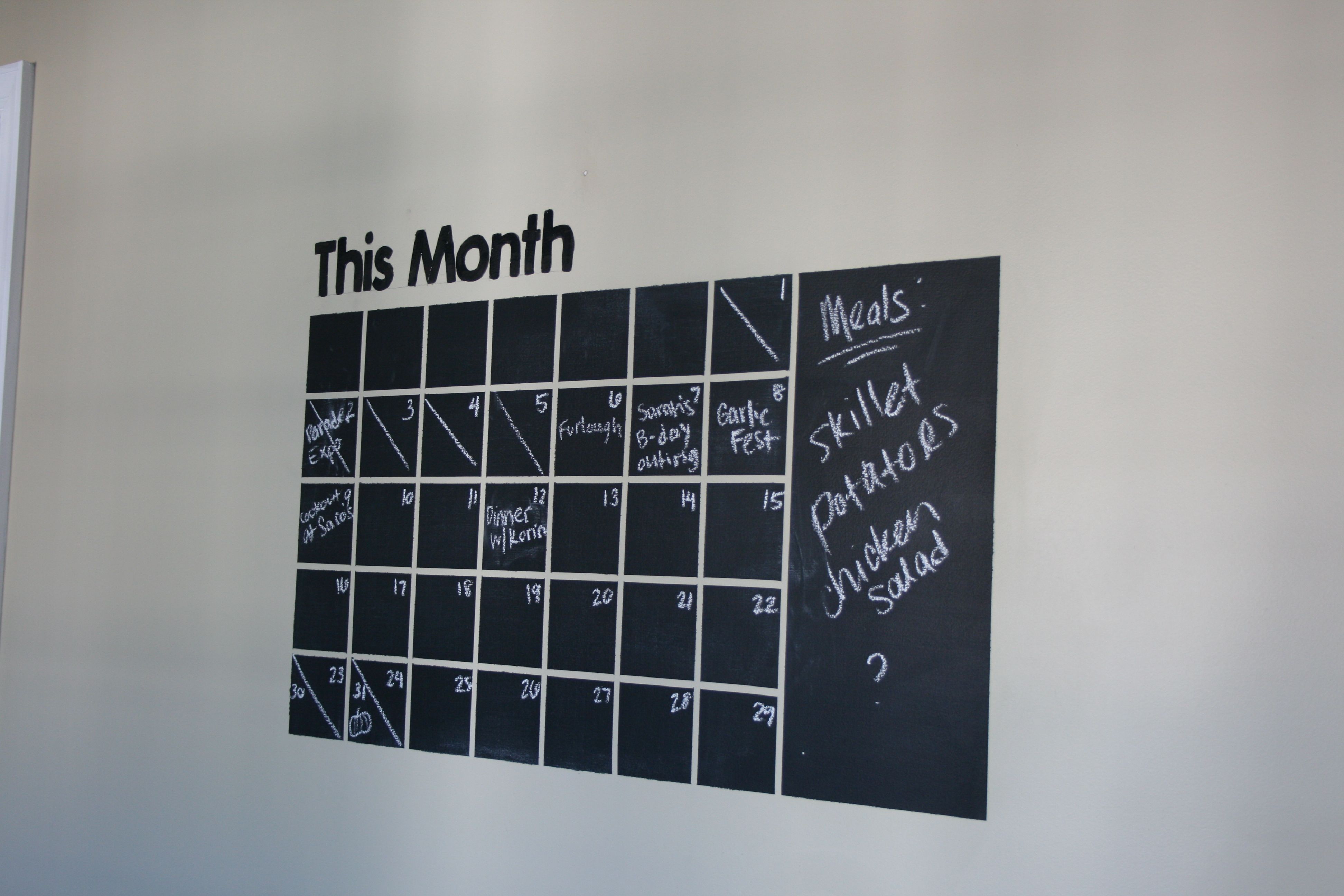 For those of you who are just tuning in, we started this project last April. The idea was to create a chalkboard calendar on the wall in the kitchen with a larger memo section off to the side. I had seen it on Etsy one day during my many wasted hours browsing the website and decided that I wanted to try it out for myself (see the listing for the product here). So, with a roll of SUPER thin (and hard to track down) automotive tape and a quart of chalkboard paint, John and I took one morning to paint it on the wall. John did the measuring since he’s the precise one in this relationship, and I took over the painting.