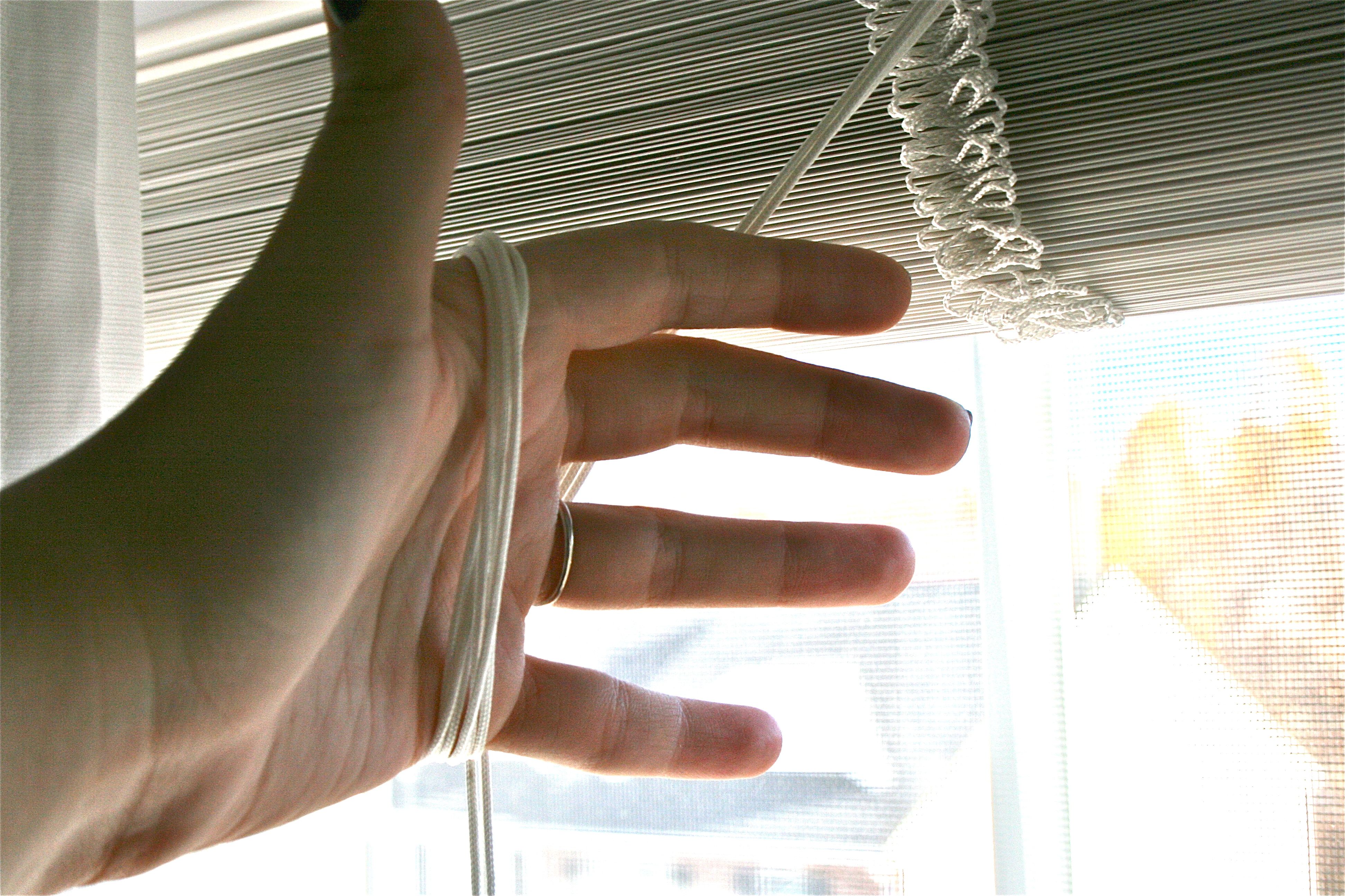 As you can see, I’ve rigged the long thin strings into the curve of the curtain rod hardware so as to keep them out of the way. If I were to let them fall loose, like so…
