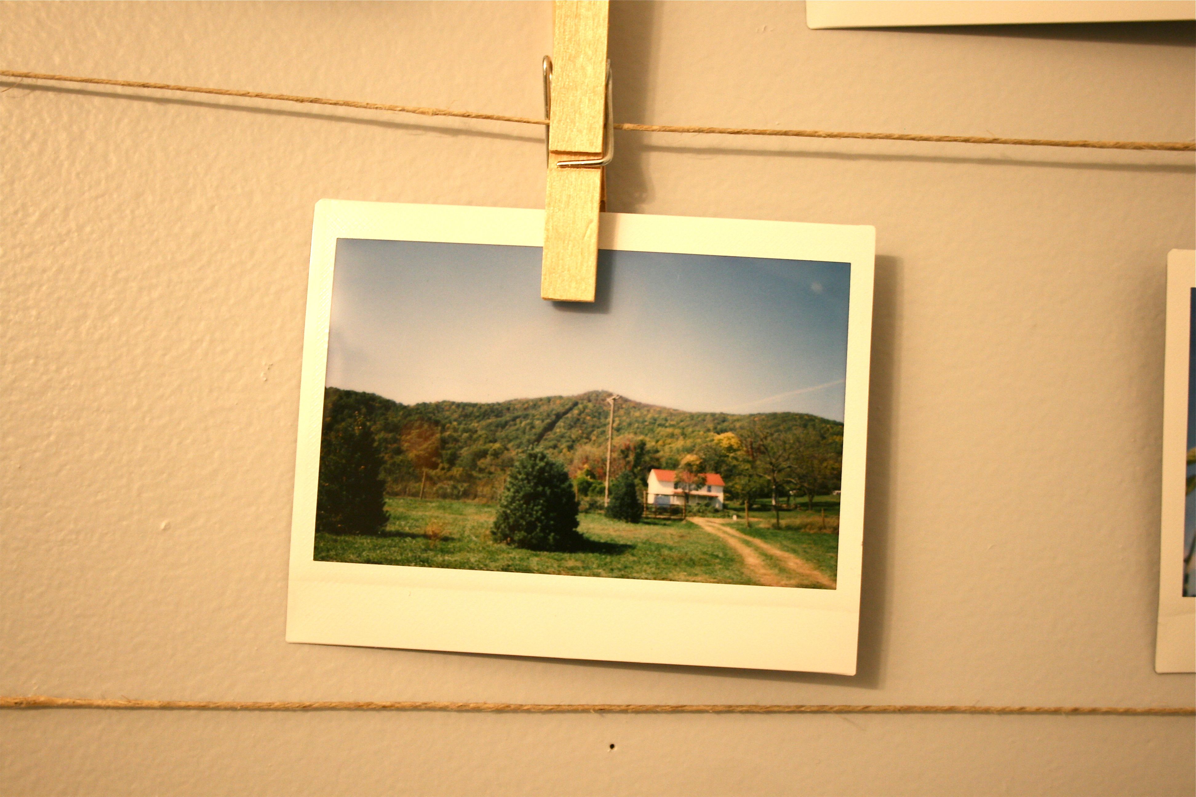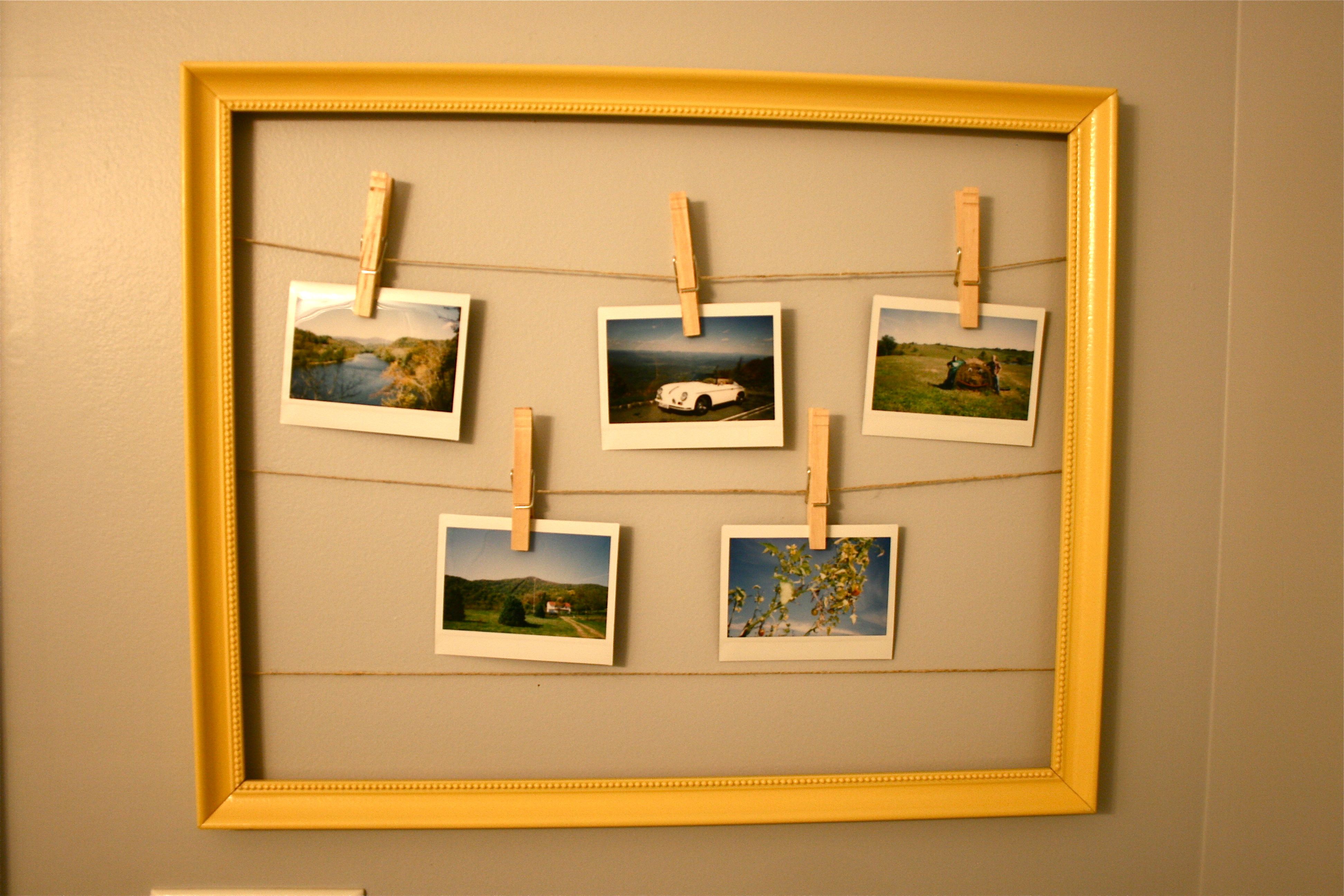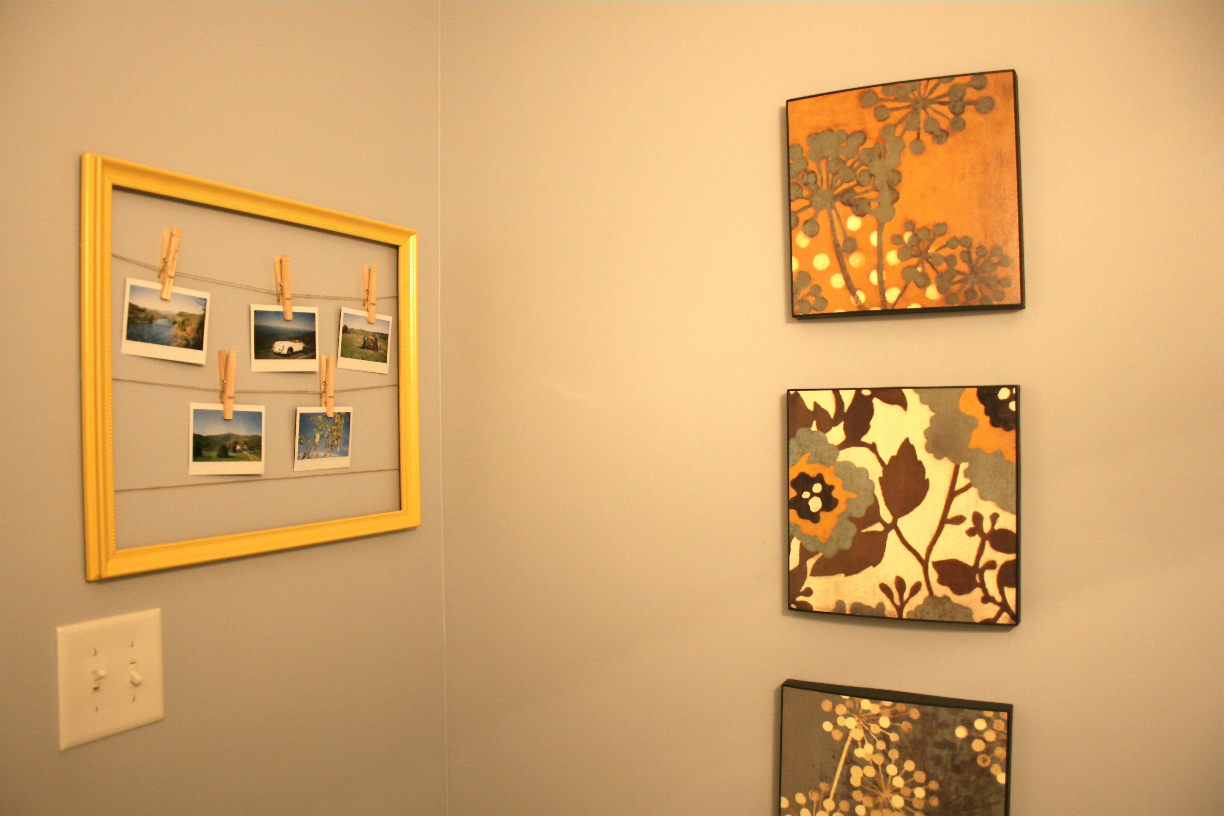 It seemed simple enough – Hang your polaroids inside of an old frame as though it’s a clothesline, using twine and clips. Only problem was where to put it…We are quickly running out of wall space, what with our gallery wall in the foyer, the new staircase gallery, the art in the upstairs hall, the plate wall in the kitchen, etc. etc. But there was still one space that hadn’t been filled – That is, in our main floor powder room. We have one set of artwork from Target, but the adjacent wall was blankedy-blank-blank.