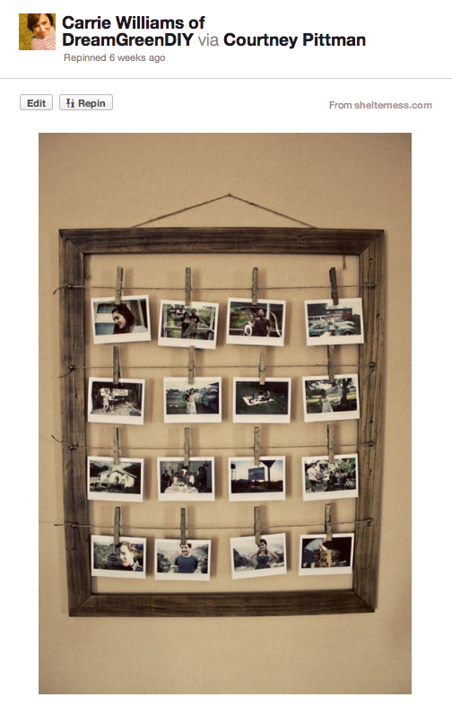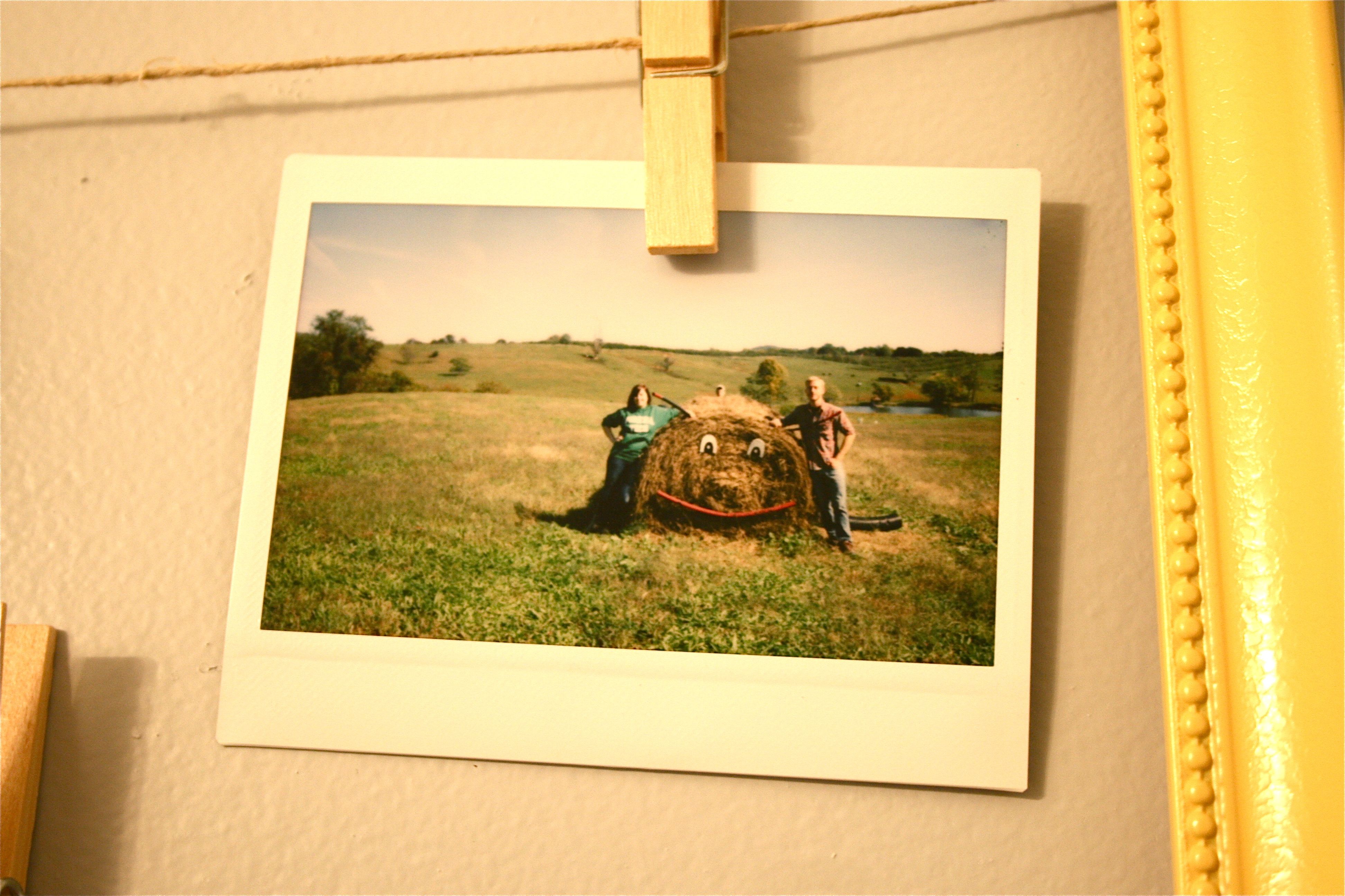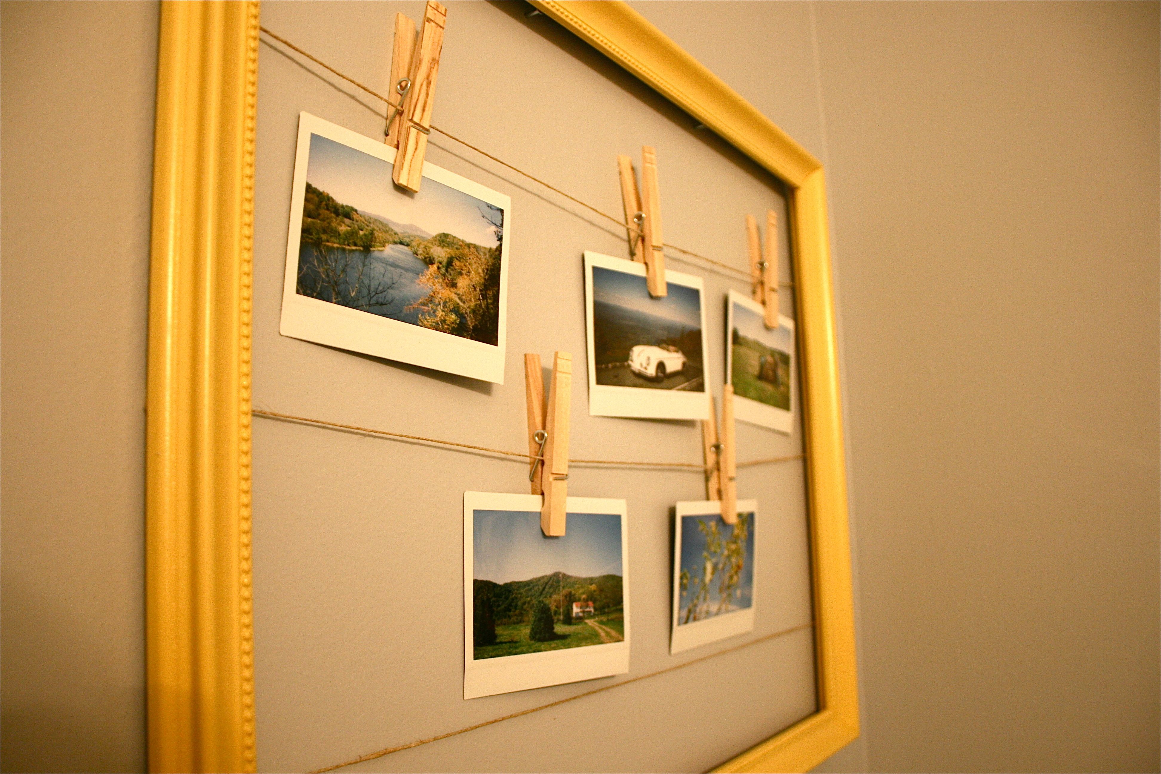 It seemed simple enough – Hang your polaroids inside of an old frame as though it’s a clothesline, using twine and clips. Only problem was where to put it…We are quickly running out of wall space, what with our gallery wall in the foyer, the new staircase gallery, the art in the upstairs hall, the plate wall in the kitchen, etc. etc. But there was still one space that hadn’t been filled – That is, in our main floor powder room. We have one set of artwork from Target, but the adjacent wall was blankedy-blank-blank.