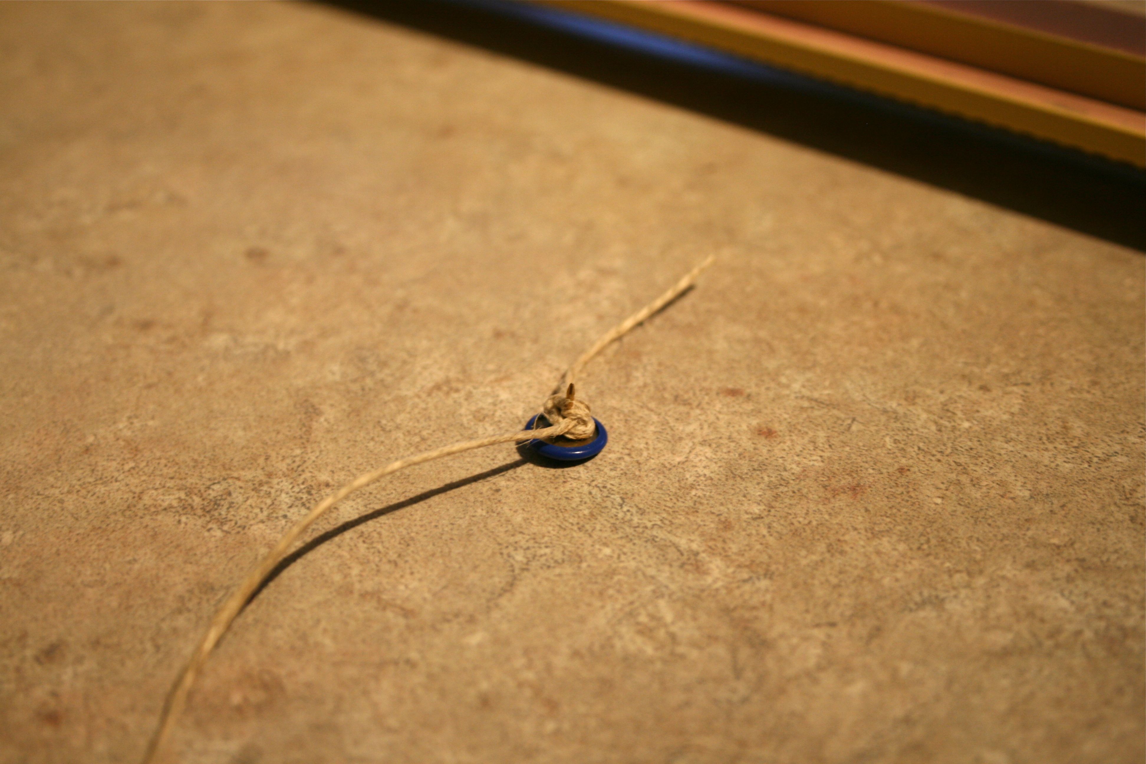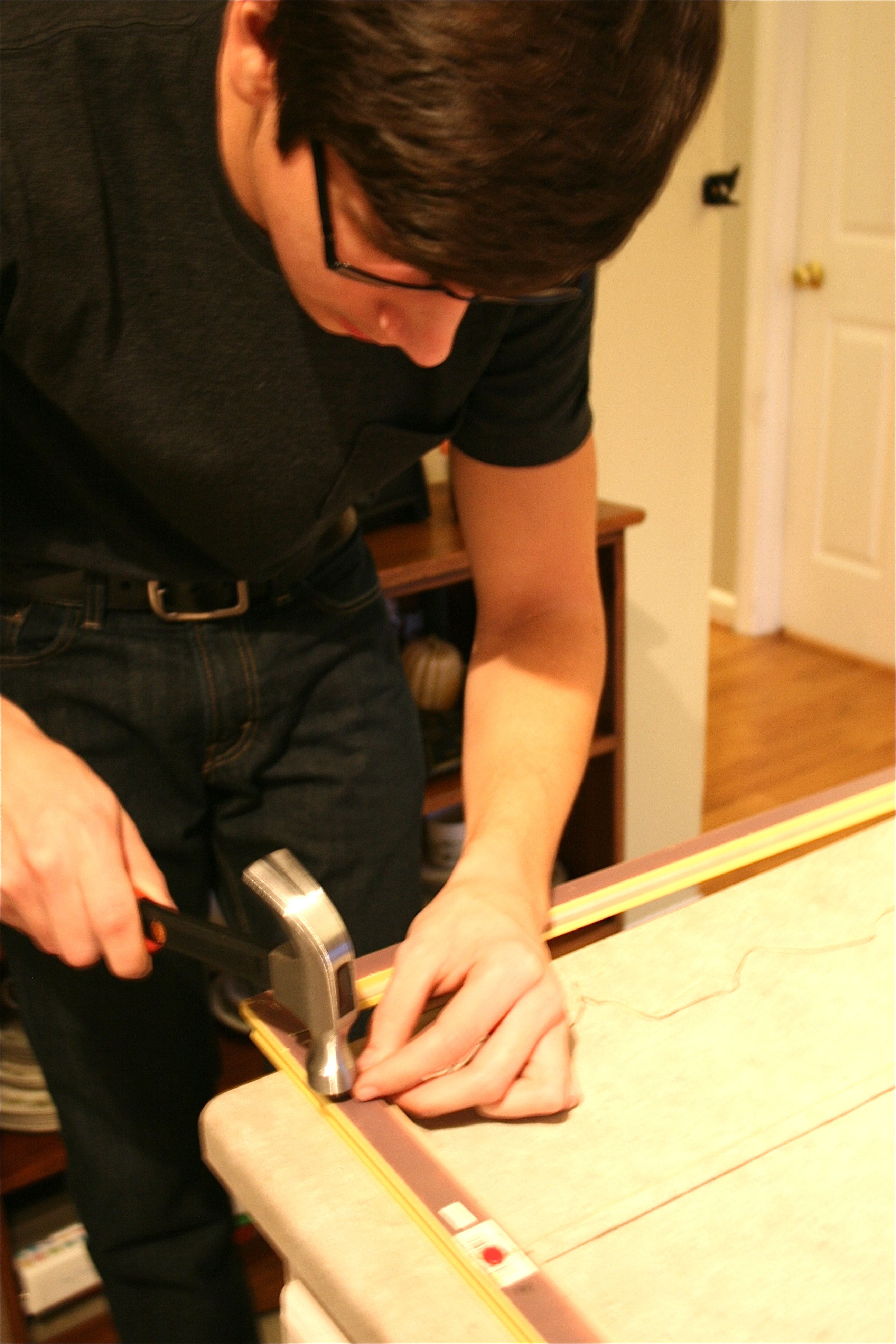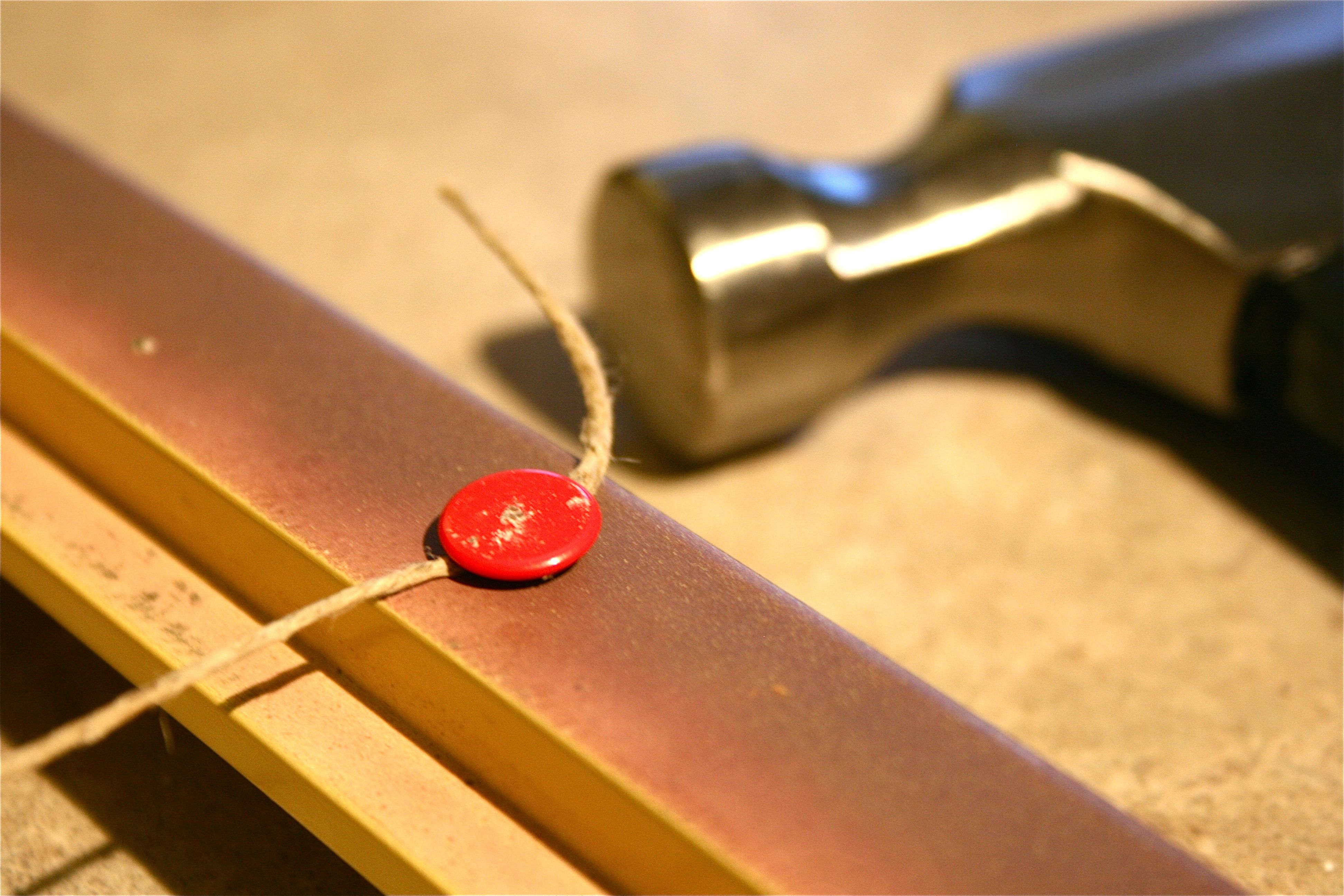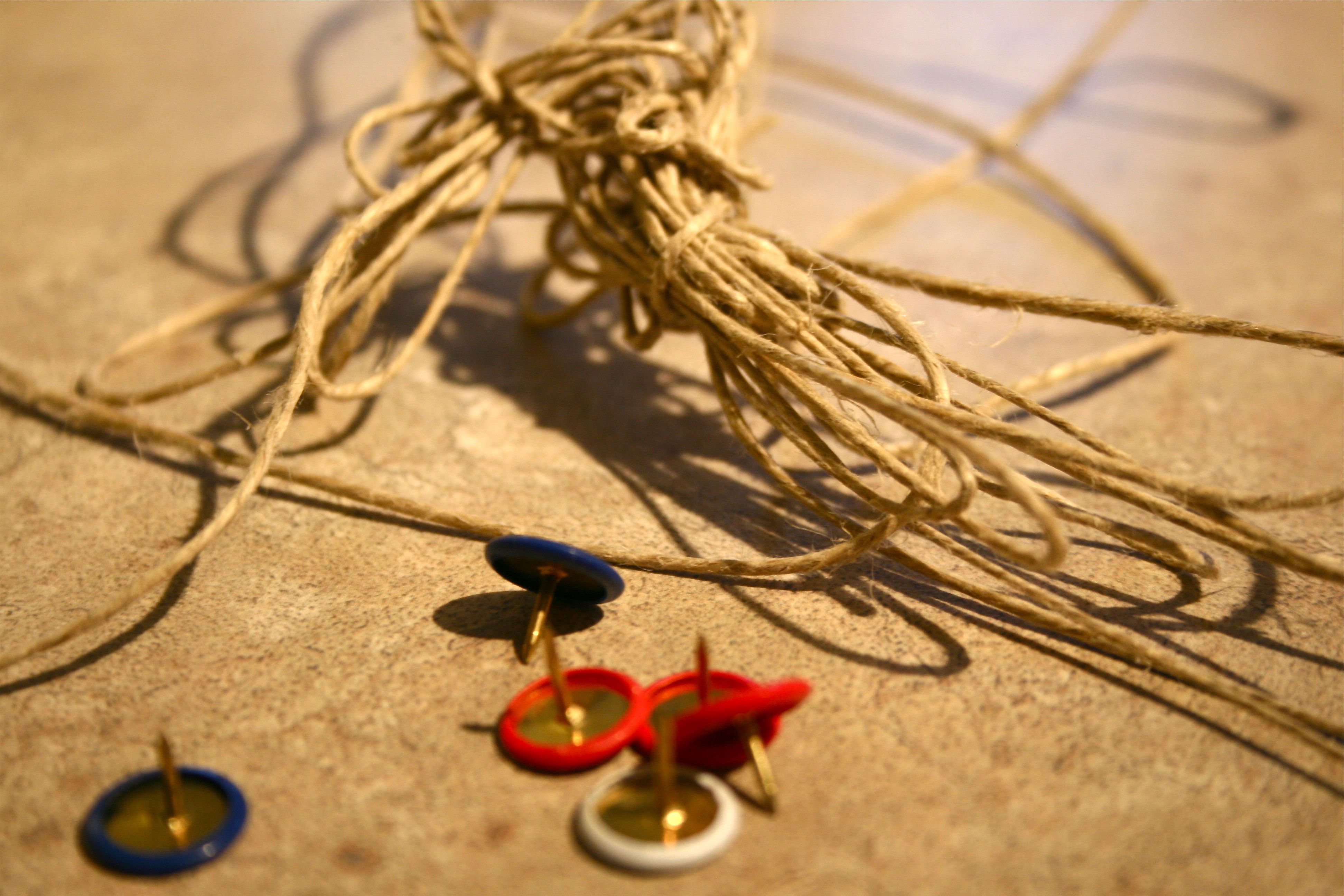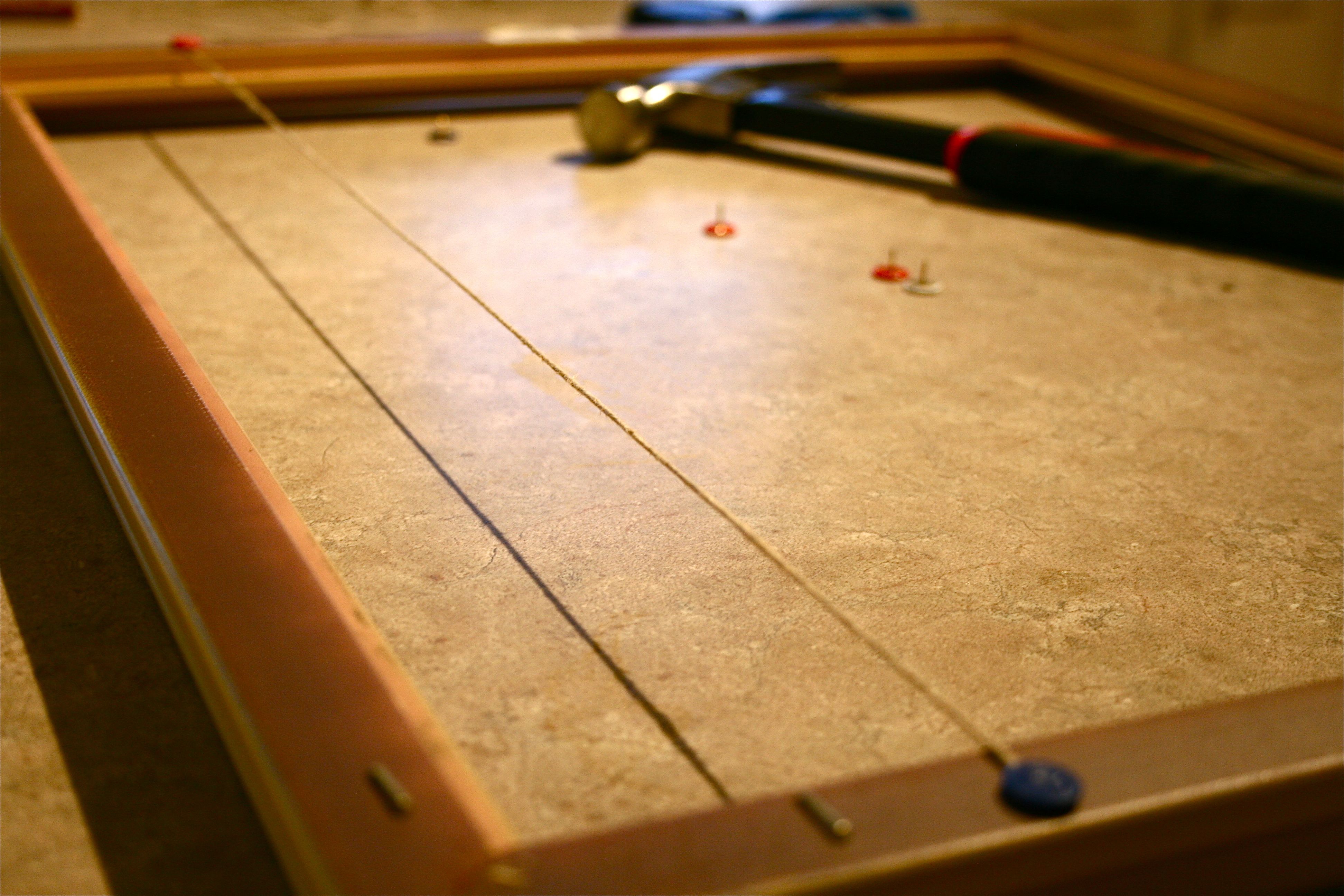 The only other things I needed were twine and push pins. It was very simple – Just tie a knot in the twine, push the pin through it and then hammer it into the back of the wooden frame. Then pull the string taught and straight across the frame and hammer in another pin. I had a few mishaps with bent and damaged pins, but John’s best friend, Luke, helped me out with his steady hand and gung-ho spirit.