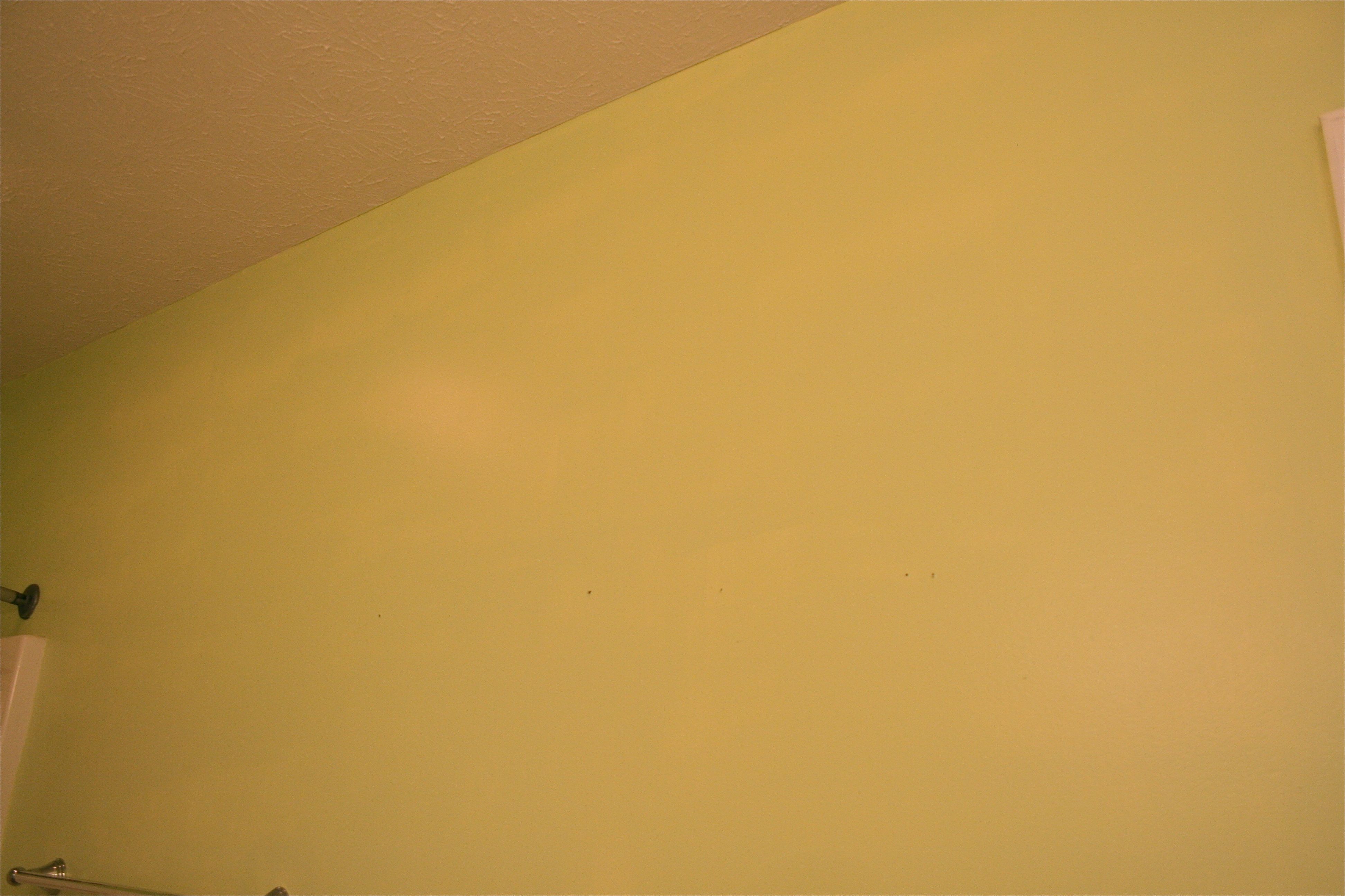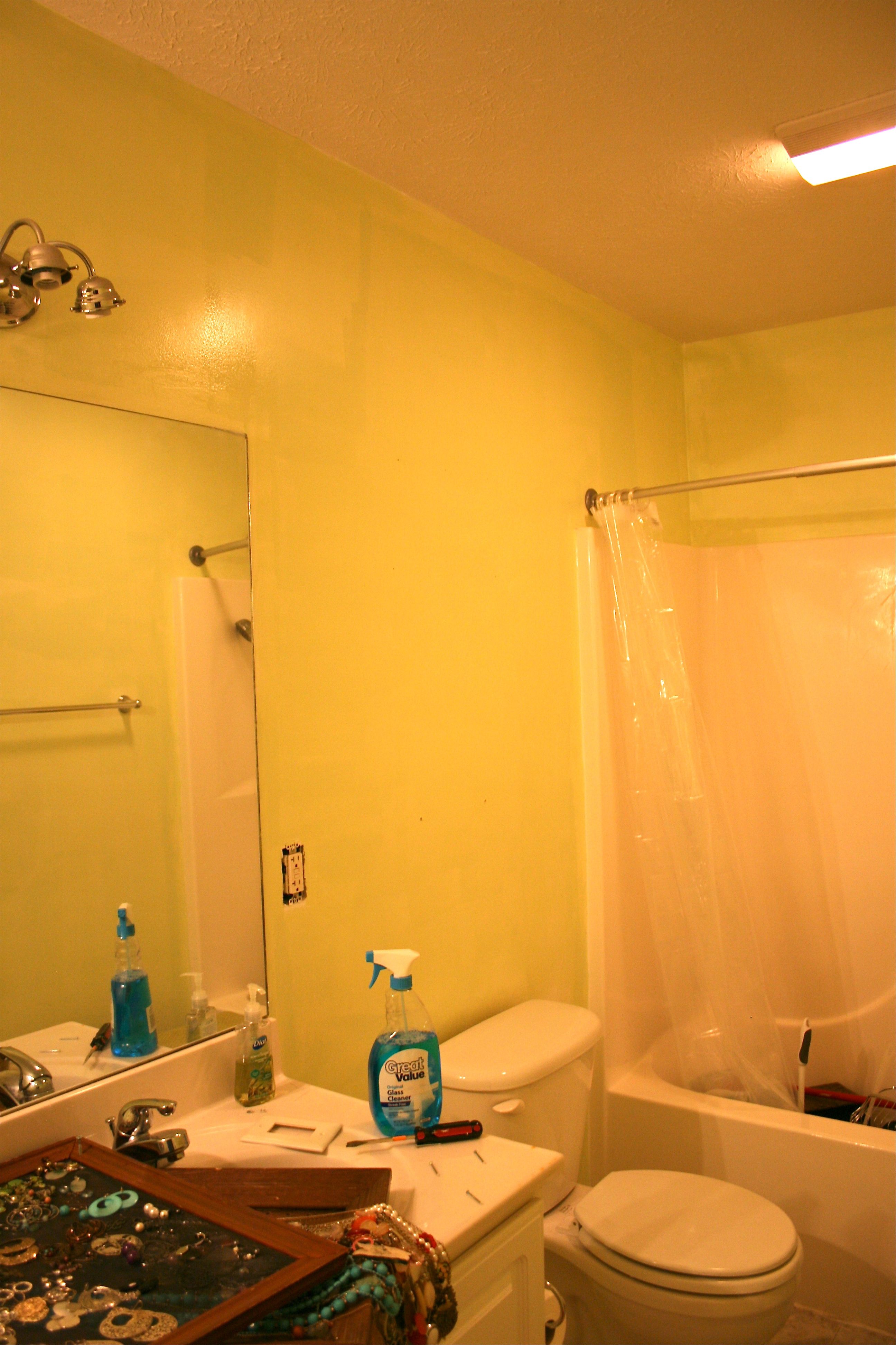 But back to the walls…I woke up early yesterday morning to roll on the second and final coat and then went out shopping with John for a new shower curtain and some green hand towels to coordinate. By mid afternoon upon further inspection, I quickly realized that what I thought was a “final” coat was definitely NOT. You may be able to see the splotches and uneven color below…
