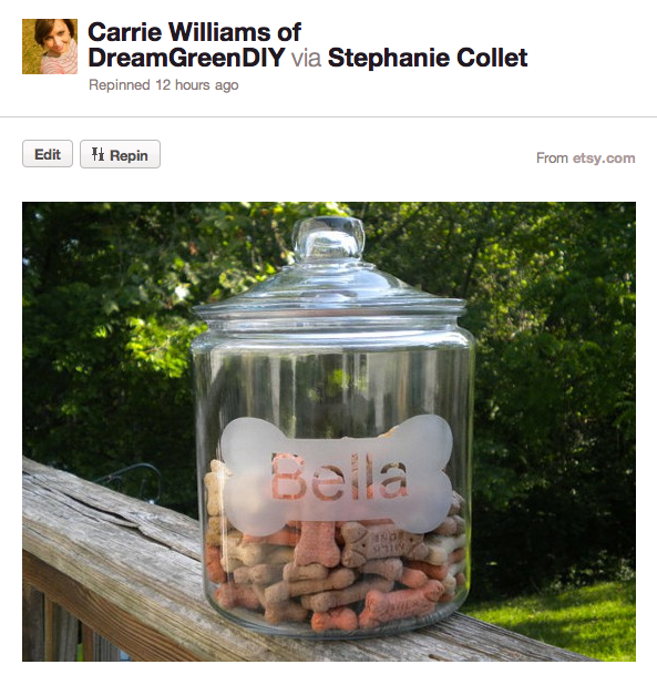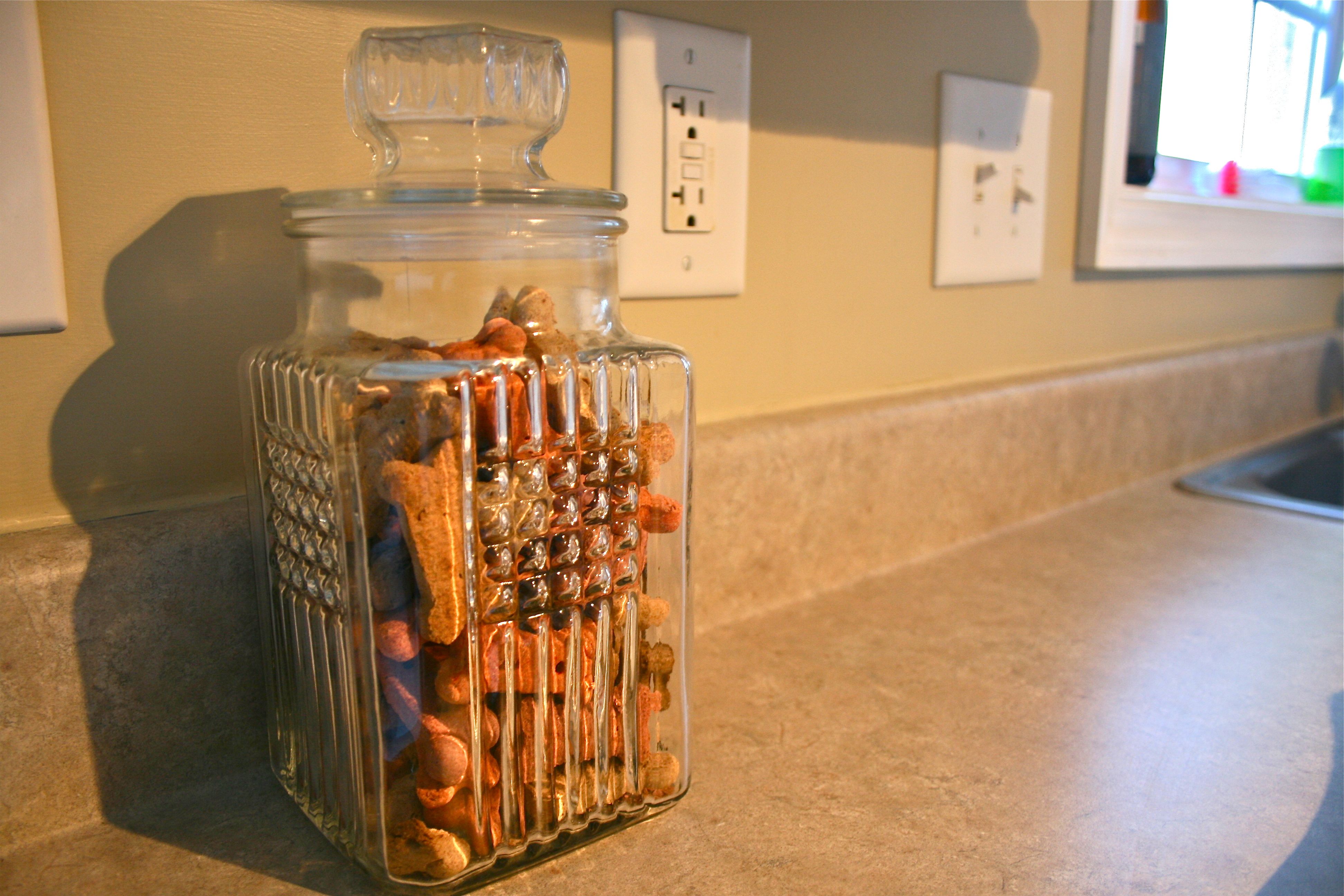 Come on now. TELL me dog treats don’t look so much fancier inside pretty glass jars!!! Although I love the smooth finish and frosted pet name on the first one, I found a jar that is just perfect for our home and style.