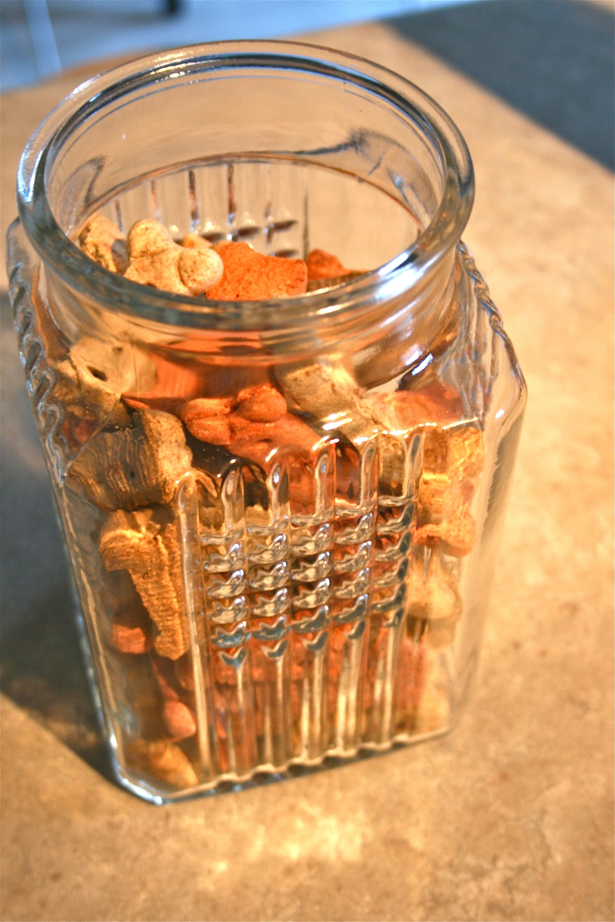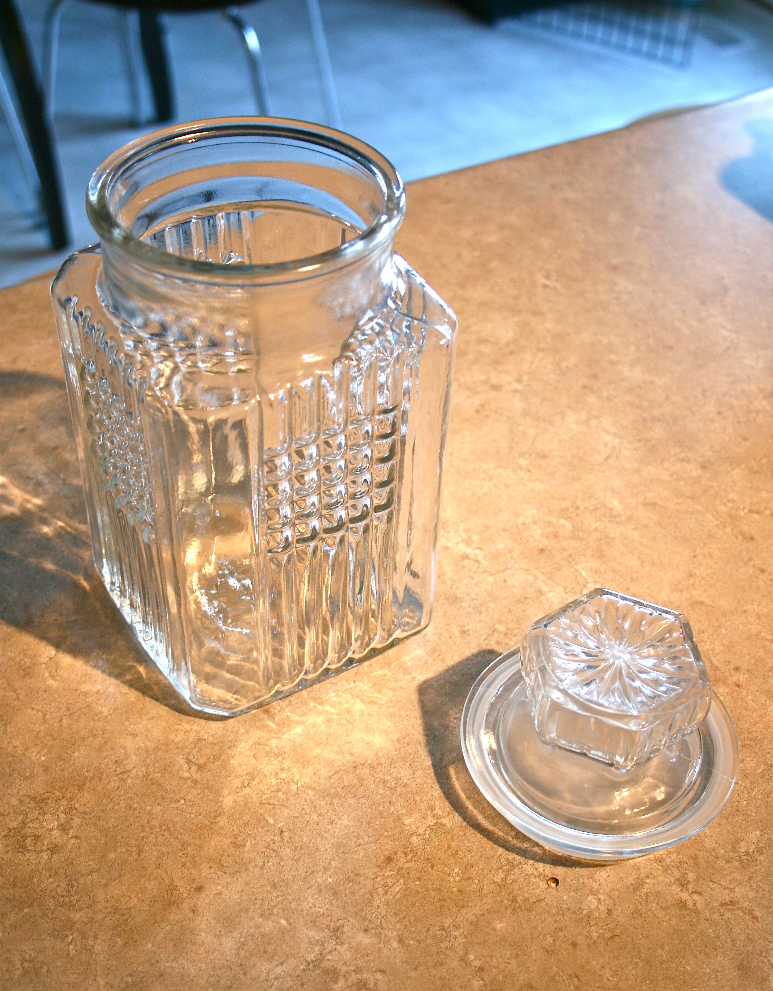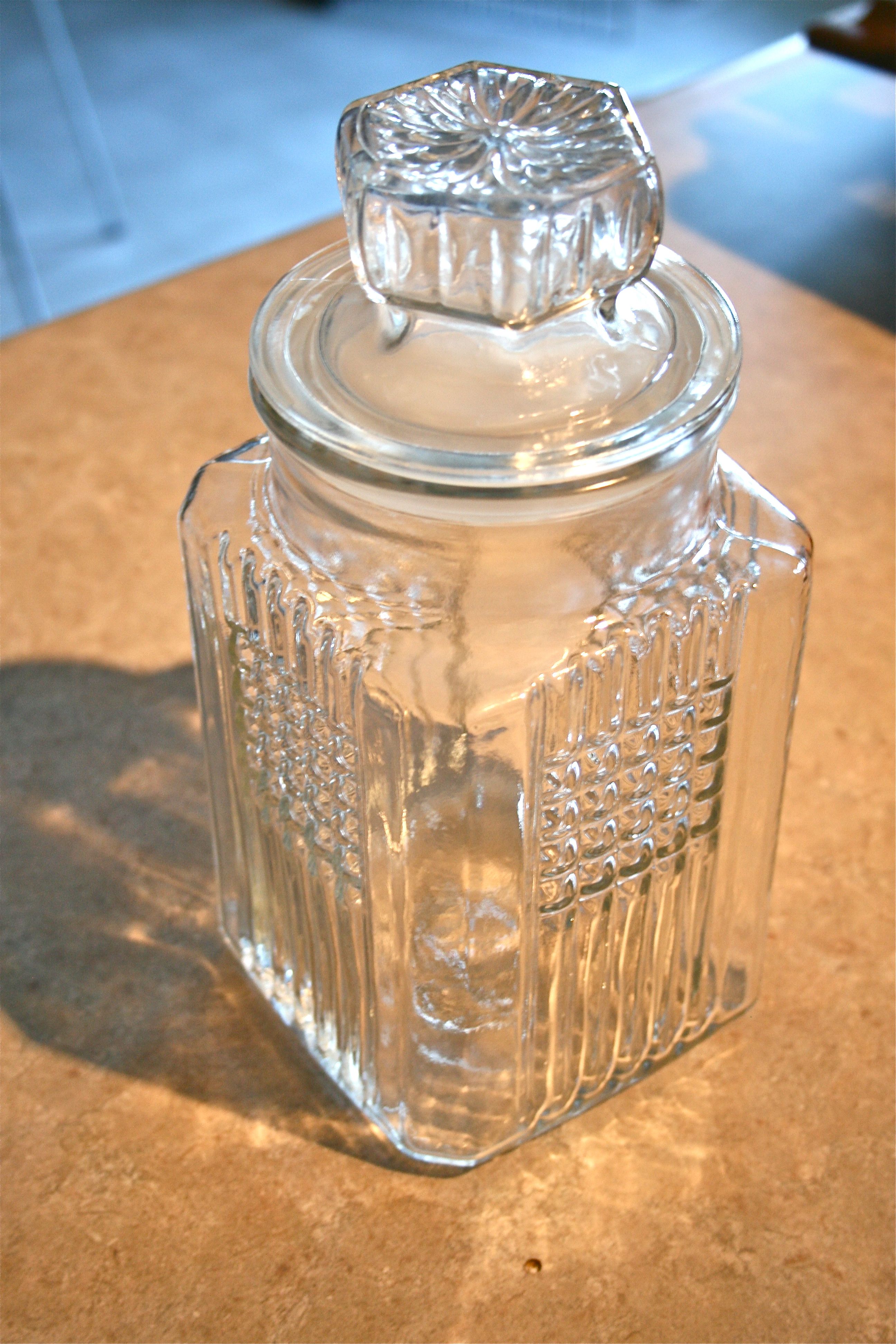 It only cost $5 and is just BEAUTIFUL! At least we think so. It’s got this great squared Art Deco etching in the glass and is pretty roomy, standing about 8 inches tall. The top, which fits snuggly into the neck of the jar, keeps treats fresh and tasty.