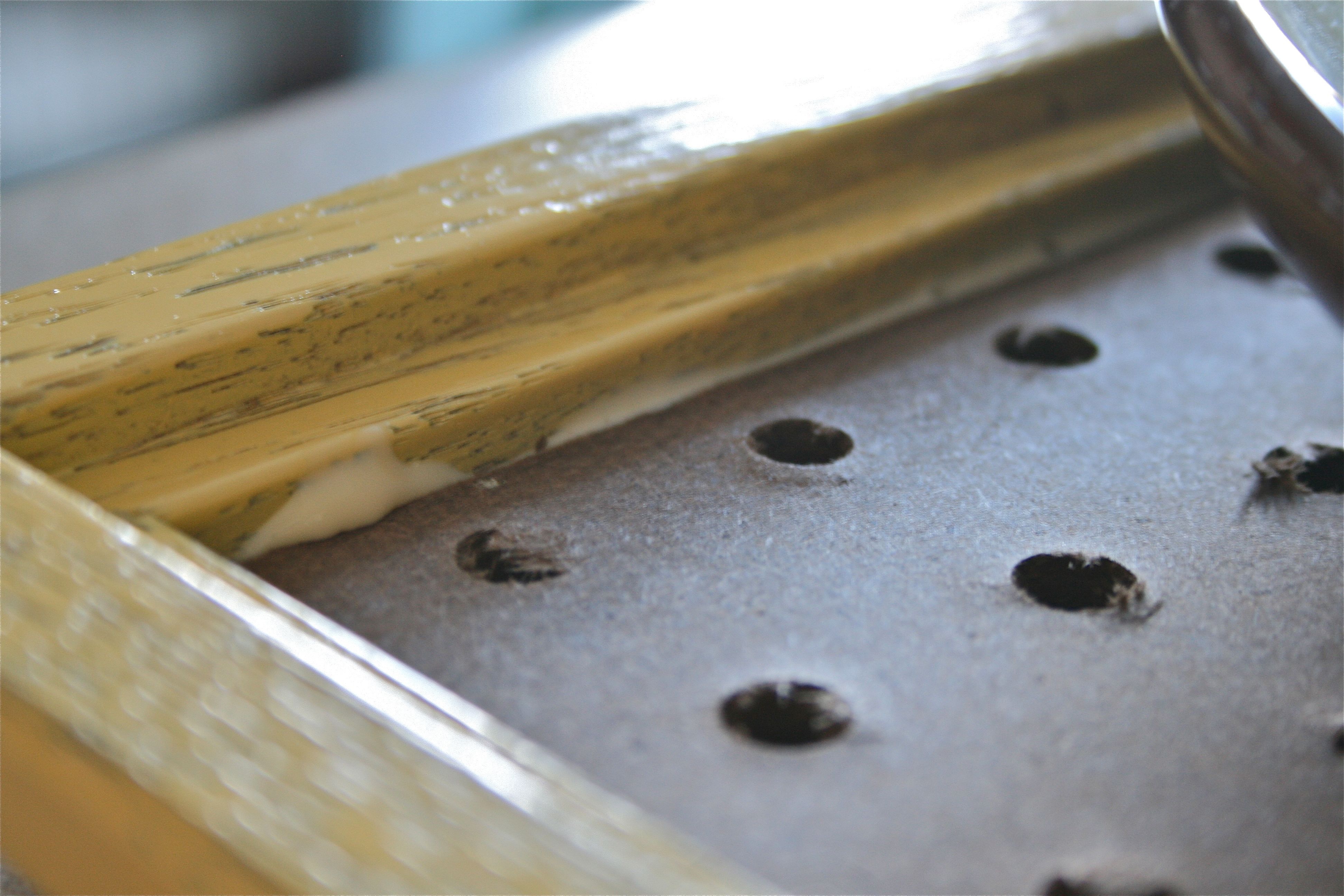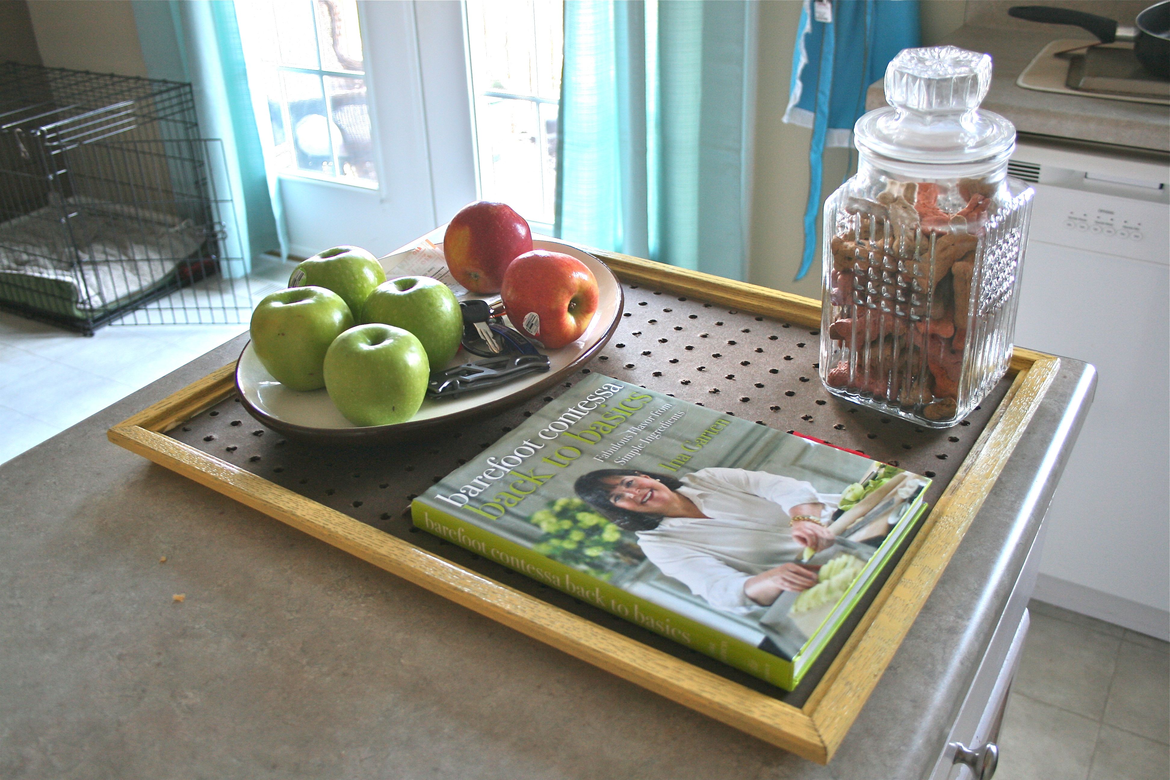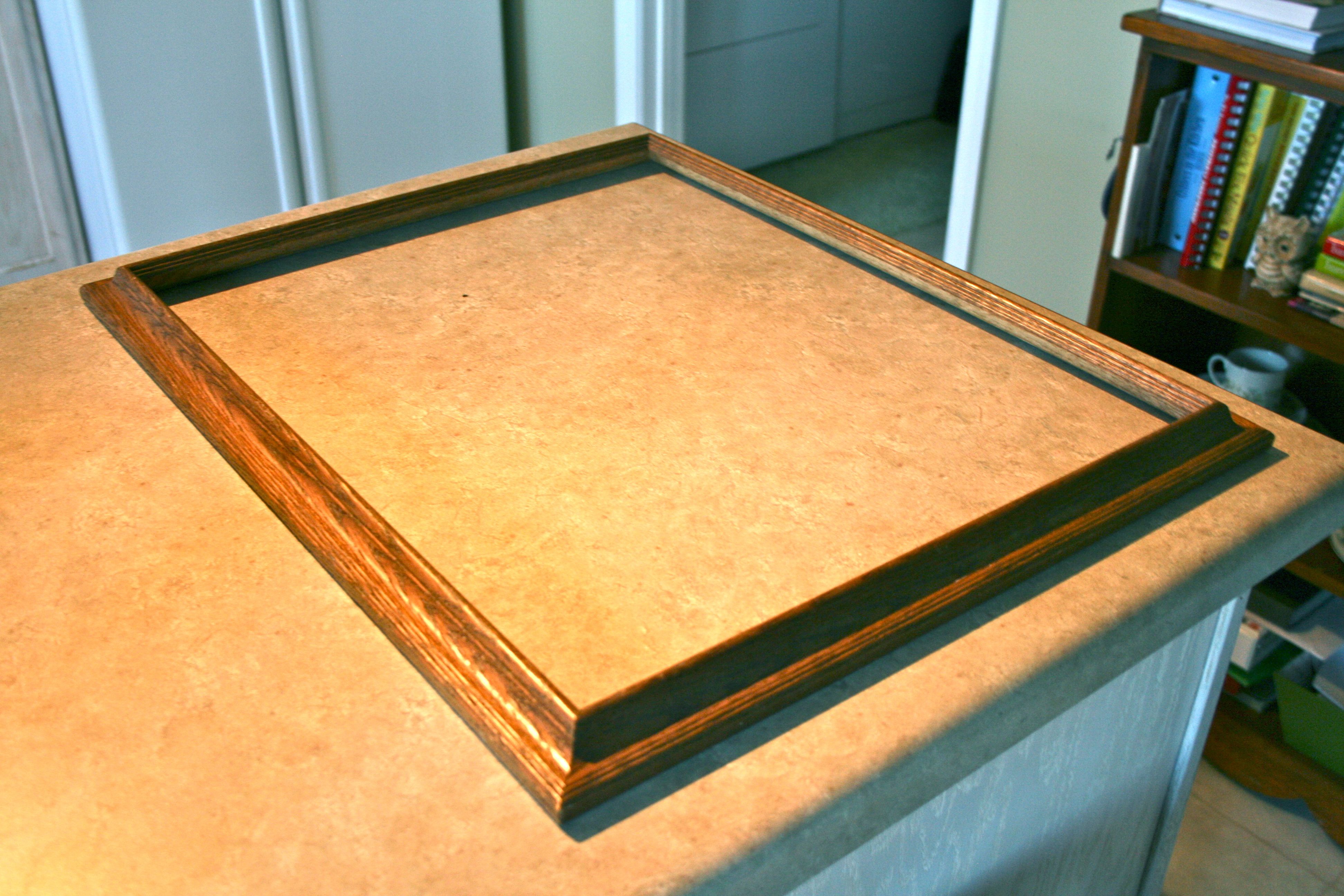 After letting the spray paint dry over night, I flipped the frame over and put a line of wood glue down all four sides of the frame’s inside lip. Then I gingerly laid the board on top and, being too lazy to trek downstairs for clamps, I proceeded to weigh it down with odds and ends from the kitchen: A cookbook, a platter of fruit and our new dog treat jar.