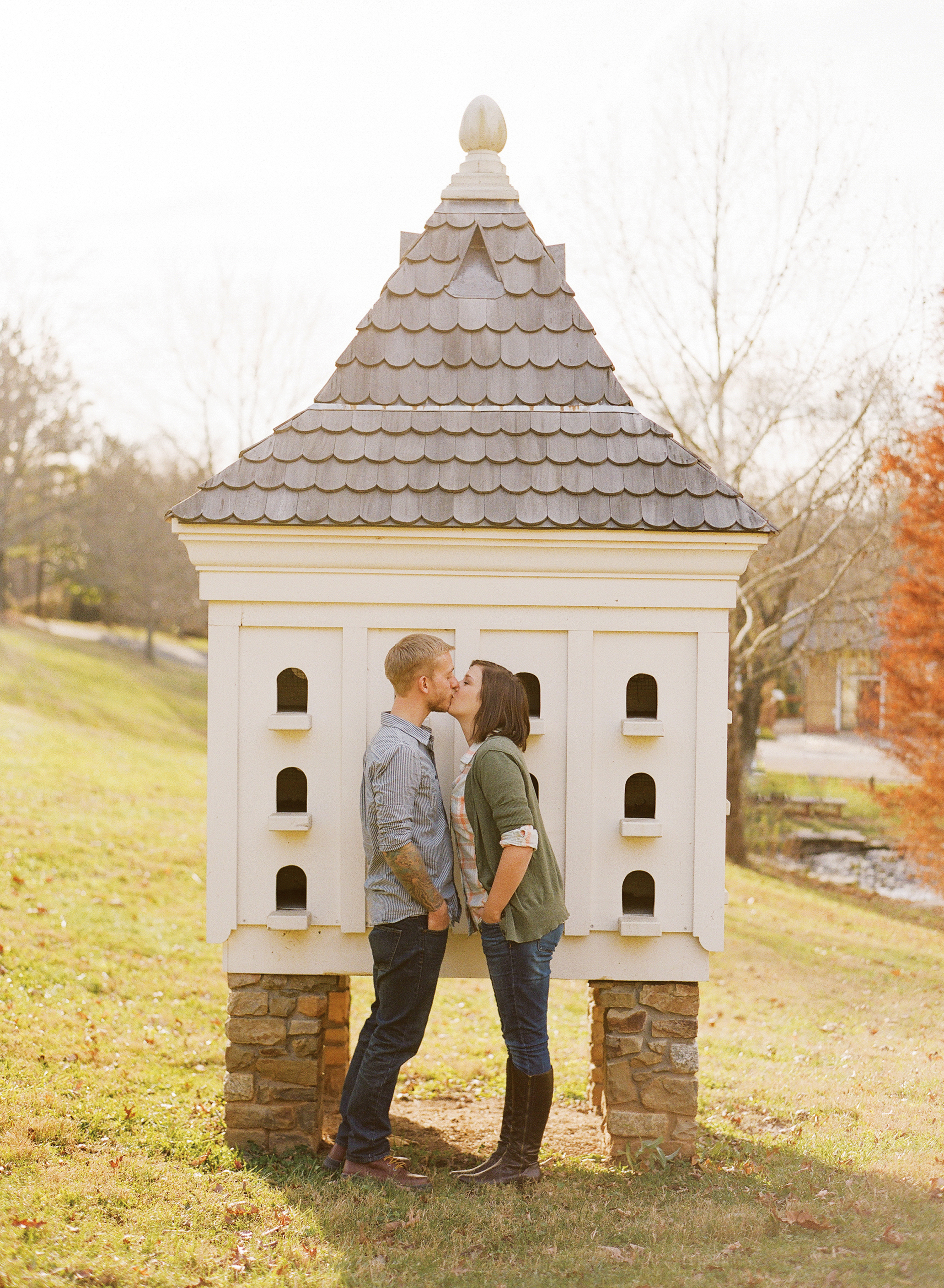 John really wanted to wait until November (he’s a cold weather type of guy) to take our photos and I eventually relented because…Well, because I love him! Although I was dreading the chilly temperature, it turned out to be a beautiful day. The first location was at our home where we got to show off our completely redesigned living room (more on those photos to come) and of course the other main man in my life, Rocky the dog. After that, we headed over to Old City Cemetery for the rest of the session. I know you must think we are crazy to take our engagement photos at a cemetery but this historic landmark is just stunning with its antique buildings, rolling hills, metal archways and hundred-year-old trees. We couldn’t have chosen a better location and the afternoon went by way too fast…