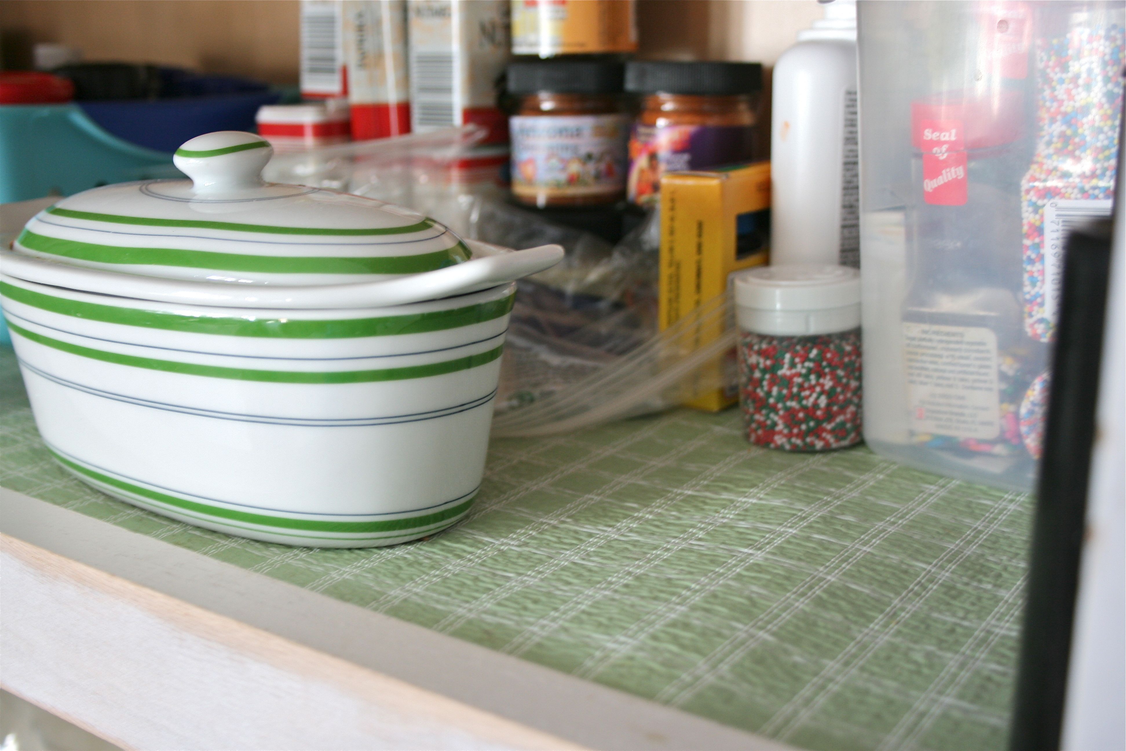 Oh and I mentioned getting the chance to put nice cabinet liner paper on the shelves since we had cleared them all off. Glad to have something waterproof, pretty and green to set things on now instead of a bare wooden shelf: