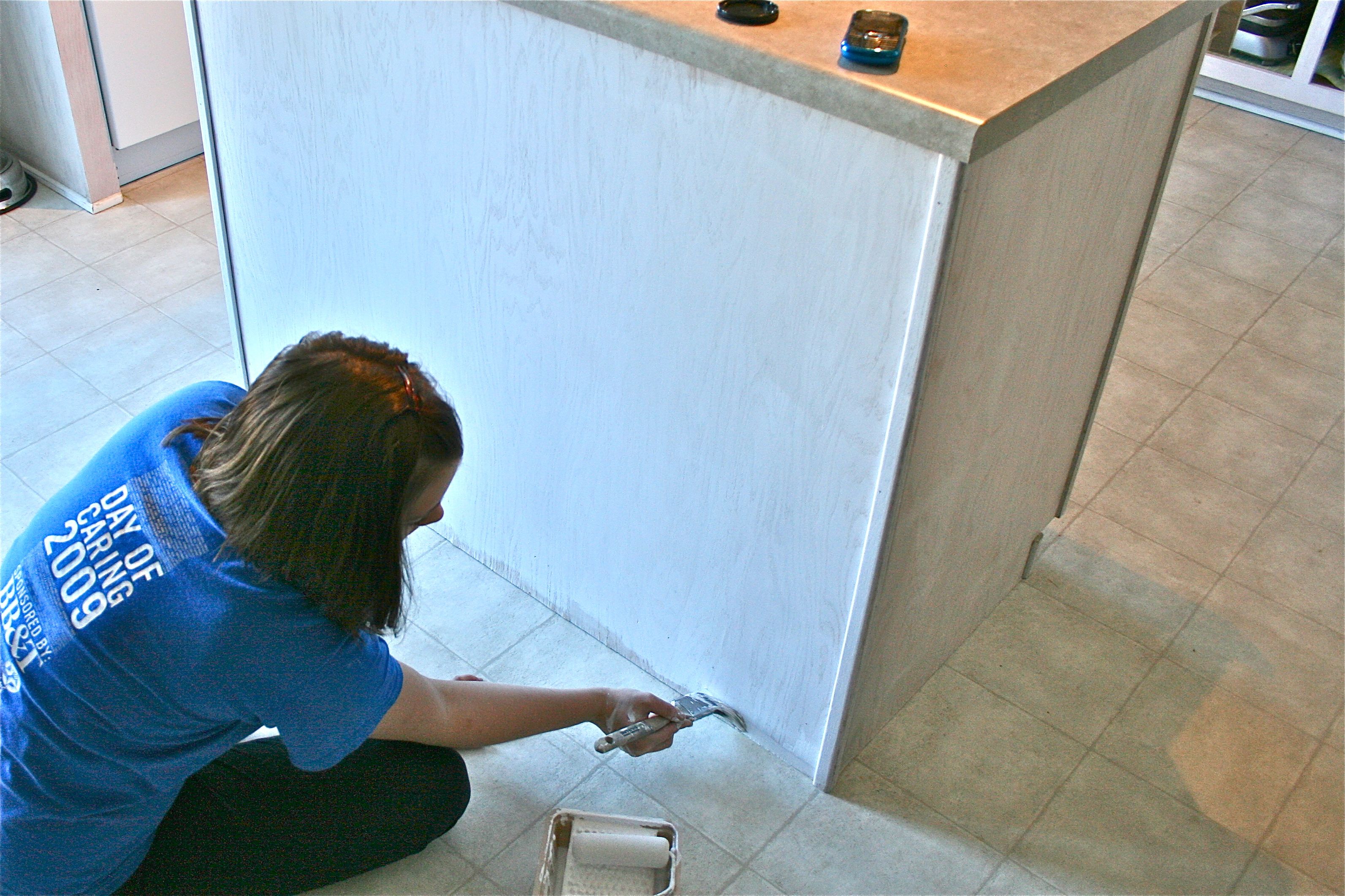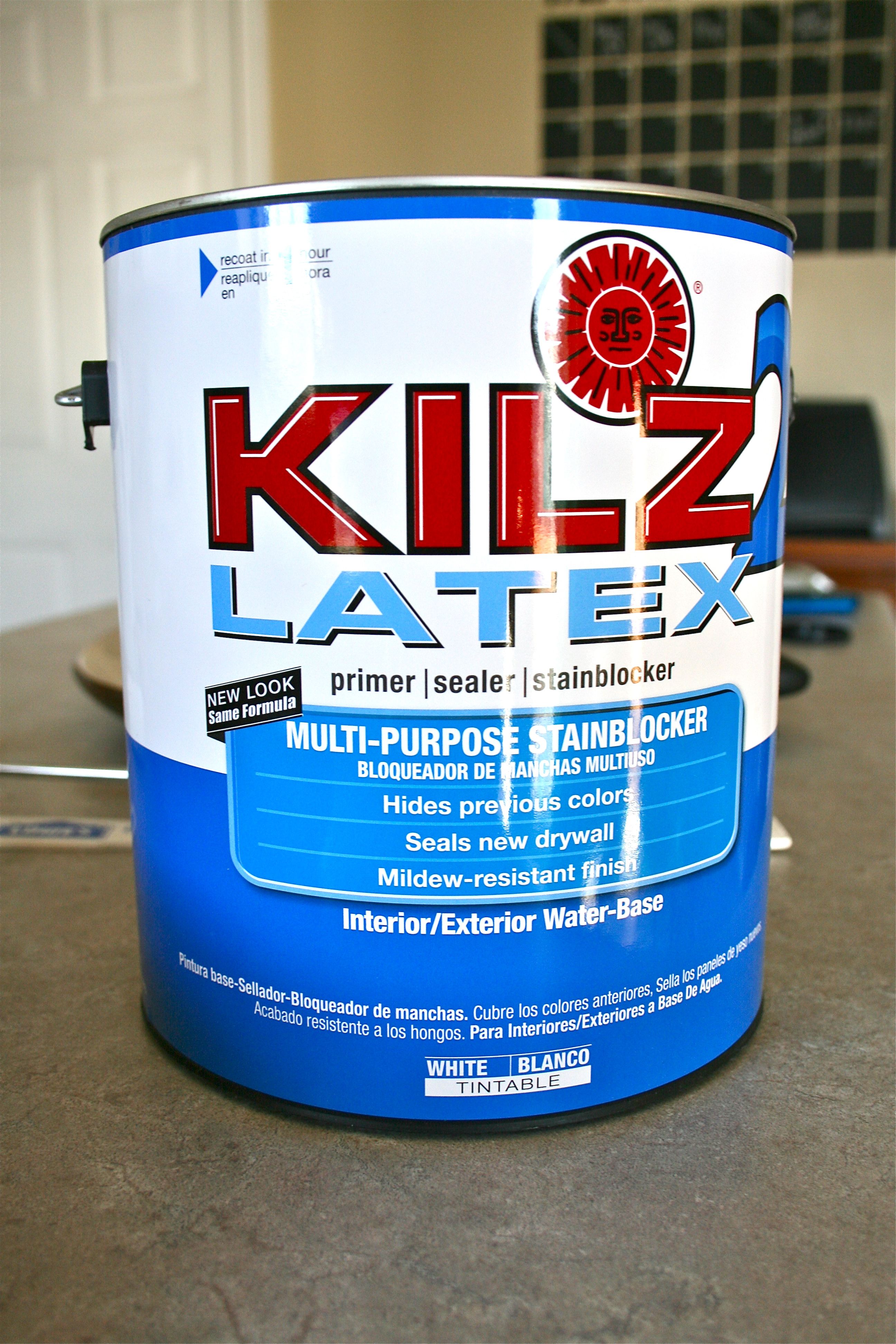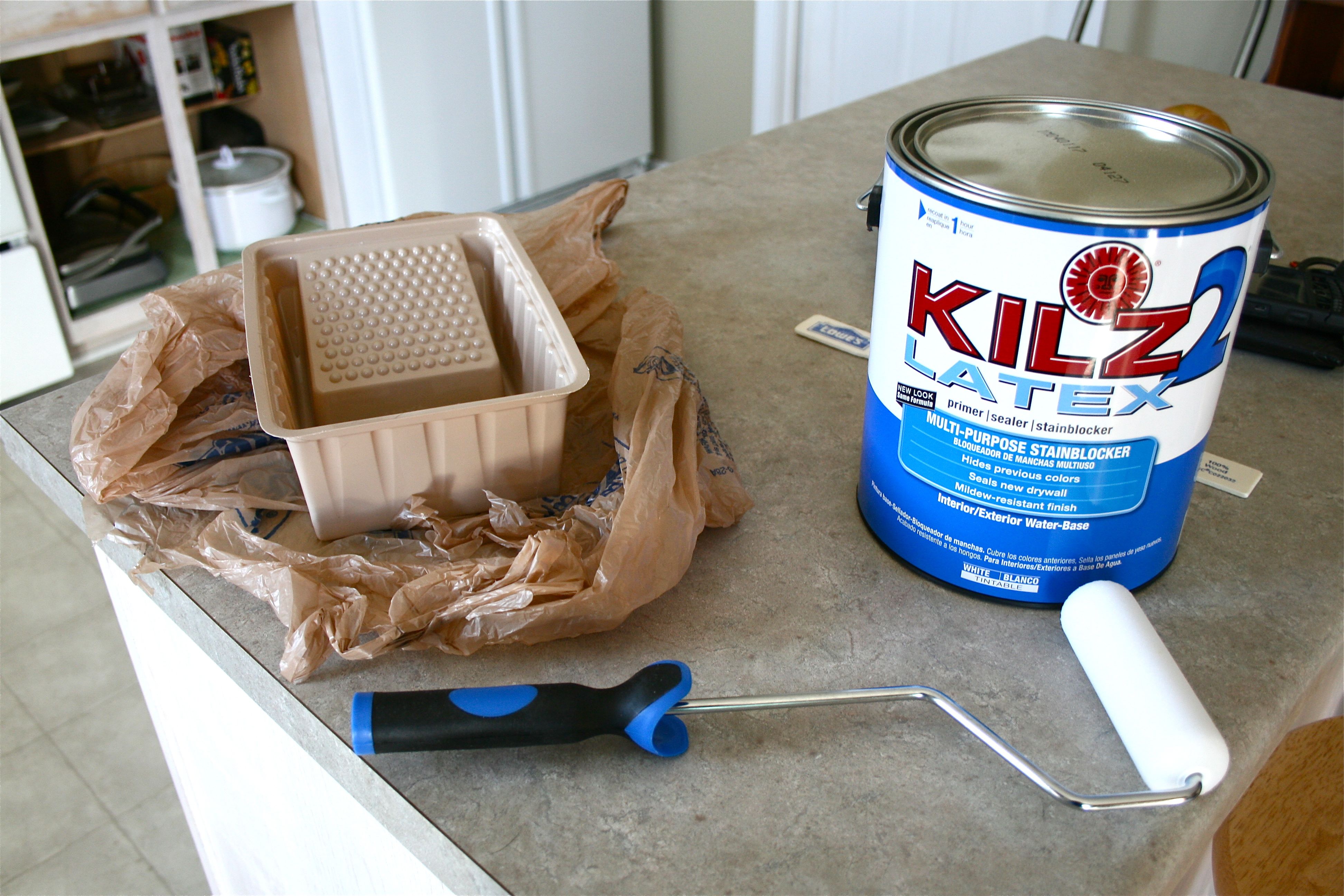 We ended up with two gallons of Kilz 2 Latex primer/sealer/stainblocker. I L-O-V-E that it’s water-based too since it made for a much easier cleanup (oil-based would have necessitated the purchase of turpentine – Yuck). Word of advice so you can learn from our mistake though – Unless you have a MASSIVE kitchen, you probably won’t need two gallons of primer. It helps that you only need to paint on one coat of the stuff, but we barely put a dent in even one gallon. So if you are tackling a medium-sized kitchen like ours, I’d say just grab one can.