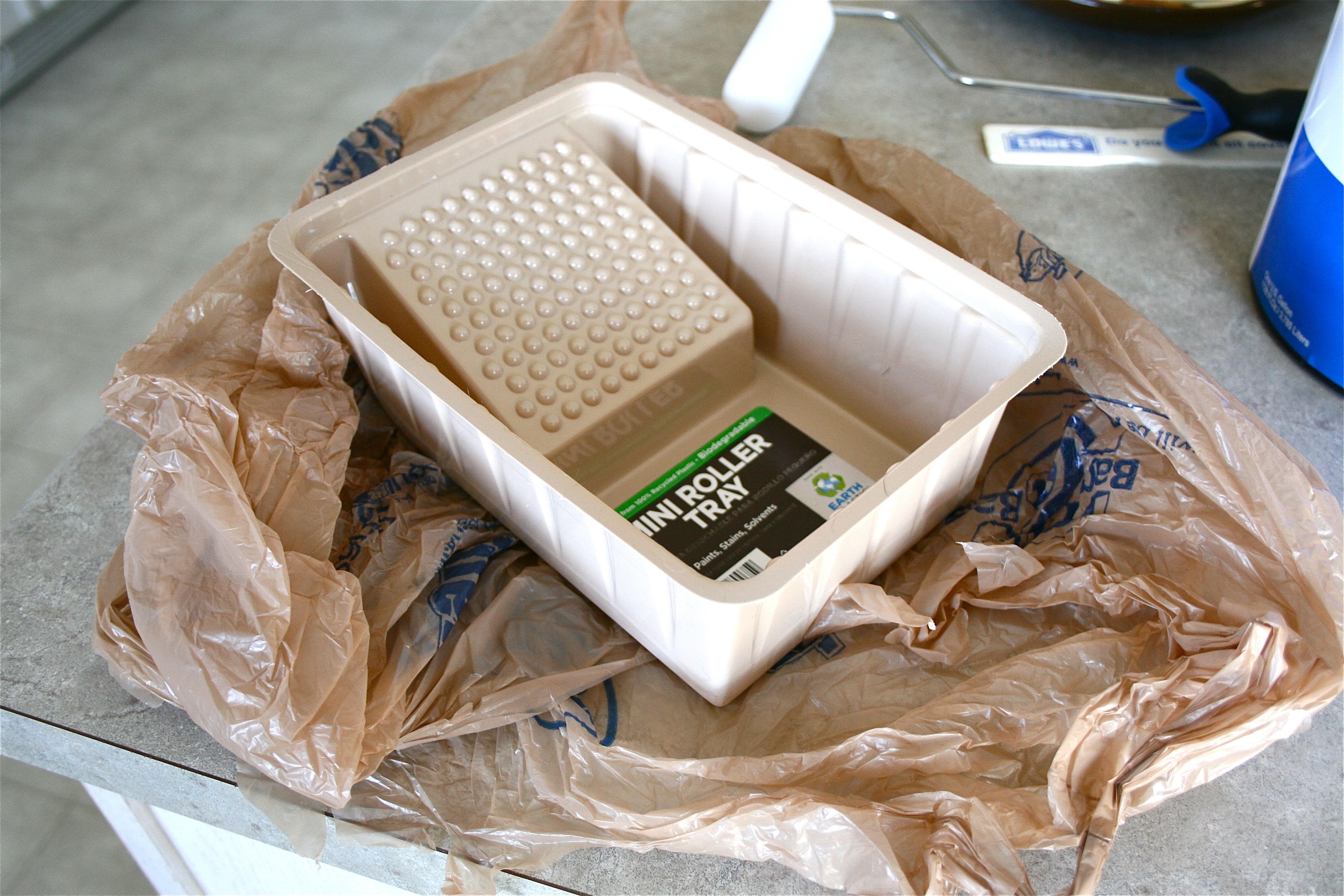 We also bought a few disposable paint trays and one brand new four-inch roller. You’ll also need an angled paint brush in order to get into all the tight spots and grooves, but we had a few at home so we didn’t get a new one while at the store. Although, another word of advice, if you decide to do this project you’re going to use that angled brush A LOT. I wish I had bought a new one while we were at Lowe’s because the one we had at home is now looking pretty worn out and we still have two topcoats to go on the frame and the front of the cabinet doors.