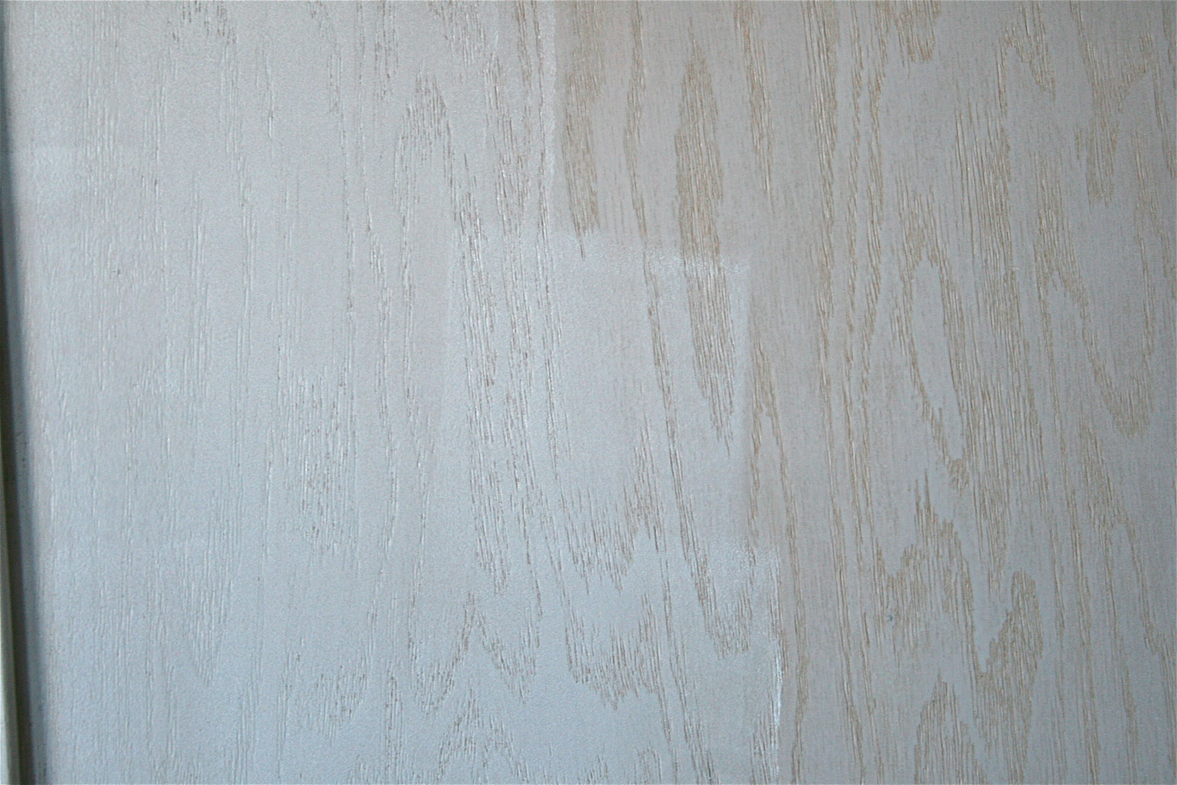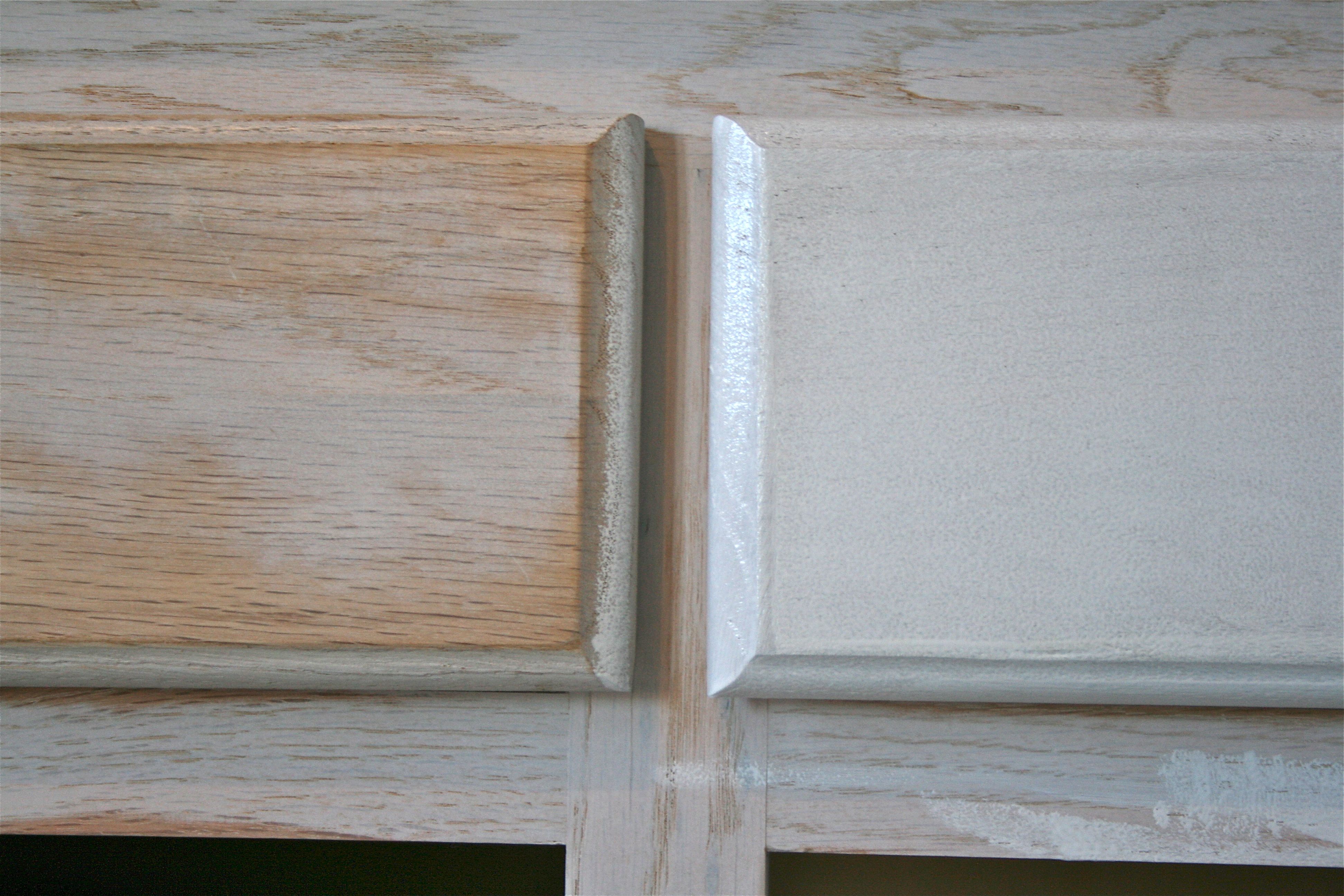 I’m sure you can see this, but the drawer on the right has been primed, whereas the one on the left has not. It really just evened out the tone of the wood now exposed by the work of John and his sander. Here’s a closeup of the difference: